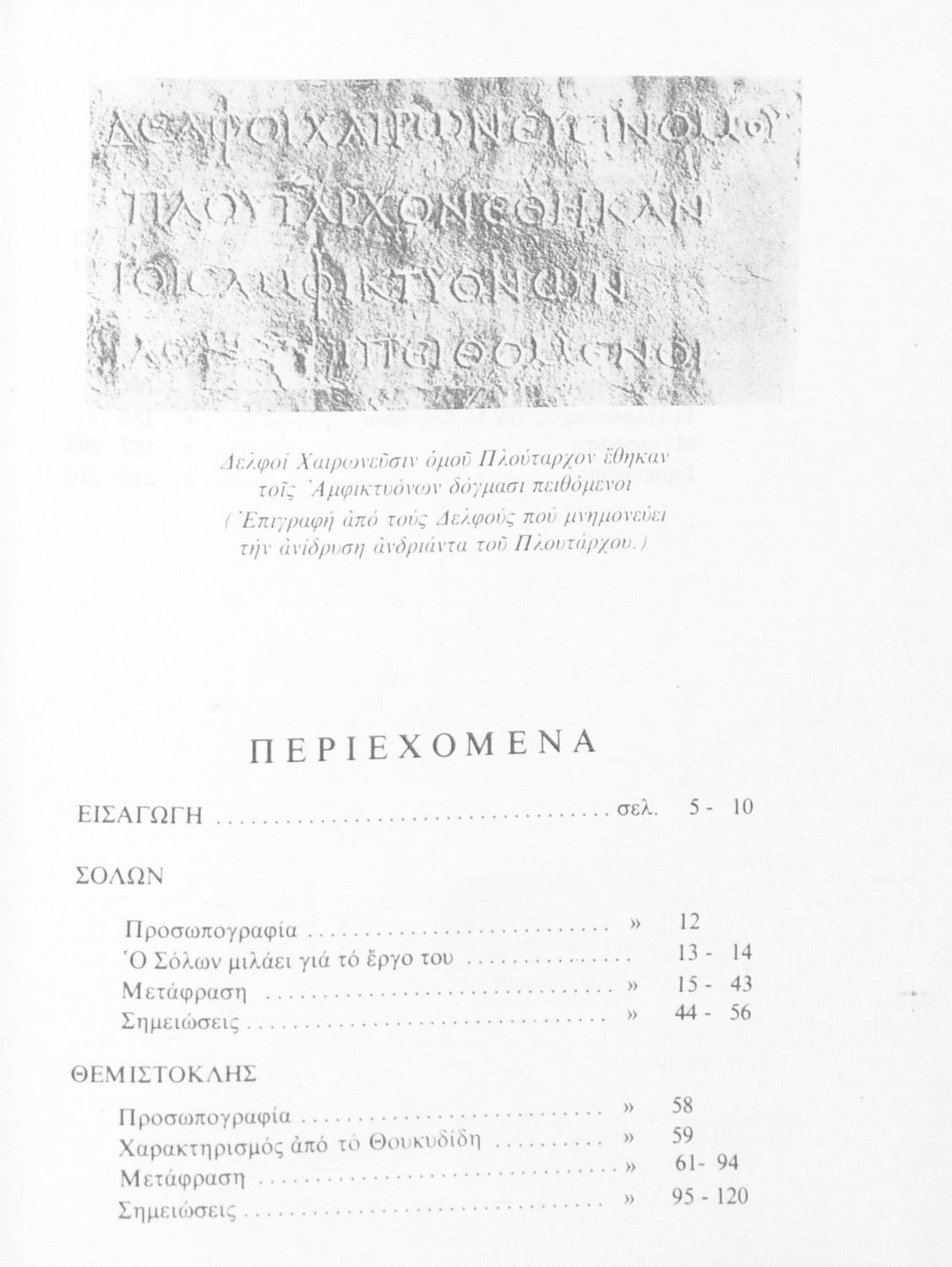 Σχολικό εγχειρίδιο Αρχαίων Ελληνικών της Β' Γυμνασίου. Το βιβλίο περιλαμβάνει τέσσερις από τους “Βίους” του Πλούταρχου: του Σόλωνα, του Θεμιστοκλή, του Περικλή και του Φωκίωνα