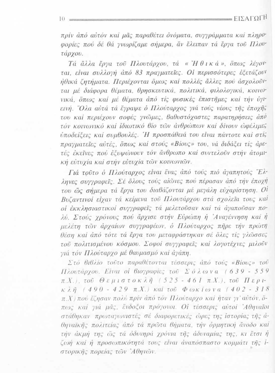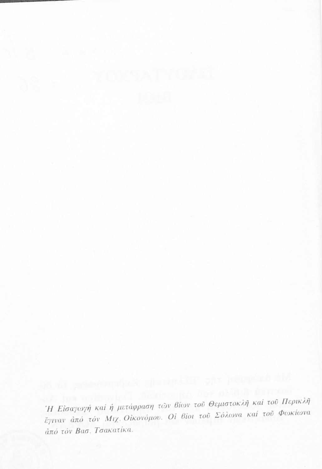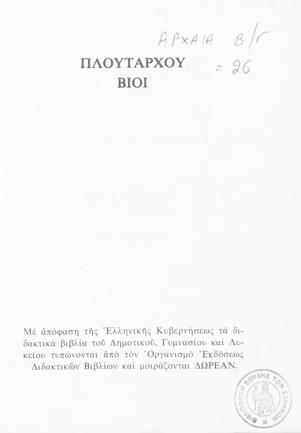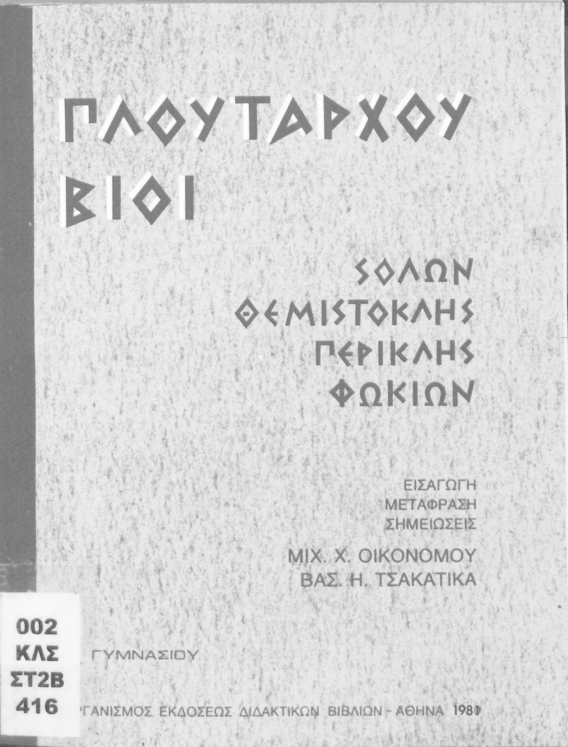 Σχολικό εγχειρίδιο Αρχαίων Ελληνικών της Β' Γυμνασίου. Το βιβλίο περιλαμβάνει τέσσερις από τους “Βίους” του Πλούταρχου: του Σόλωνα, του Θεμιστοκλή, του Περικλή και του Φωκίωνα