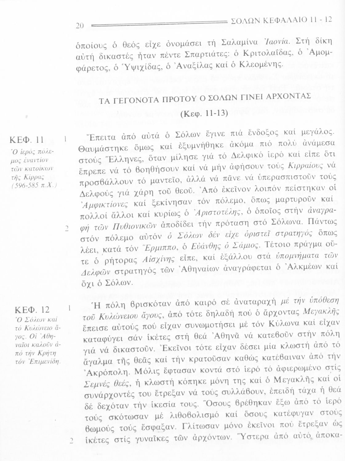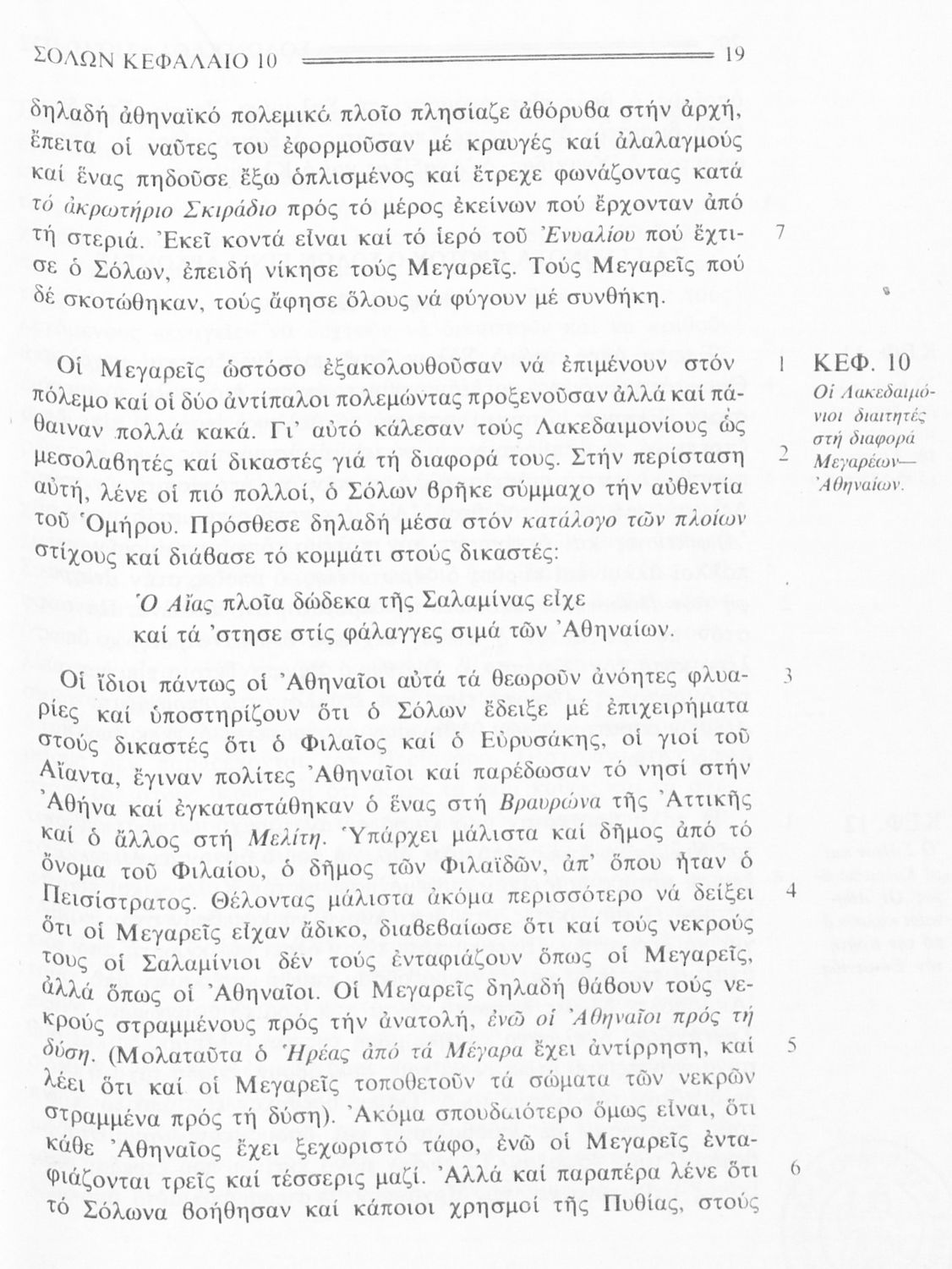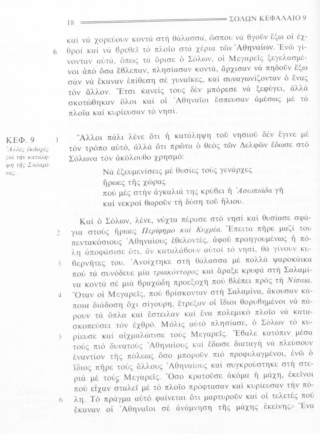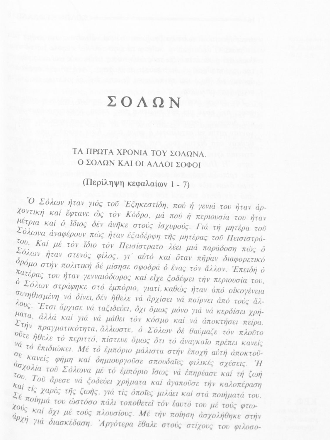 Σχολικό εγχειρίδιο Αρχαίων Ελληνικών. Αρχικά ένα εισαγωγικό σημείωμα αναφέρεται στη ζωή και το έργο του Πλουτάρχου. Ακολουθούν από το έργο του "Παράλληλοι Βίοι", σε μετάφραση, οι βιογραφίες του Σόλωνα, του ...