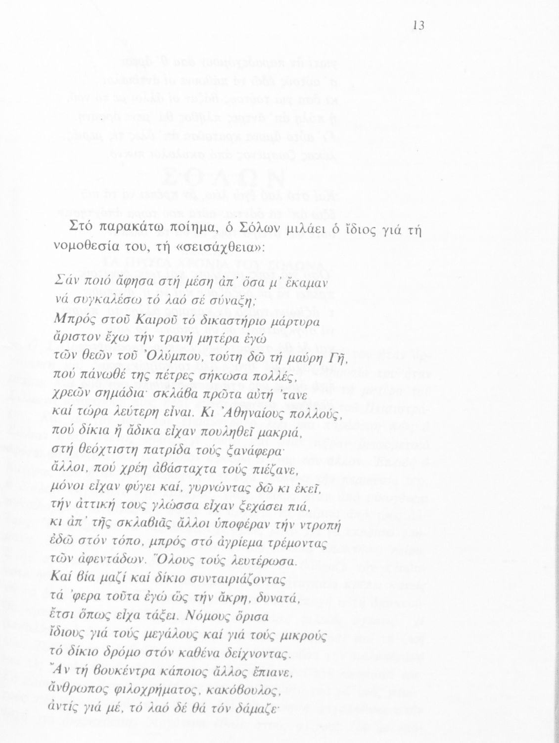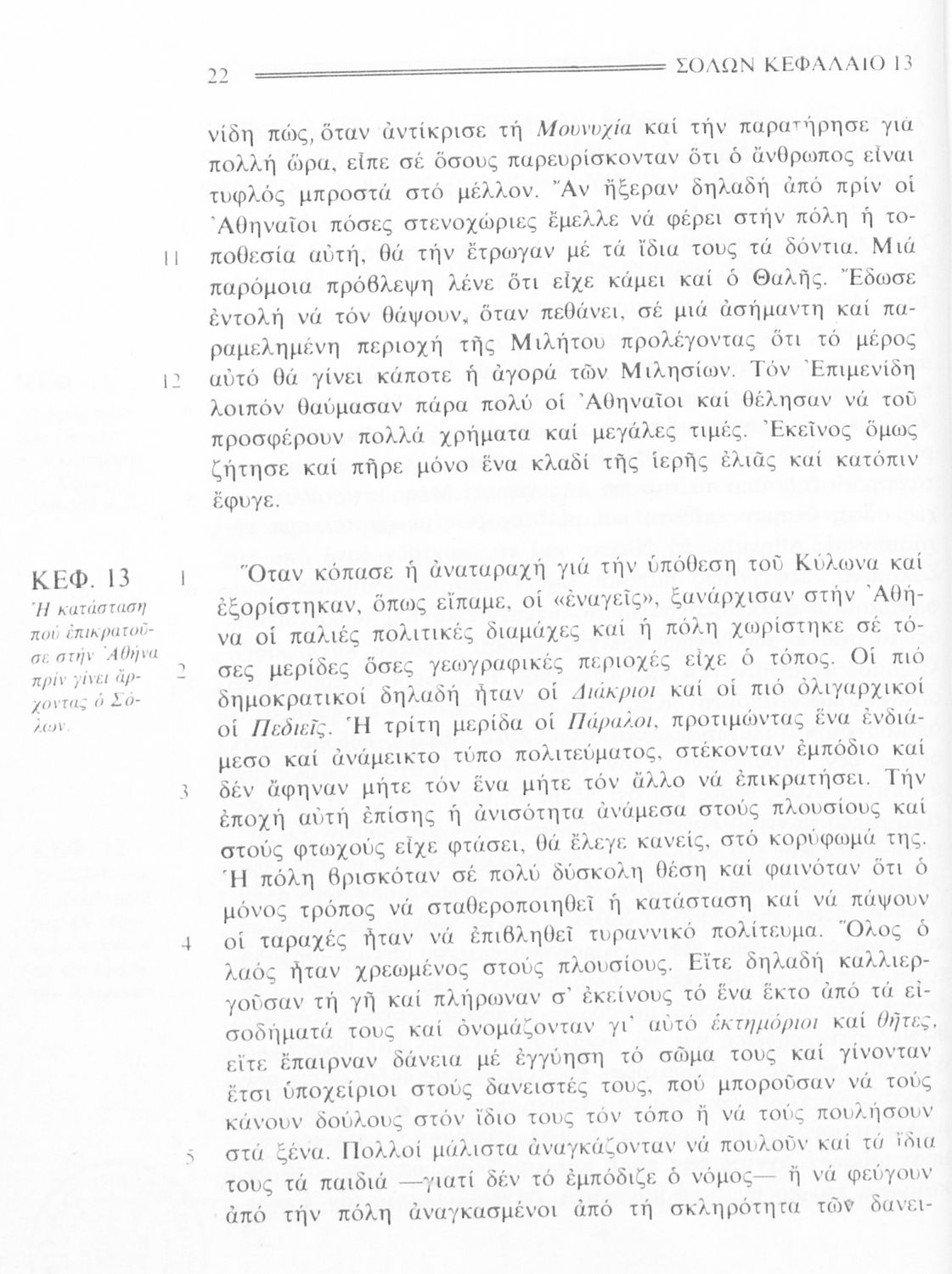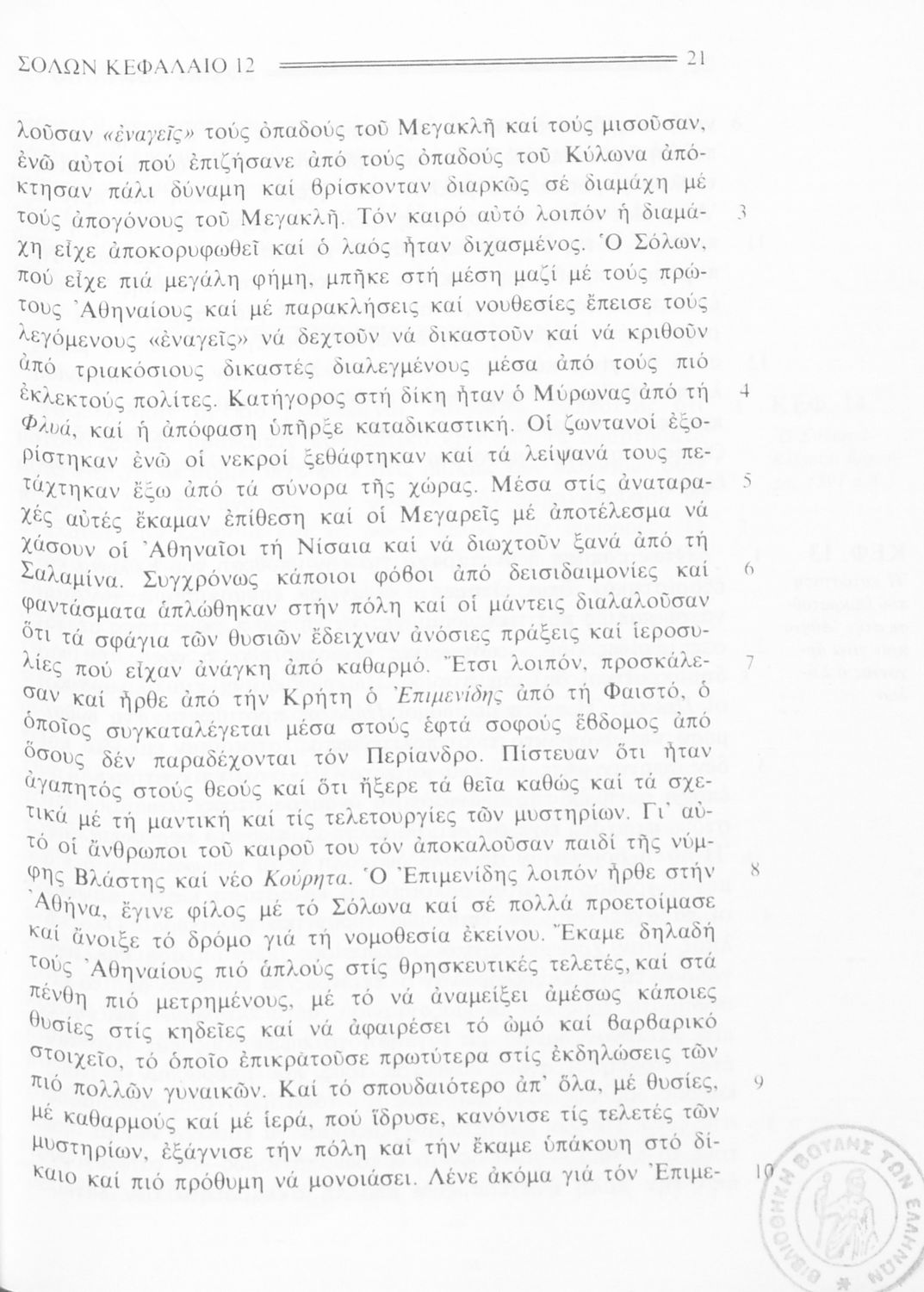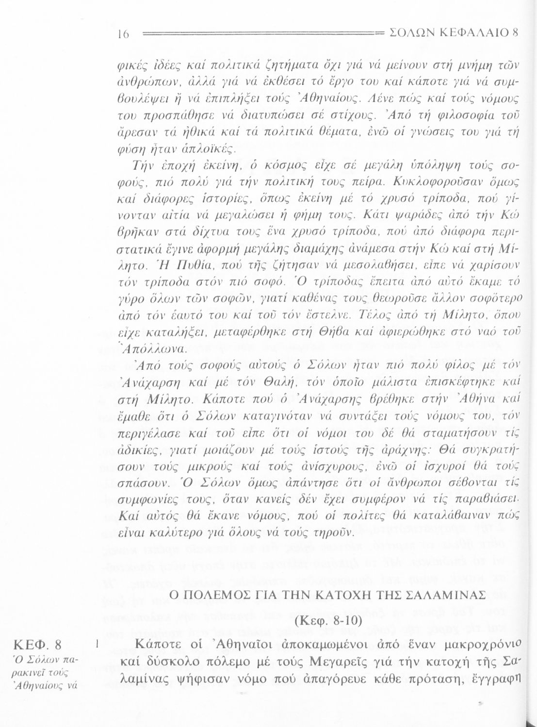 Σχολικό εγχειρίδιο Αρχαίων Ελληνικών. Αρχικά ένα εισαγωγικό σημείωμα αναφέρεται στη ζωή και το έργο του Πλουτάρχου. Ακολουθούν από το έργο του "Παράλληλοι Βίοι", σε μετάφραση, οι βιογραφίες του Σόλωνα, του ...