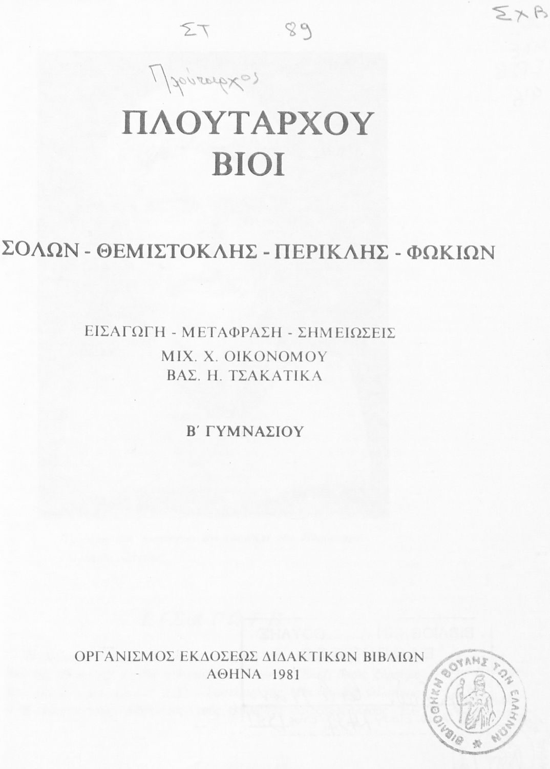 Σχολικό εγχειρίδιο Αρχαίων Ελληνικών της Β΄ Γυμνασίου το οποίο περιέχει το έργο του Πλούταρχου 'Βίοι' όπου παρουσιάζει τους βίους επιφανών ανδρών της αρχαιότητας του Σόλωνα, του Θεμιστοκλή, του Περικλή και του
