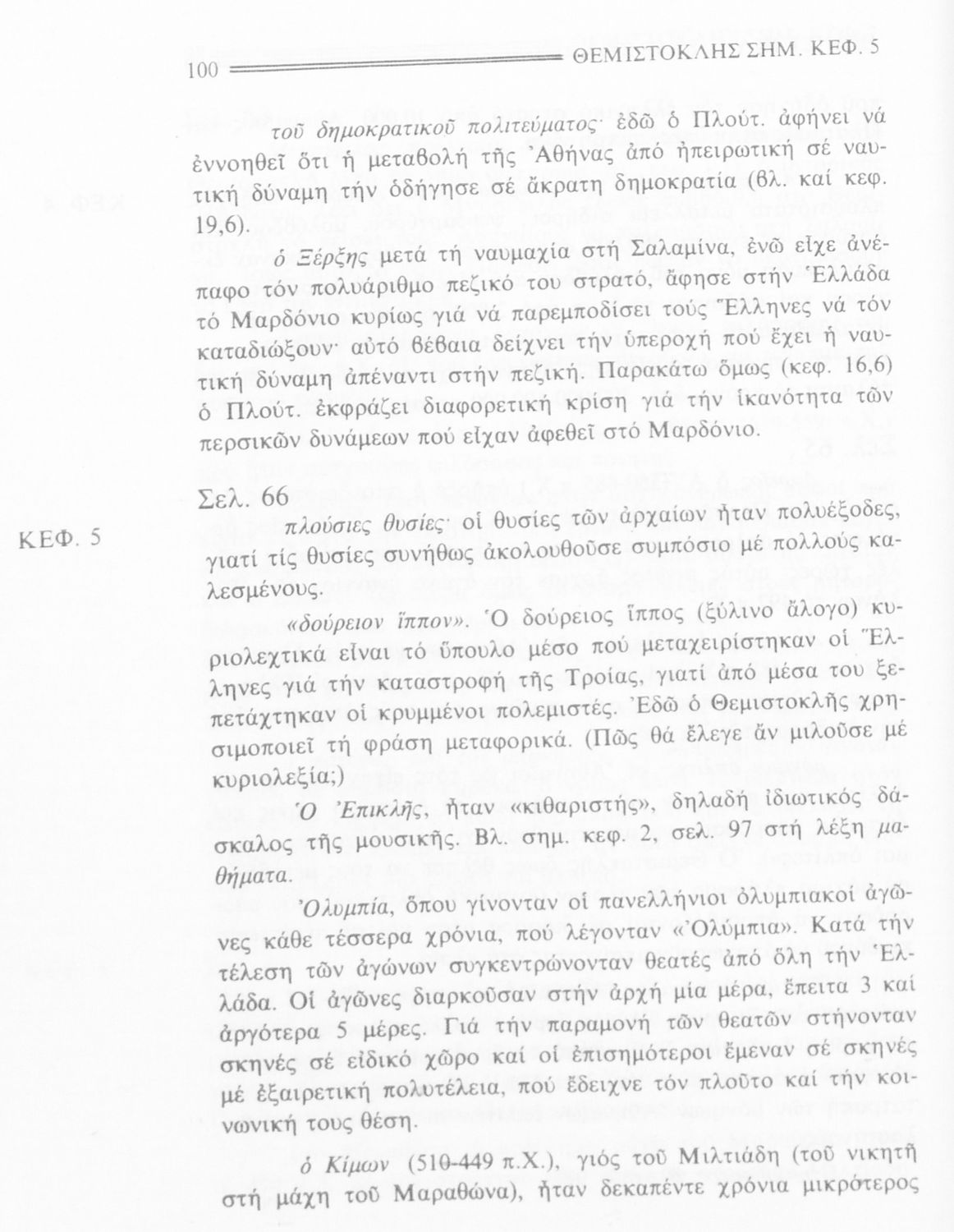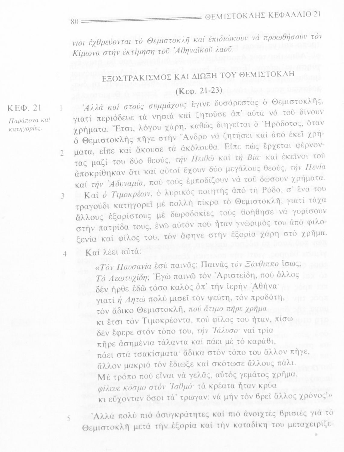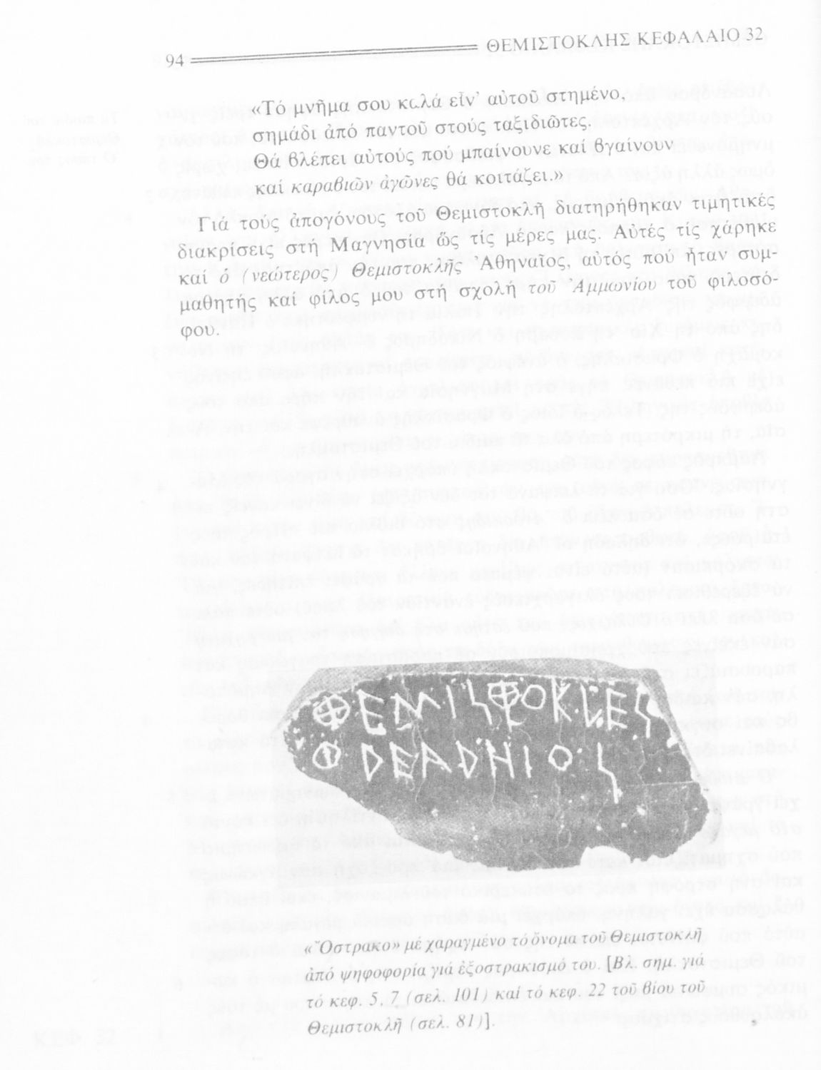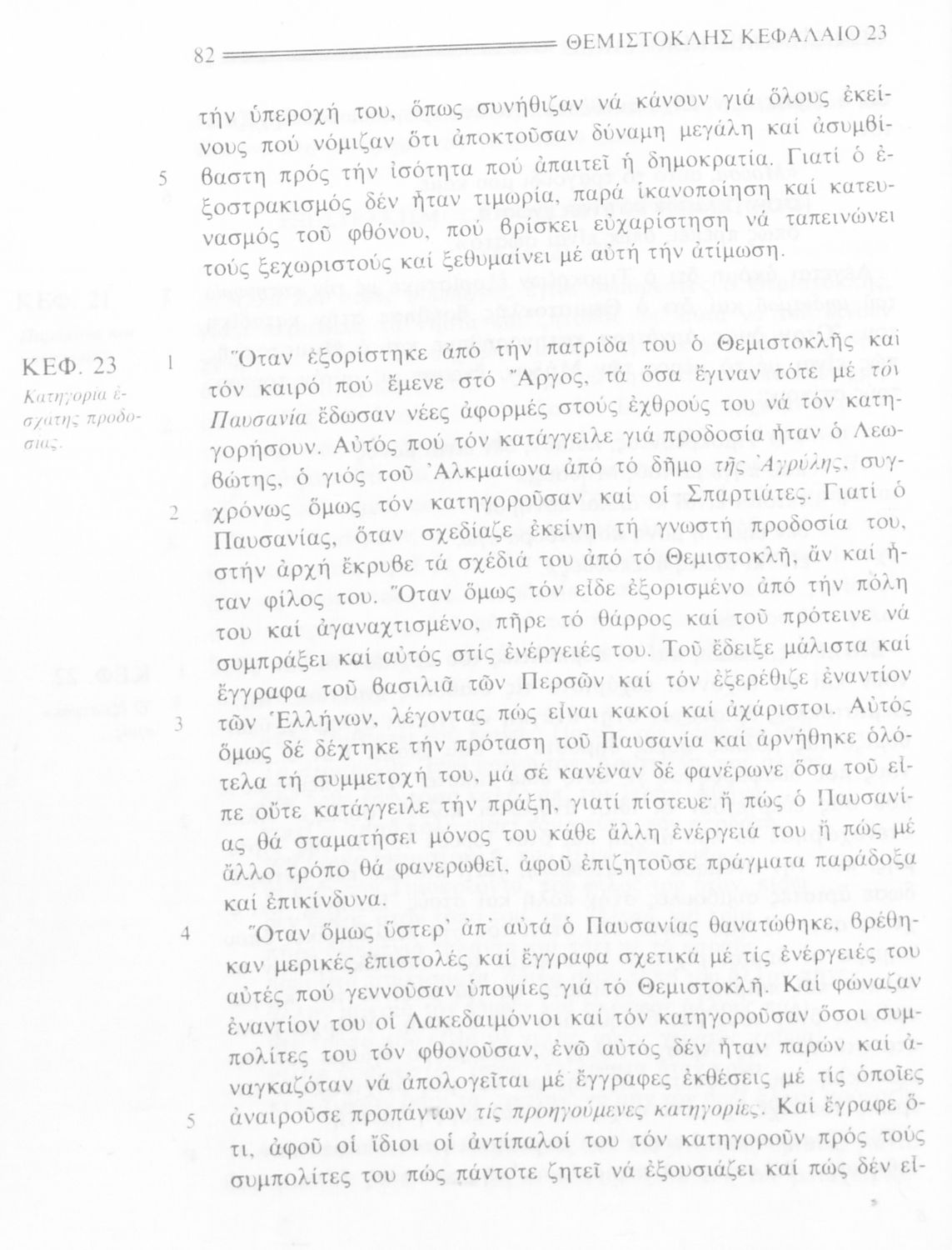 Σχολικό εγχειρίδιο Αρχαίων Ελληνικών Β΄ Γυμνασίου που περιέχει μετάφραση του έργο του Πλούταρχου Θεμιστοκλής και Περικλής, εισαγωγή και ερμηνευτικά σχόλια.