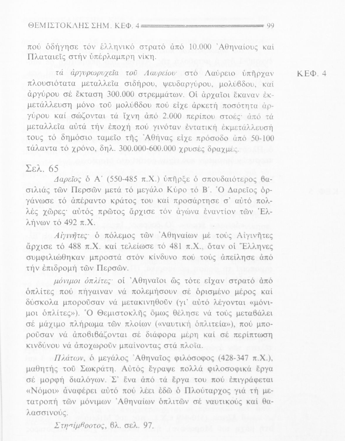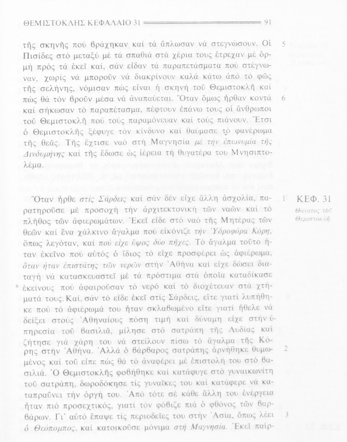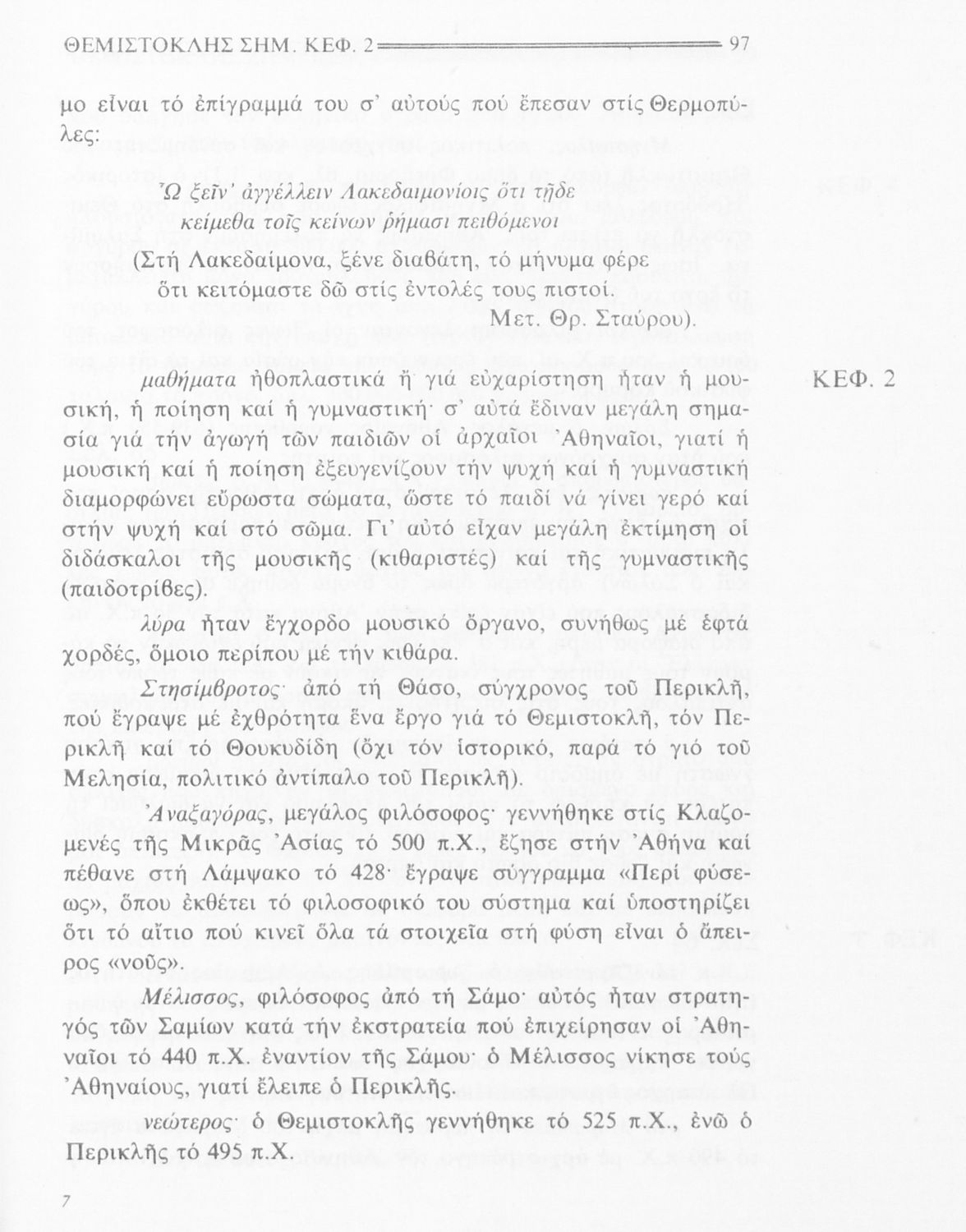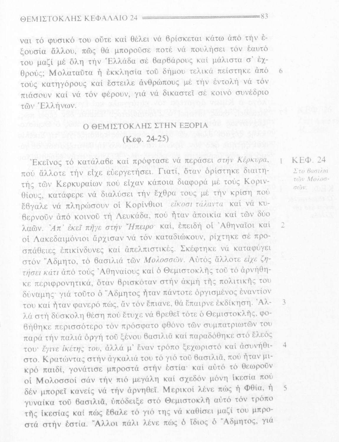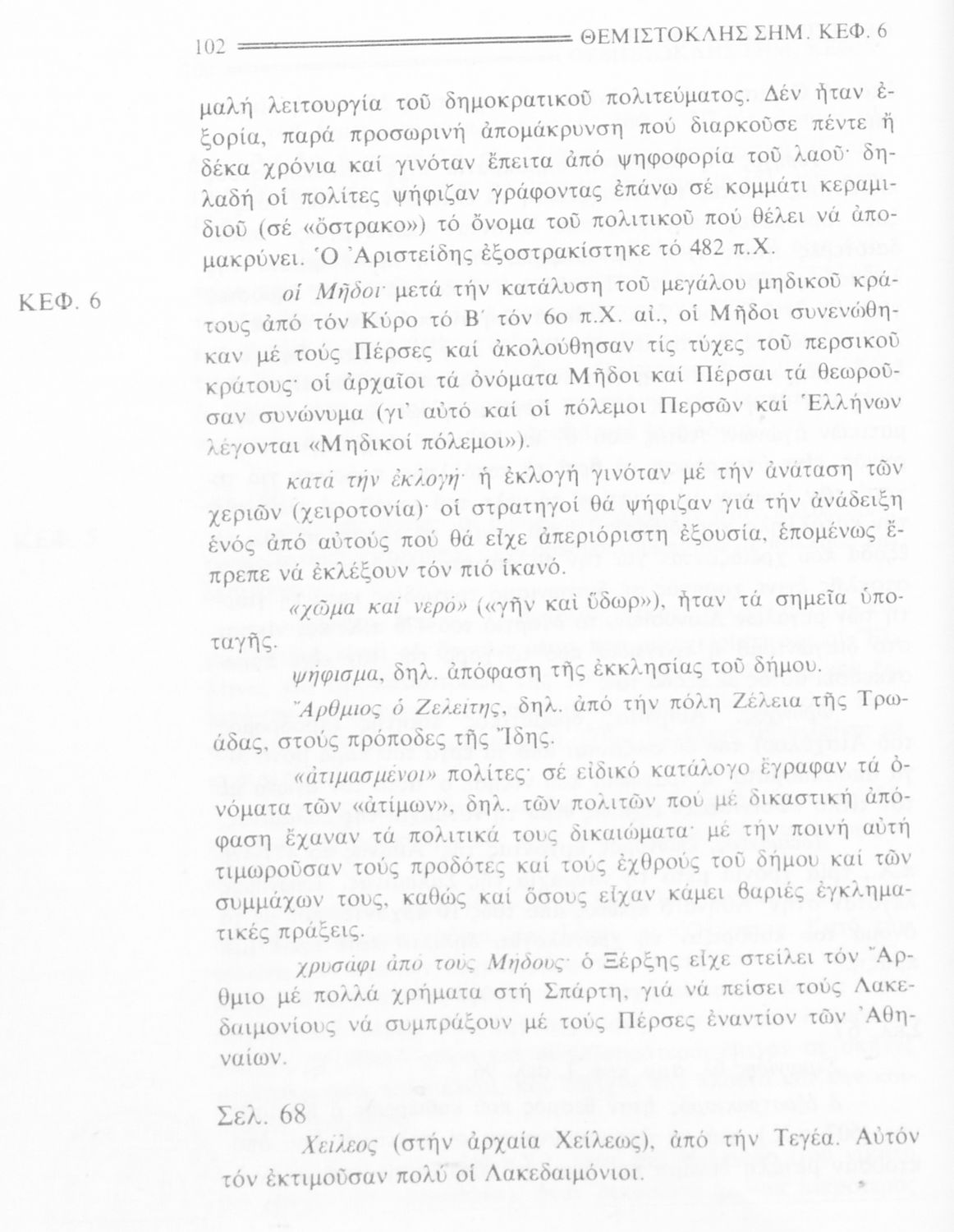Σχολικό εγχειρίδιο Αρχαίων Ελληνικών Β΄ Γυμνασίου που περιέχει μετάφραση του έργο του Πλούταρχου Θεμιστοκλής και Περικλής, εισαγωγή και ερμηνευτικά σχόλια.