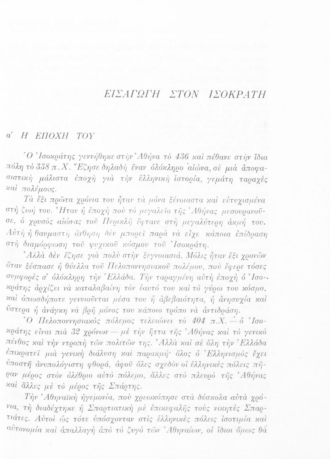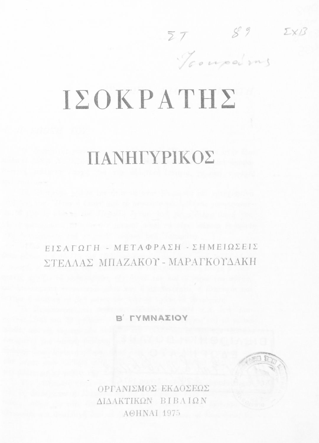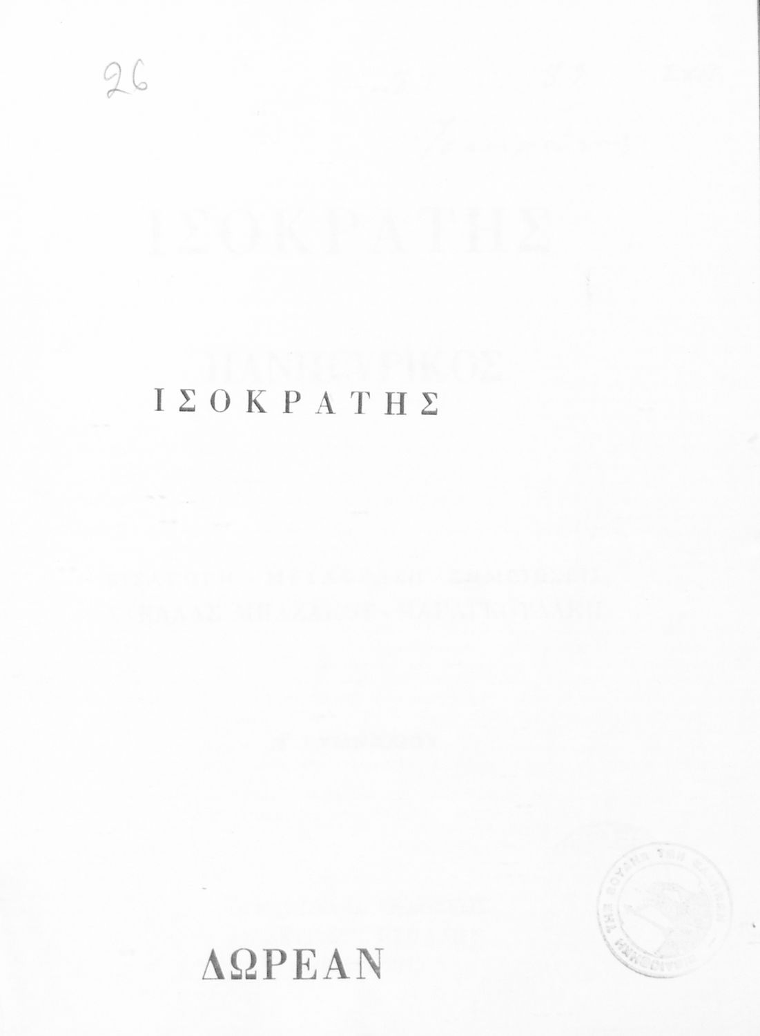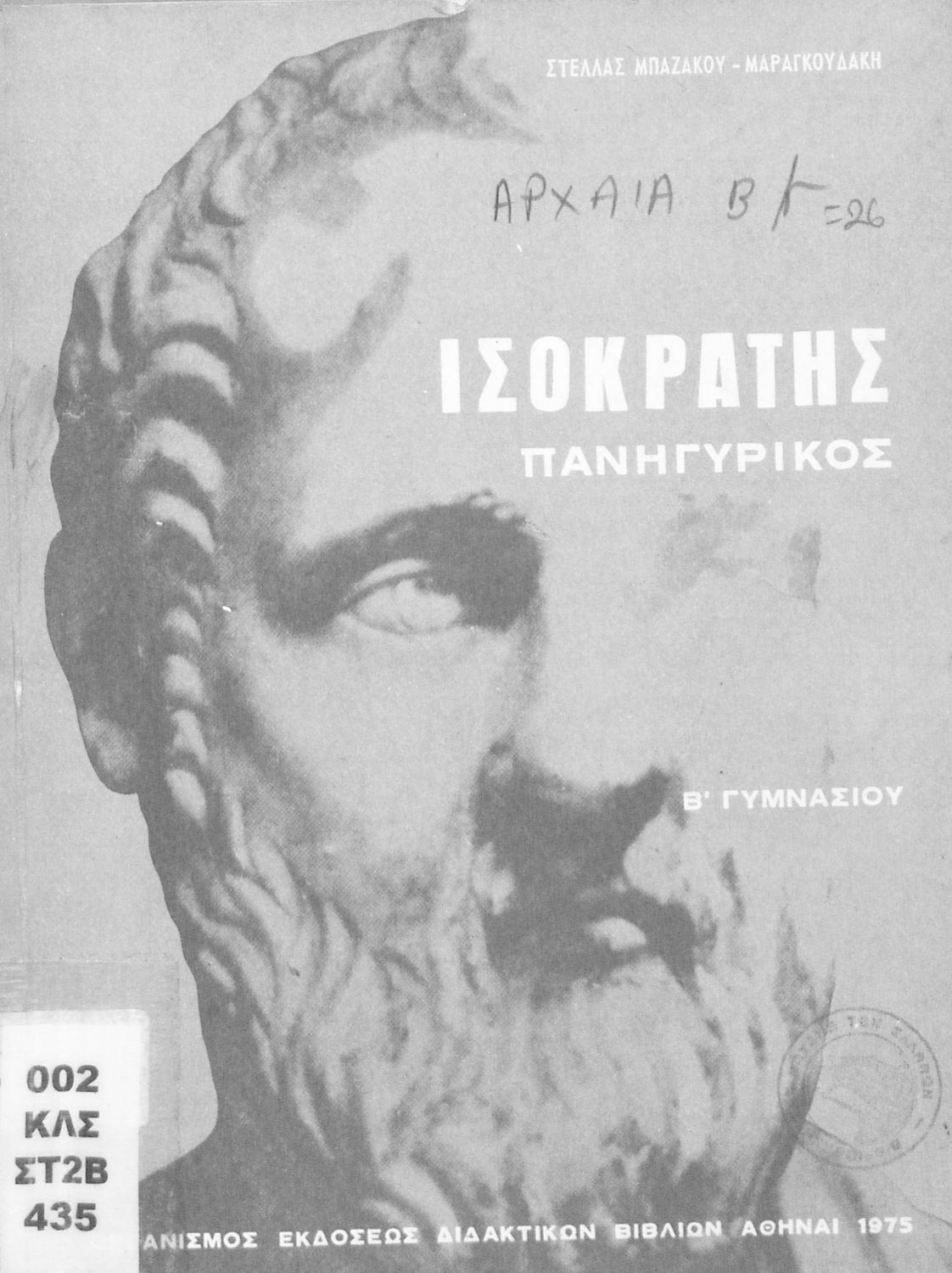 Σχολικό εγχειρίδιο Αρχαίων Ελληνικών Δ΄ Γυμνασίου που περιλαμβάνει εισαγωγή στη ζωή και το έργο του Ισοκράτη, τον Πανηγυρικό, μετάφραση και ερμηνευτικές σημειώσεις.