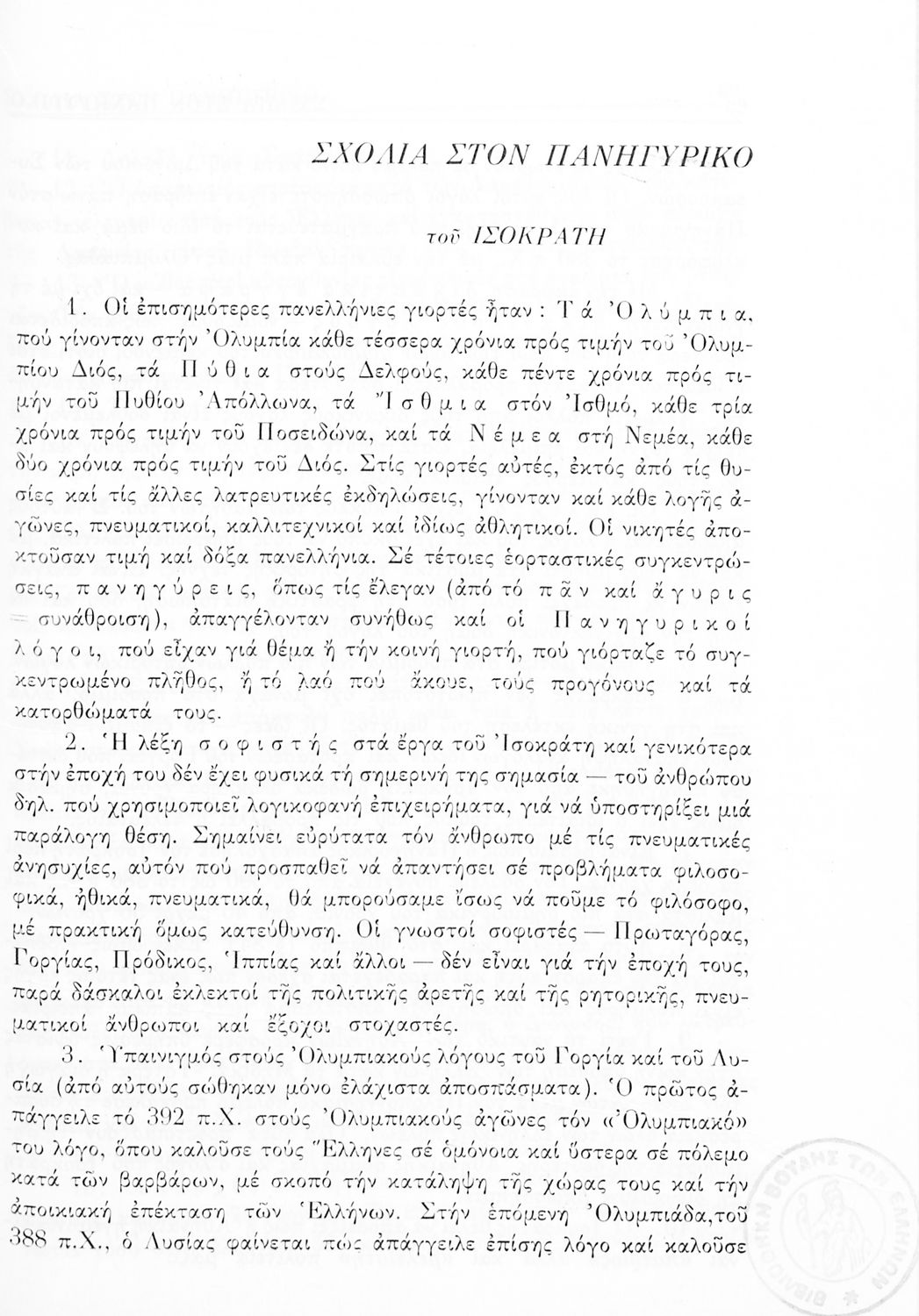 Σχολικό εγχειρίδιο Αρχαίων Ελληνικών Β΄ Γυμνασίου που περιλαμβάνει εισαγωγή στη ζωή και το έργο του Ισοκράτη, τον Πανηγυρικό, μετάφραση και ερμηνευτικές σημειώσεις.