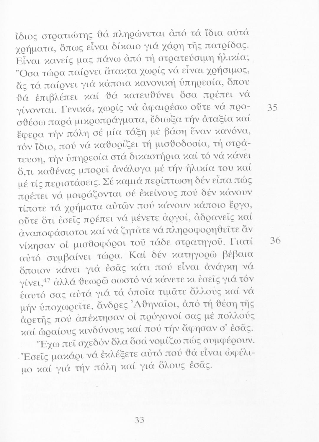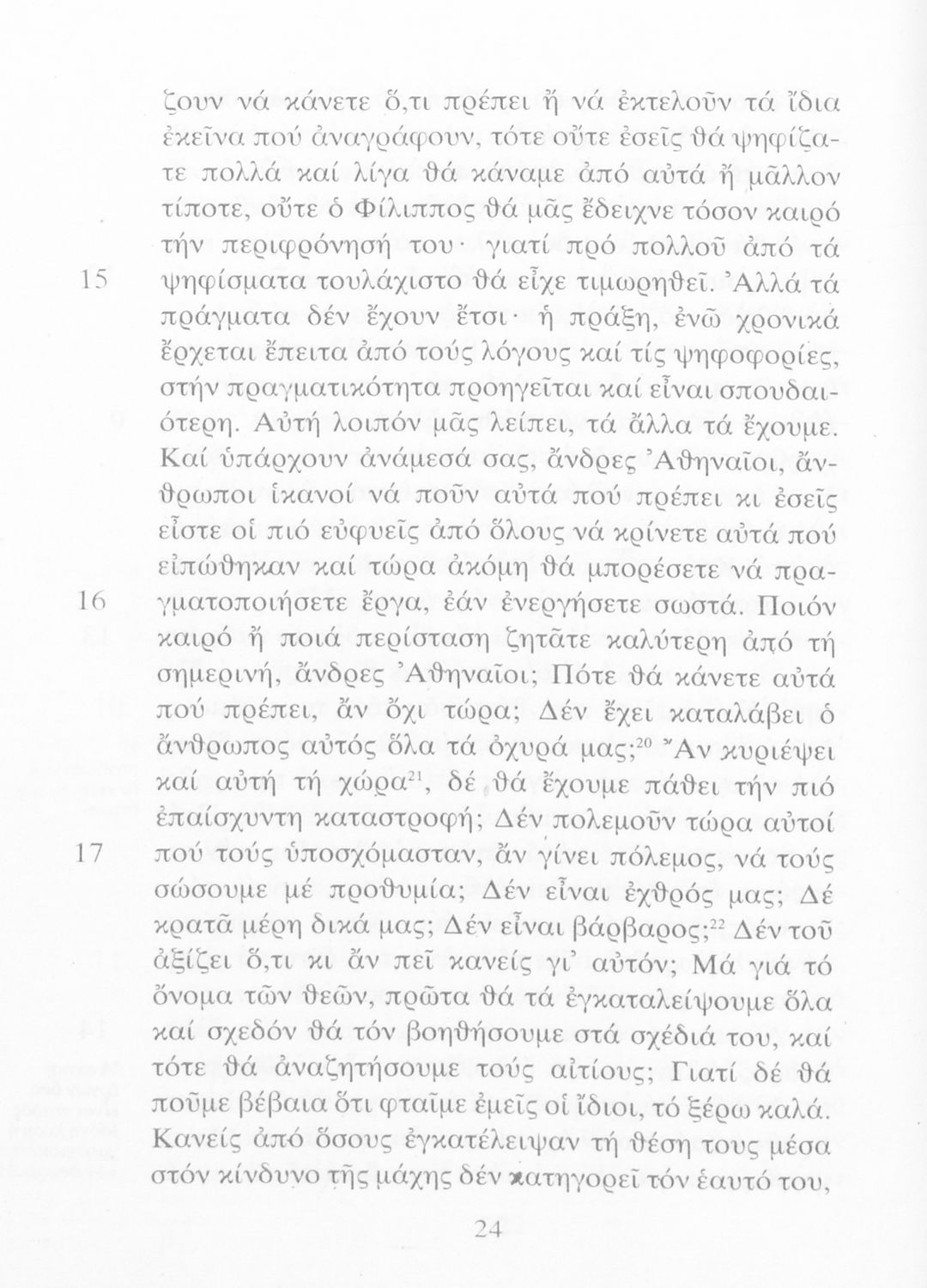 Σχολικό εγχειρίδιο Αρχαίων Ελληνικών Γ΄ Γυμνασίου περιλαμβάνει εισαγωγή στη ζωή και το έργο του Δημοσθένη, τους Λόγους του Γ΄ Ολυνθιακός και Υπέρ της ελευθερίας των Ροδίων σε μετάφραση και ερμηνευτικές σημειώσεις.