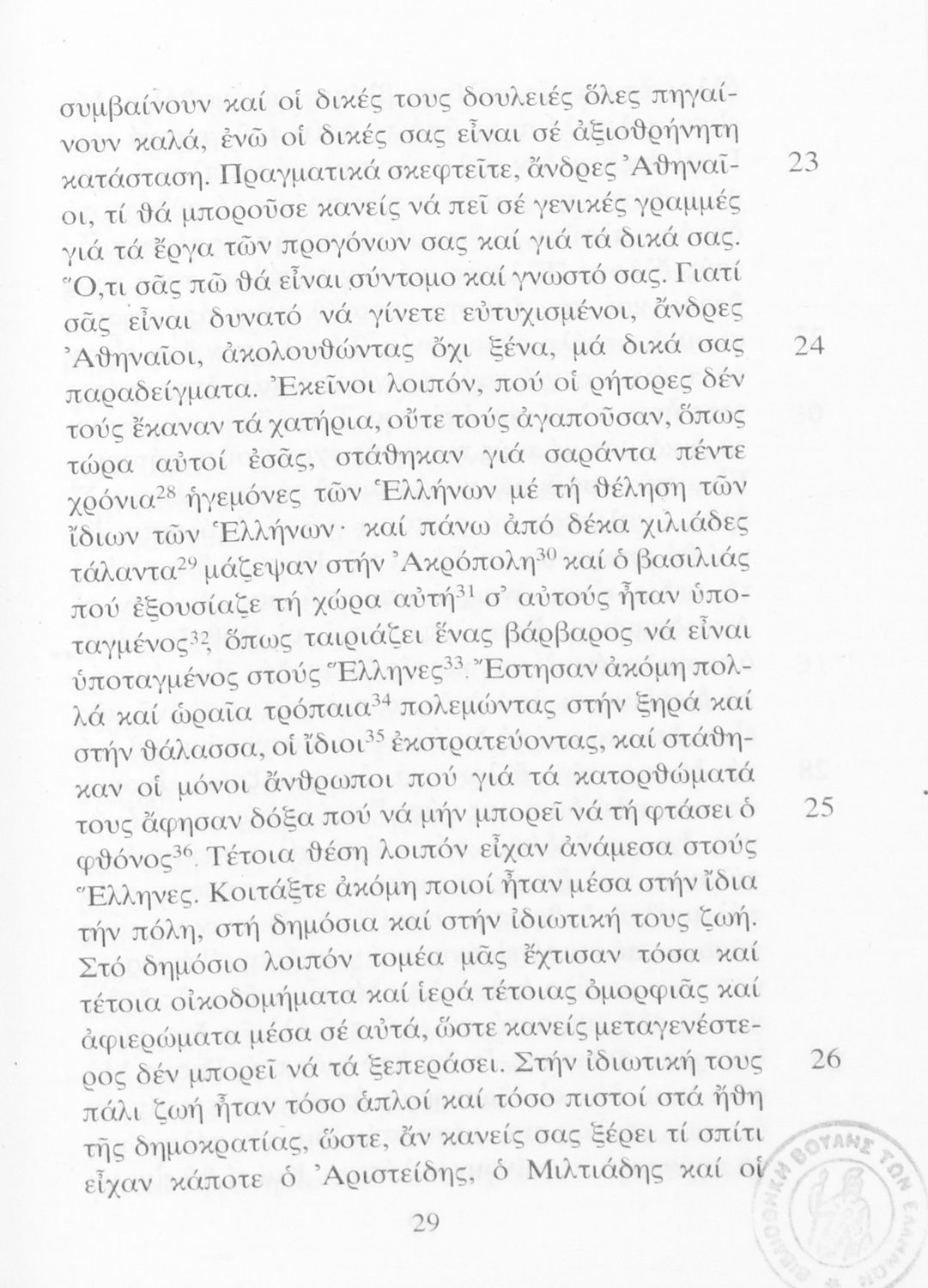 Σχολικό εγχειρίδιο Αρχαίων Ελληνικών Β΄ Γυμνασίου που περιέχει τους Λόγους του Δημοσθένη Φιλιππικός Α΄ και Γ΄, και ερμηνευτικές και πραγματολογικές παρατηρήσεις.