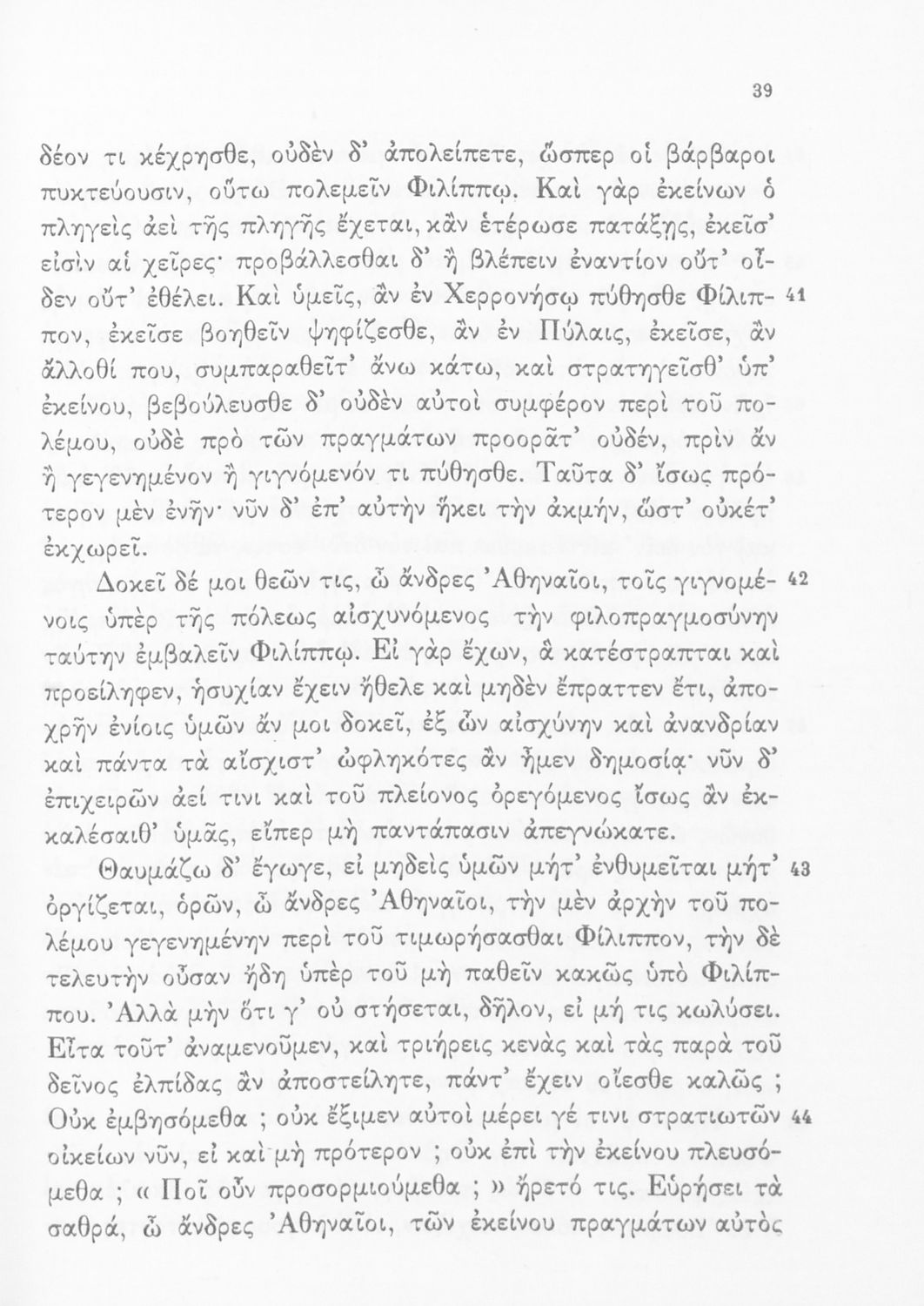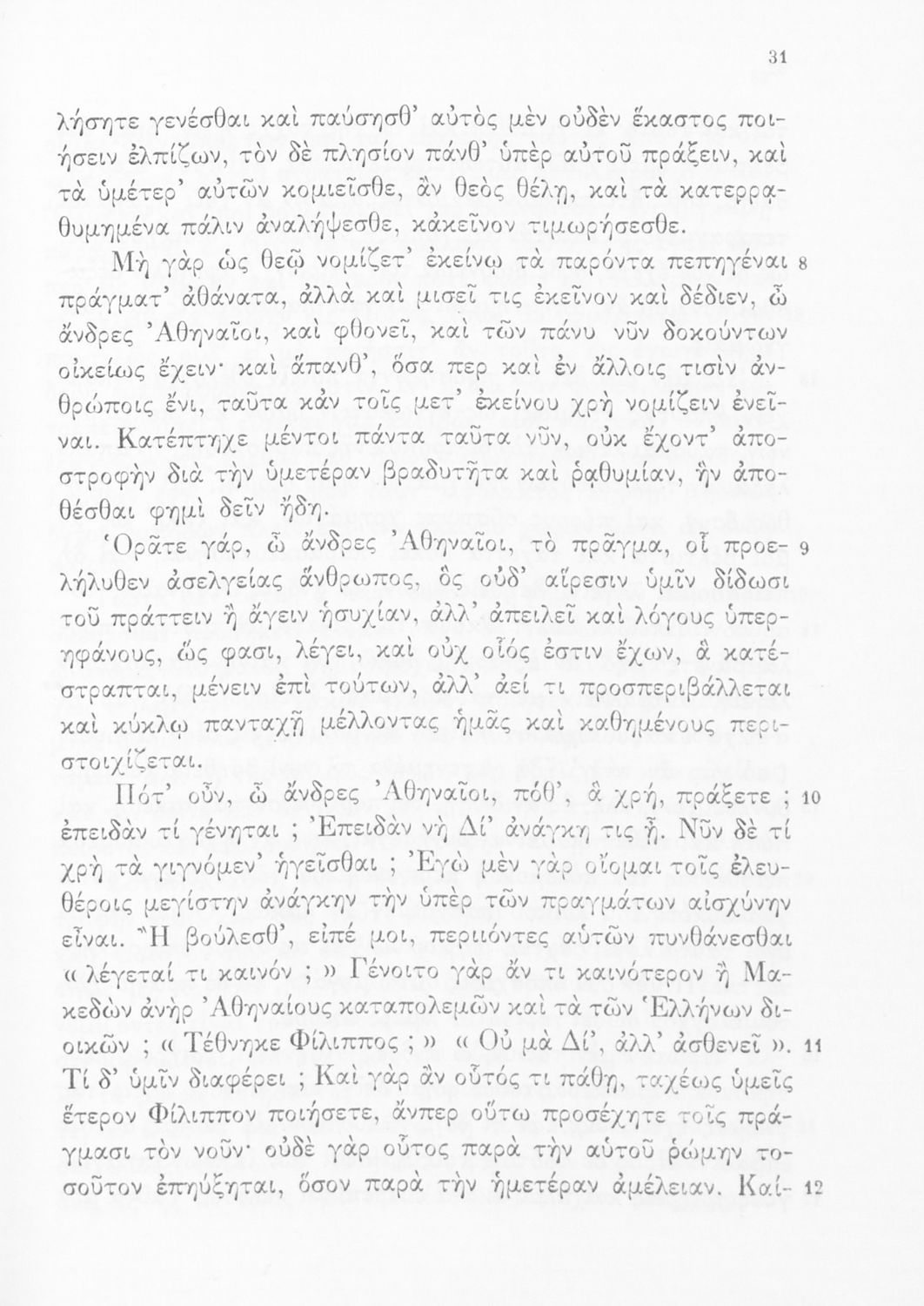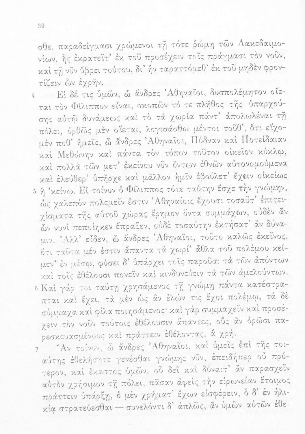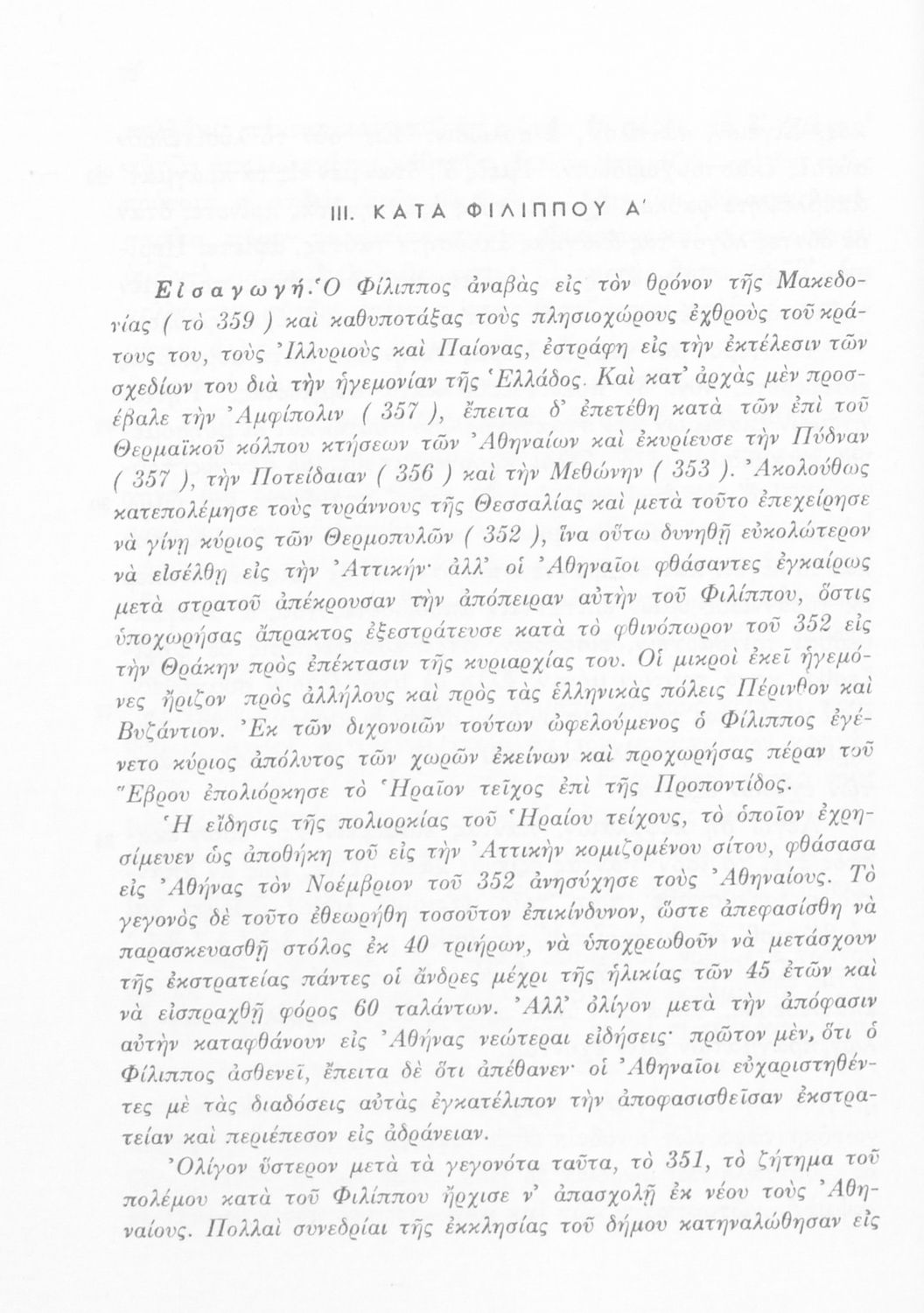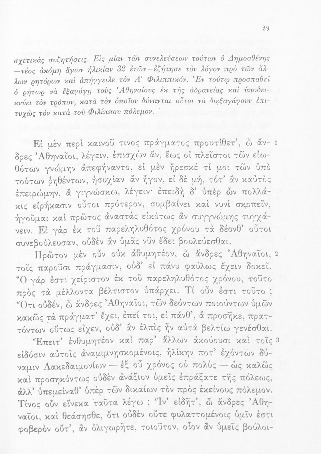 Σχολικό εγχειρίδιο Αρχαίων Ελληνικών Δ' Γυμνασίου που περιλαμβάνει τους Ολυνθιακούς Α΄ και Β΄ και τους Φιλιππικούς Α΄ και Β' του Δημοσθένη και ερμηνευτικές και λεξιλογικές σημειώσεις.