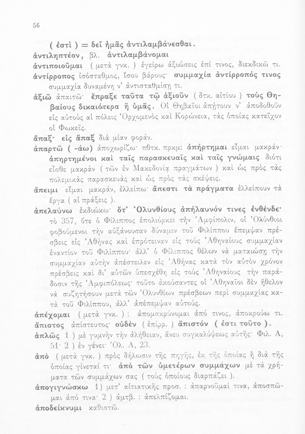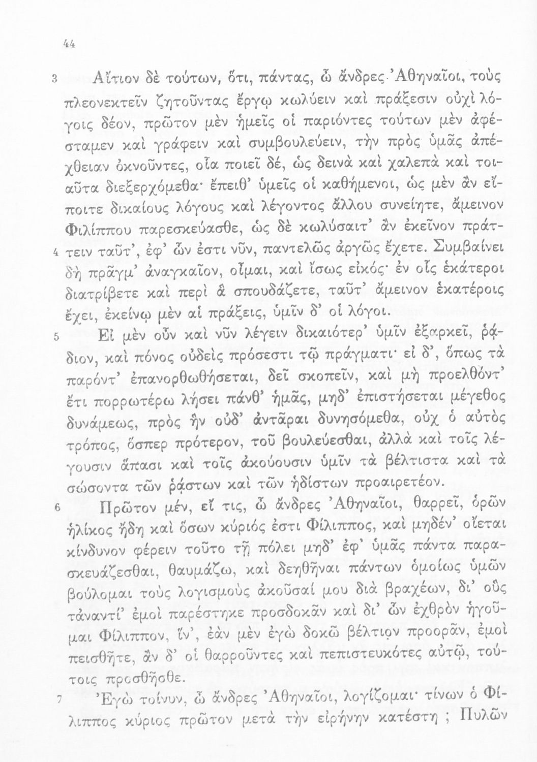 Σχολικό εγχειρίδιο Αρχαίων Ελληνικών Δ΄ Γυμνασίου που περιλαμβάνει εισαγωγή στη ζωή και στο έργο του Δημοσθένη, τον Α΄ κατά Φιλίππου, και τους Α΄ και Β΄ Ολυνθιακούς και ερμηνευτικά και ετυμολογικά σχόλια.