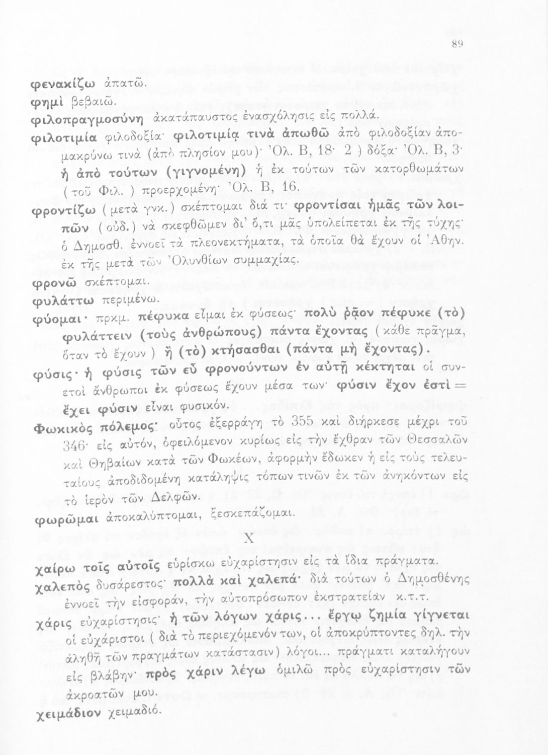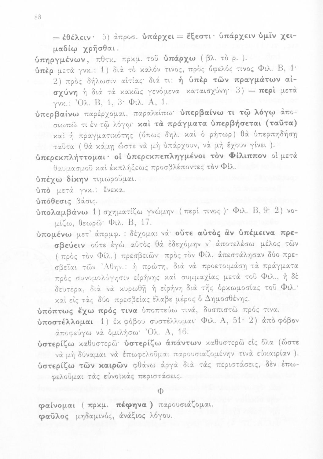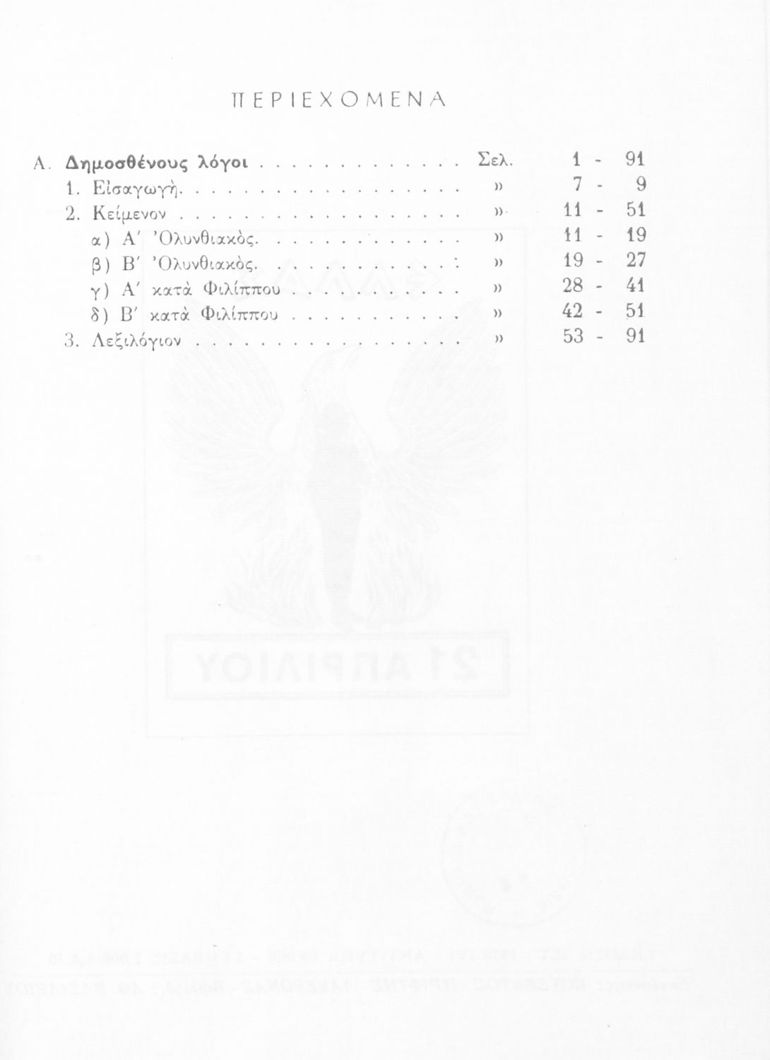 Σχολικό εγχειρίδιο Αρχαίων Ελληνικών Δ' Γυμνασίου που περιλαμβάνει τους Ολυνθιακούς Α΄ και Β΄ και τους Φιλιππικούς Α΄ και Β' του Δημοσθένη και ερμηνευτικές και λεξιλογικές σημειώσεις.