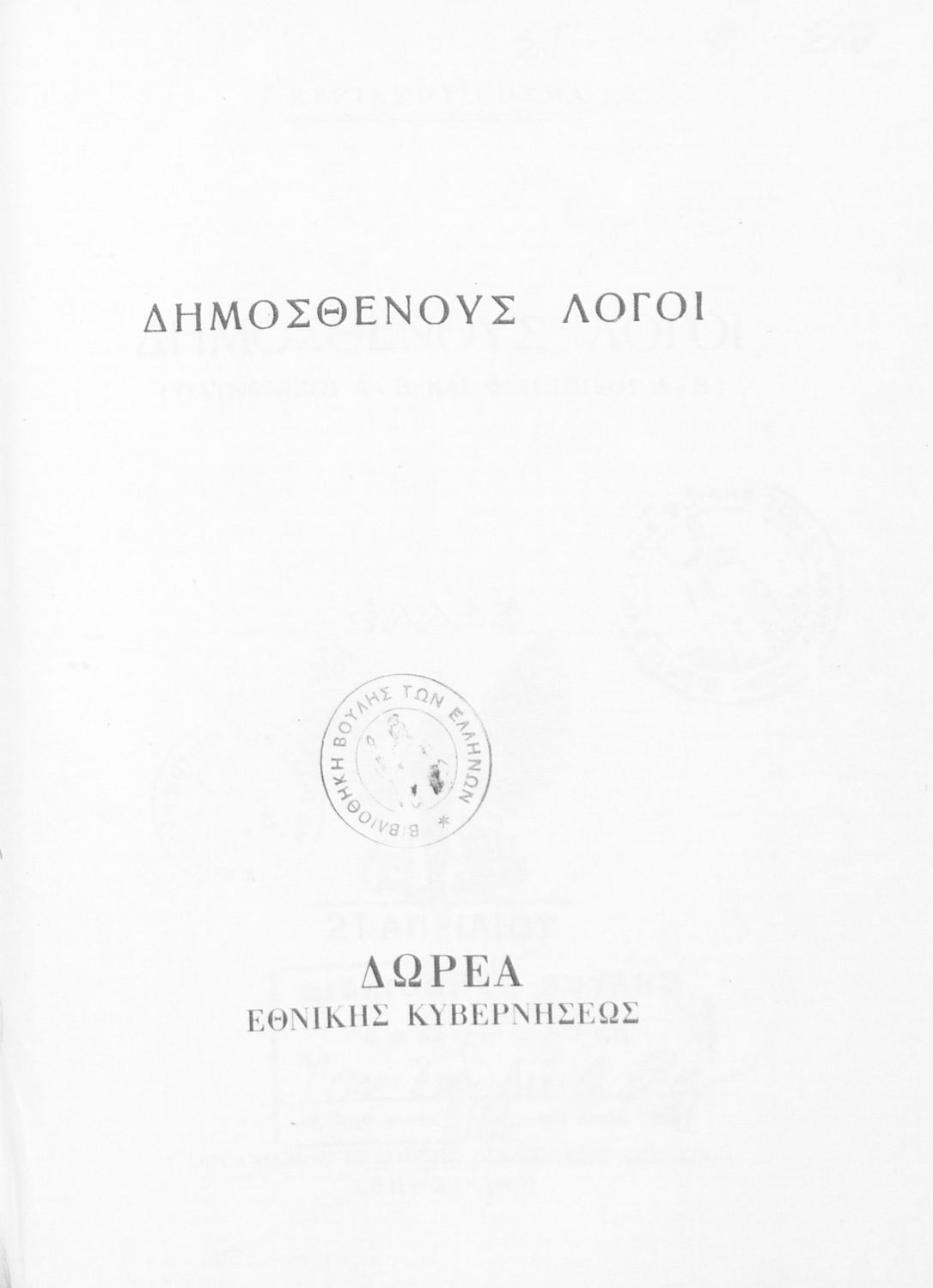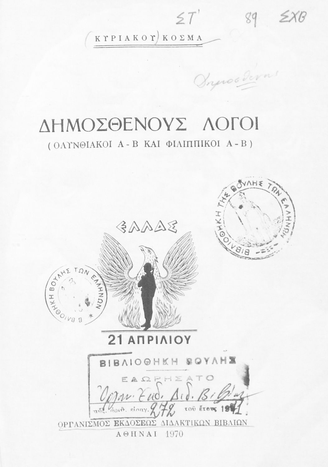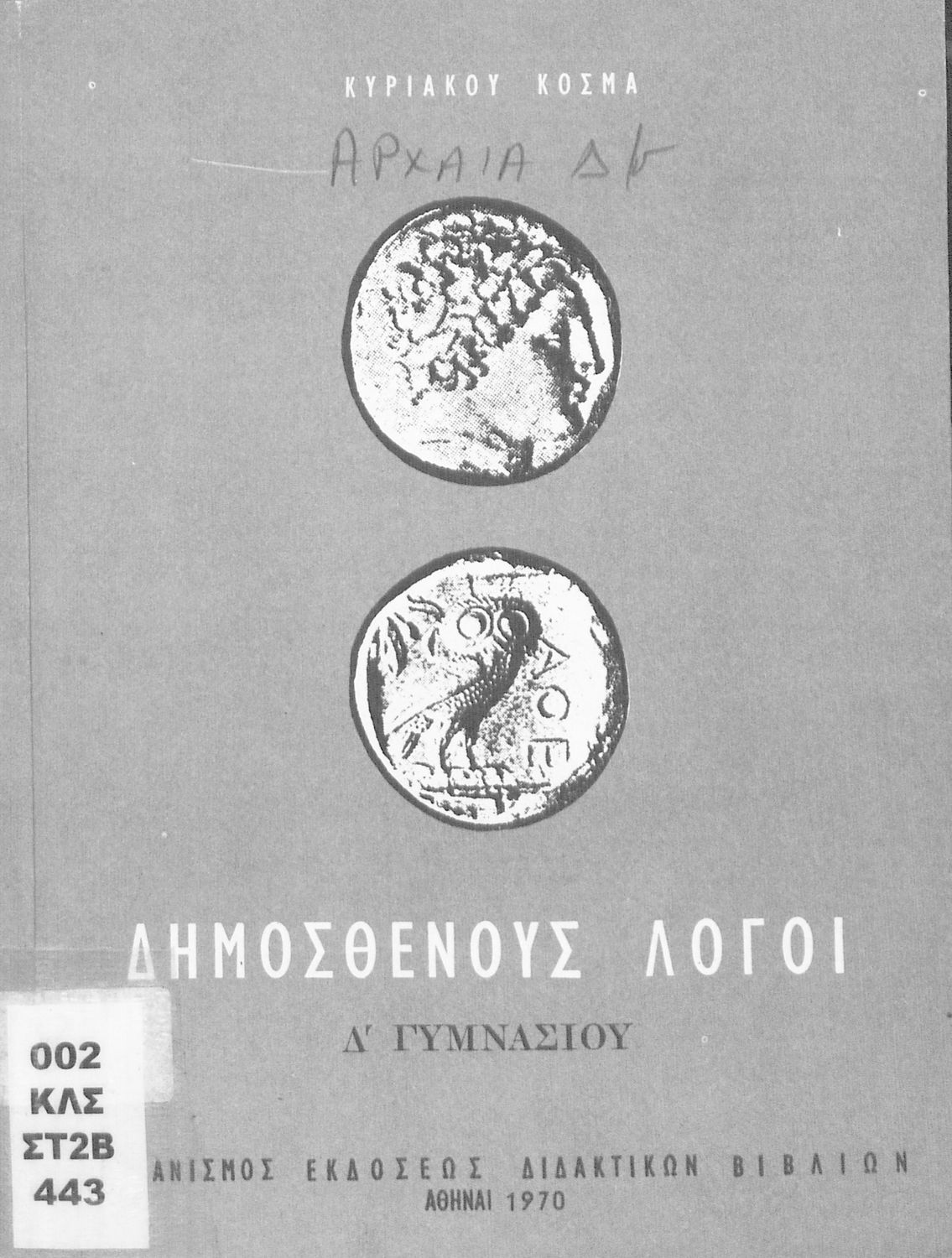 Σχολικό εγχειρίδιο Αρχαίων Ελληνικών Δ΄ Γυμνασίου που περιλαμβάνει τους Ολυνθιακούς Α΄ και Β΄ και τους Φιλιππικούς Α΄ και Β' του Δημοσθένη, εισαγωγή και ερμηνευτικά σχόλια. Φέρει το σύμβολο της δικτατορίας.