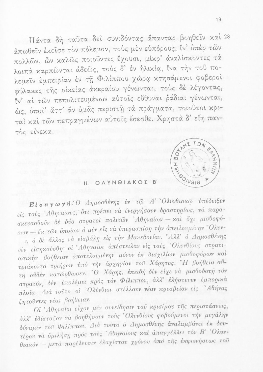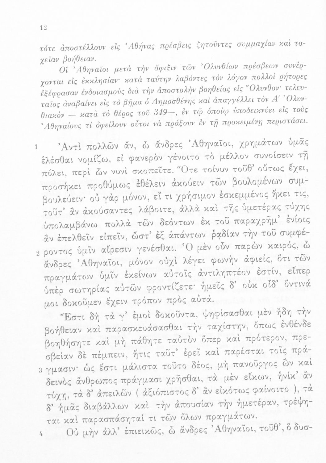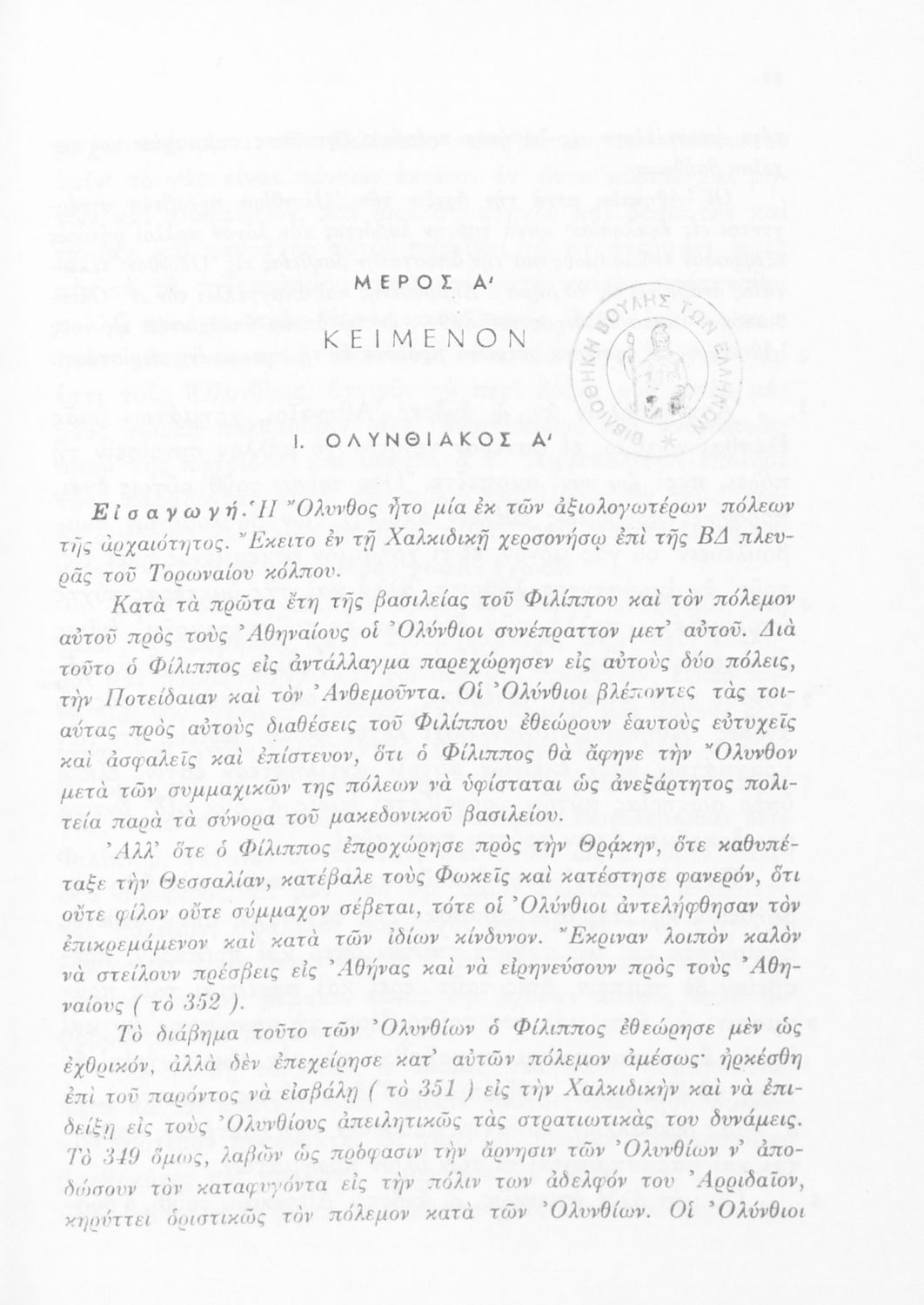 Σχολικό εγχειρίδιο Αρχαίων Ελληνικών Δ΄ Γυμνασίου που περιλαμβάνει τους Ολυνθιακούς Α΄ και Β΄ και τους Φιλιππικούς Α΄ και Β' του Δημοσθένη, εισαγωγή και ερμηνευτικά σχόλια. Φέρει το σύμβολο της δικτατορίας.