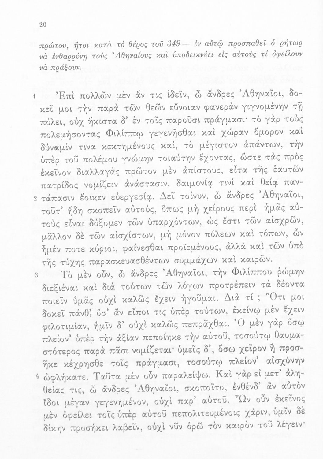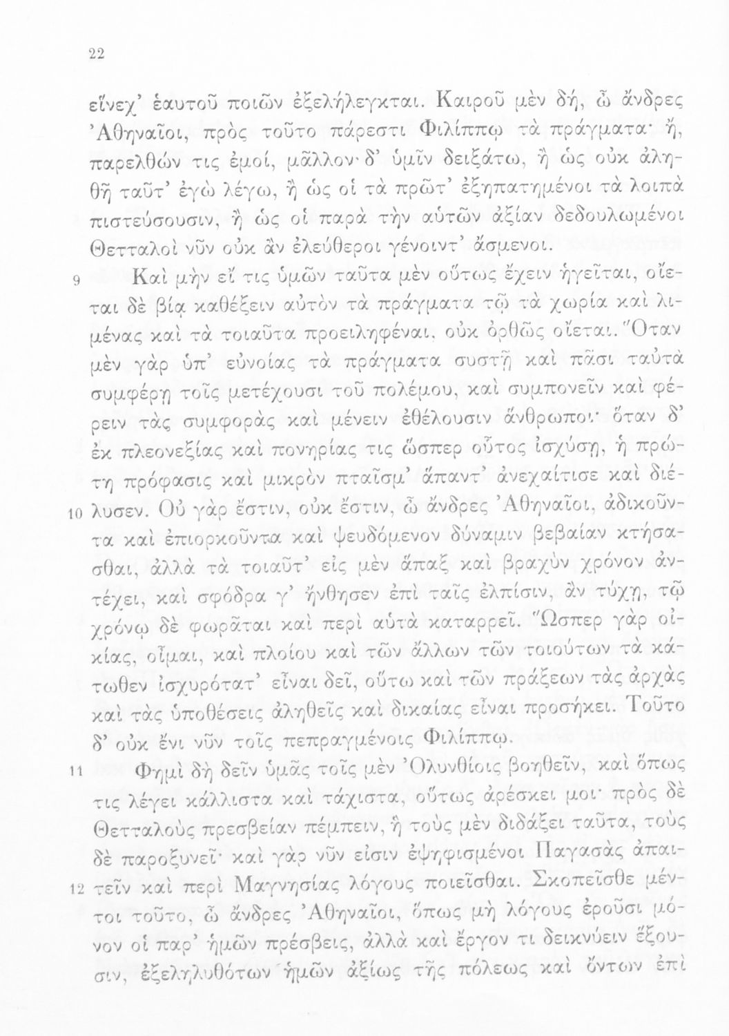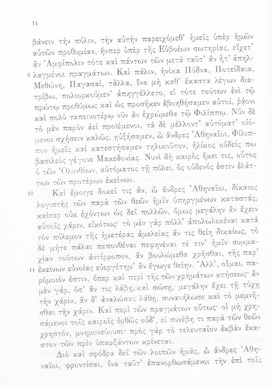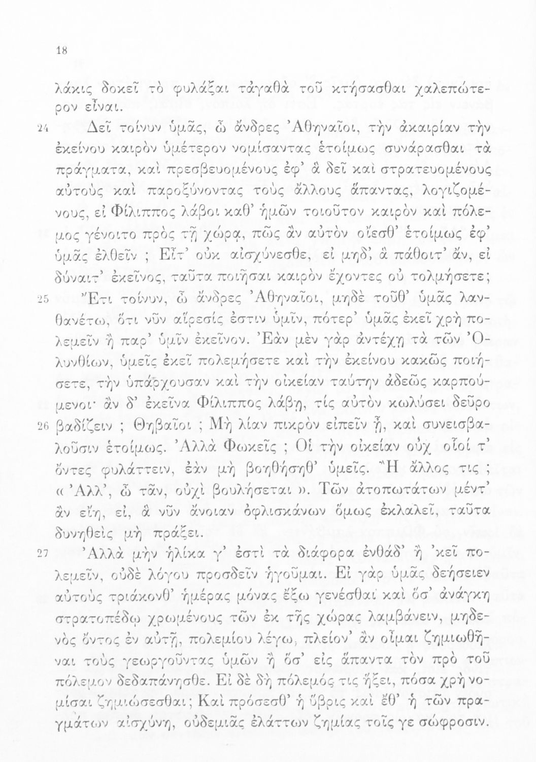 Σχολικό εγχειρίδιο Αρχαίων Ελληνικών Δ΄ Γυμνασίου που περιλαμβάνει εισαγωγή στη ζωή και στο έργο του Δημοσθένη, τον Α΄ κατά Φιλίππου, και τους Α΄ και Β΄ Ολυνθιακούς και ερμηνευτικά και ετυμολογικά σχόλια.