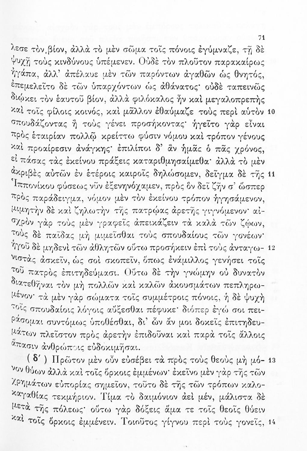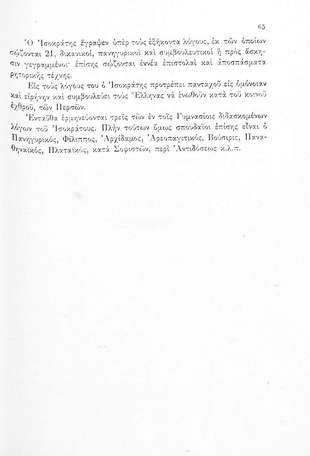 Σχολικό εγχειρίδιο Αρχαίων Ελληνικών Γ΄ Γυμνασίου που περιλαμβάνει τους Λόγους του Λυσία Περί του σηκού απολογία, Υπέρ του αδυνάτου, Κατά των σιτοπωλών και του Ισοκράτη Προς Δημόνικον, Προς Νικοκλέα και Ευαγόρας, εισαγωγή στους Λόγους και ερμηνευτικά σχόλια. Φέρει το σύμβολο της δικτατορίας.