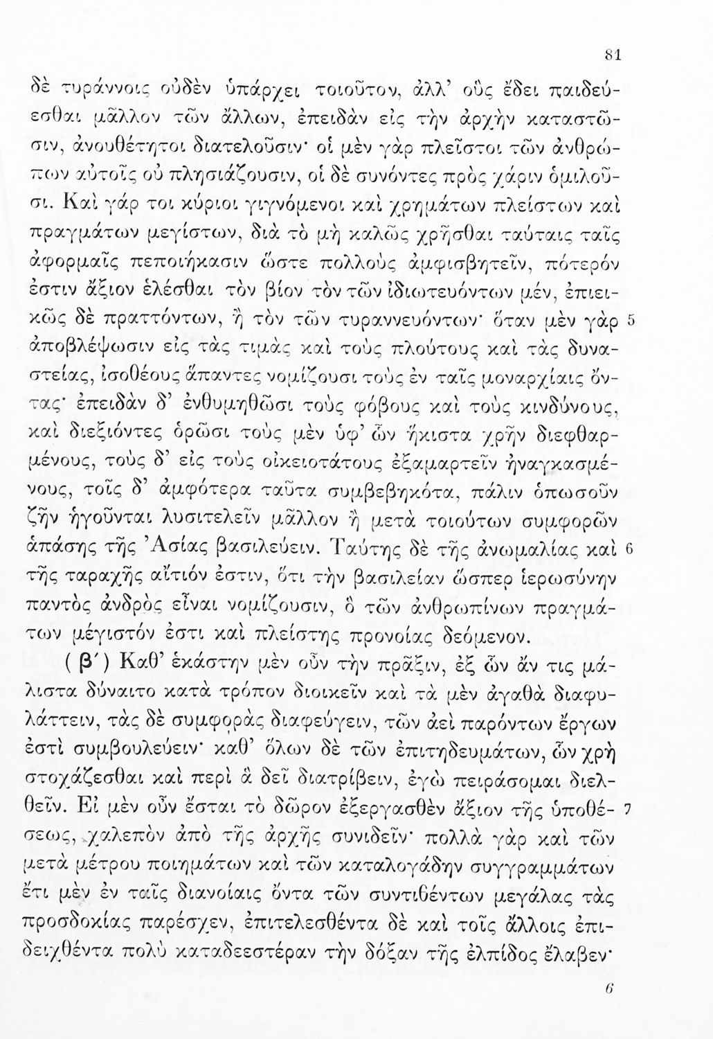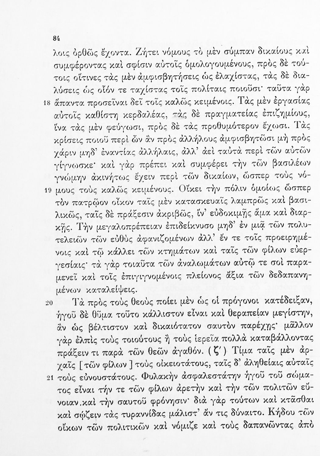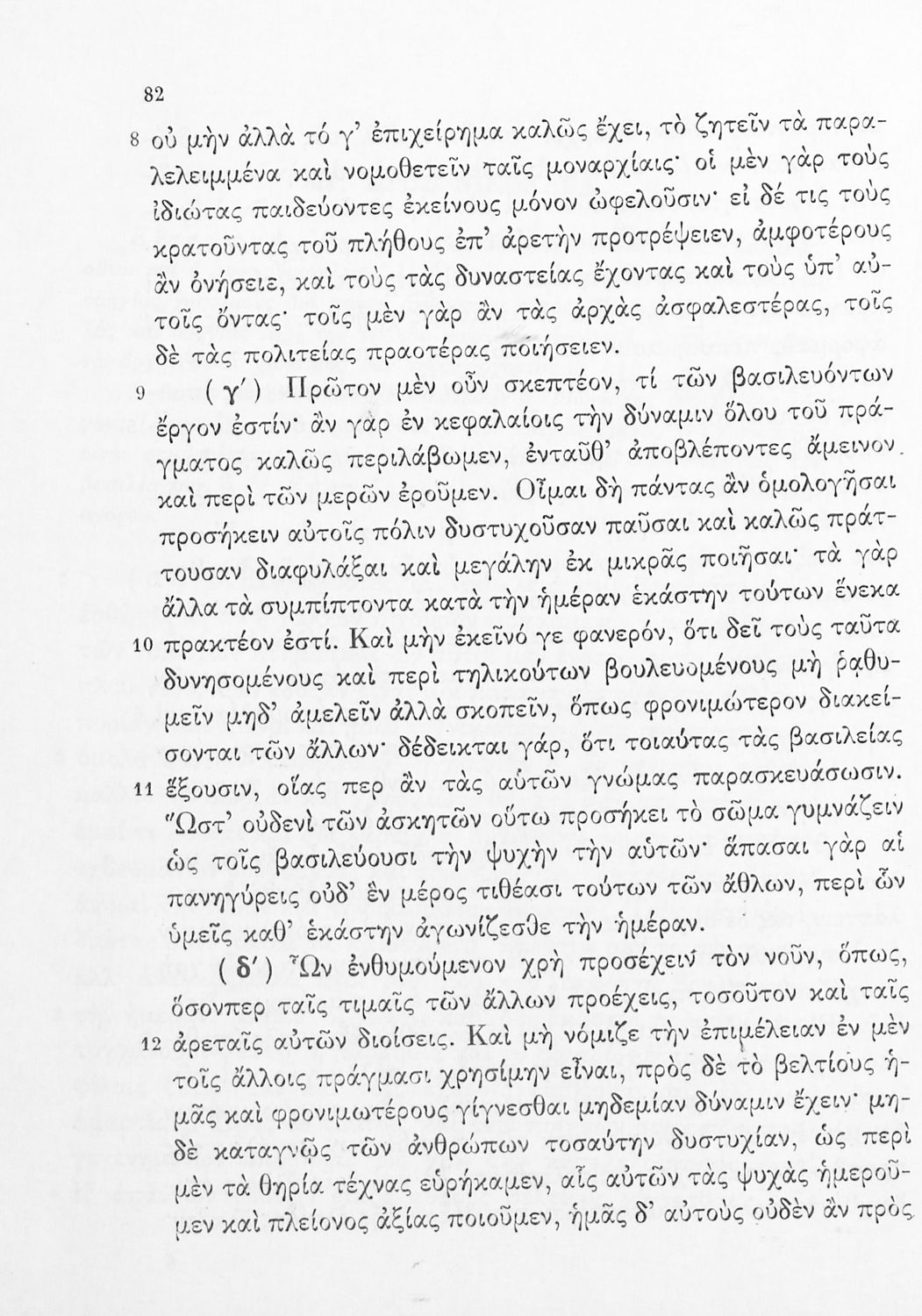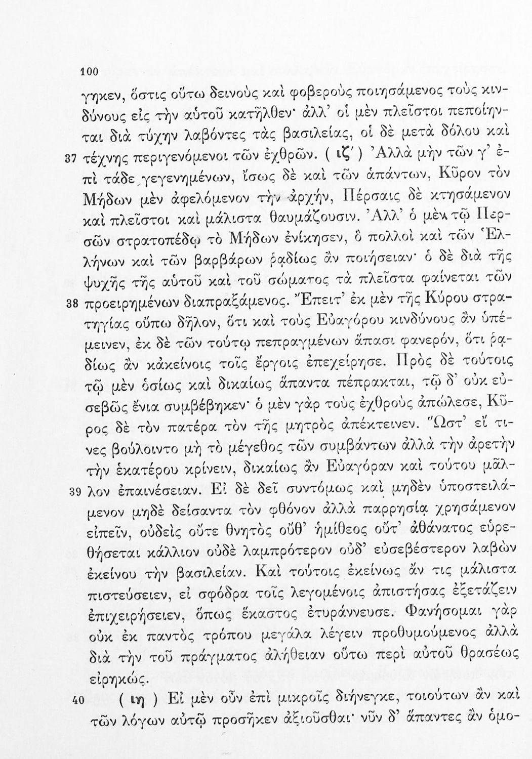 Σχολικό εγχειρίδιο Αρχαίων Ελληνικών Γ΄ Γυμνασίου που περιλαμβάνει τους Λόγους του Λυσία Περί του σηκού απολογία, Υπέρ του αδυνάτου, Κατά των σιτοπωλών και του Ισοκράτη Προς Δημόνικον, Προς Νικοκλέα και Ευαγόρας, εισαγωγή στους Λόγους και ερμηνευτικά σχόλια. Φέρει το σύμβολο της δικτατορίας.