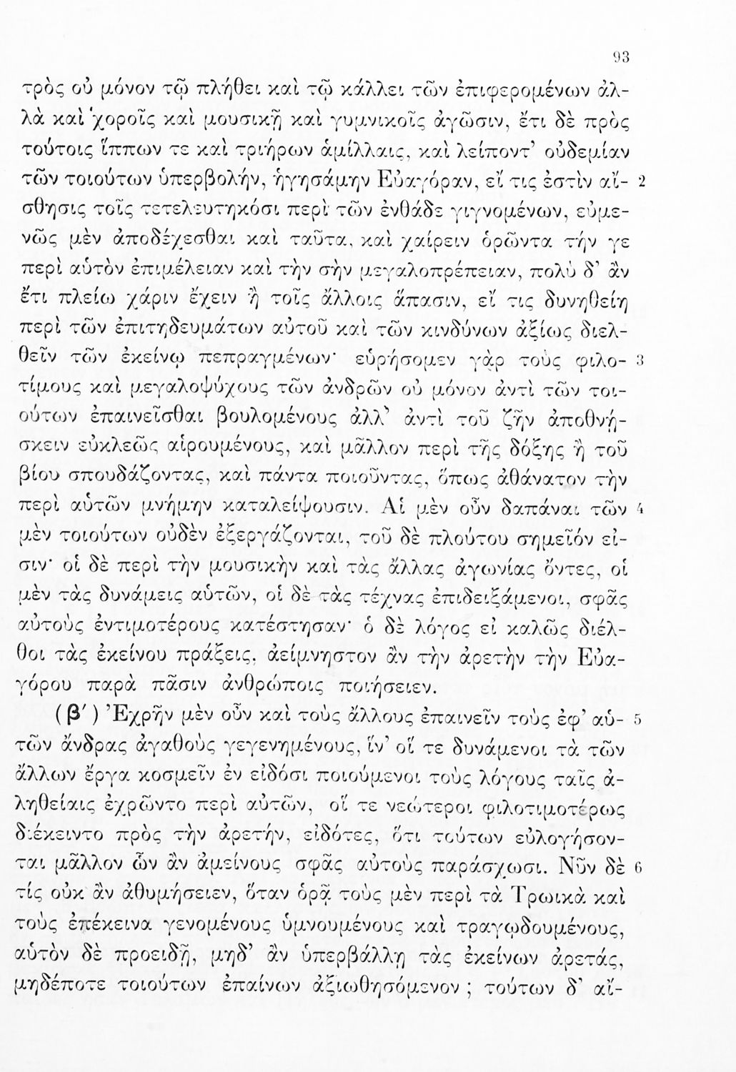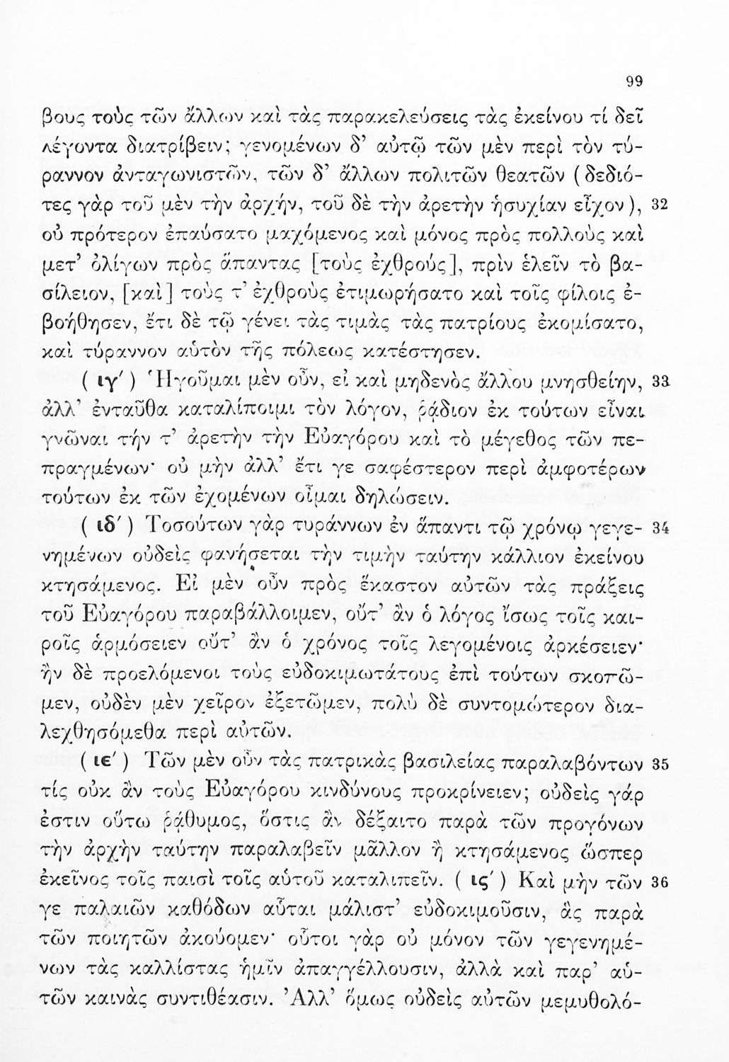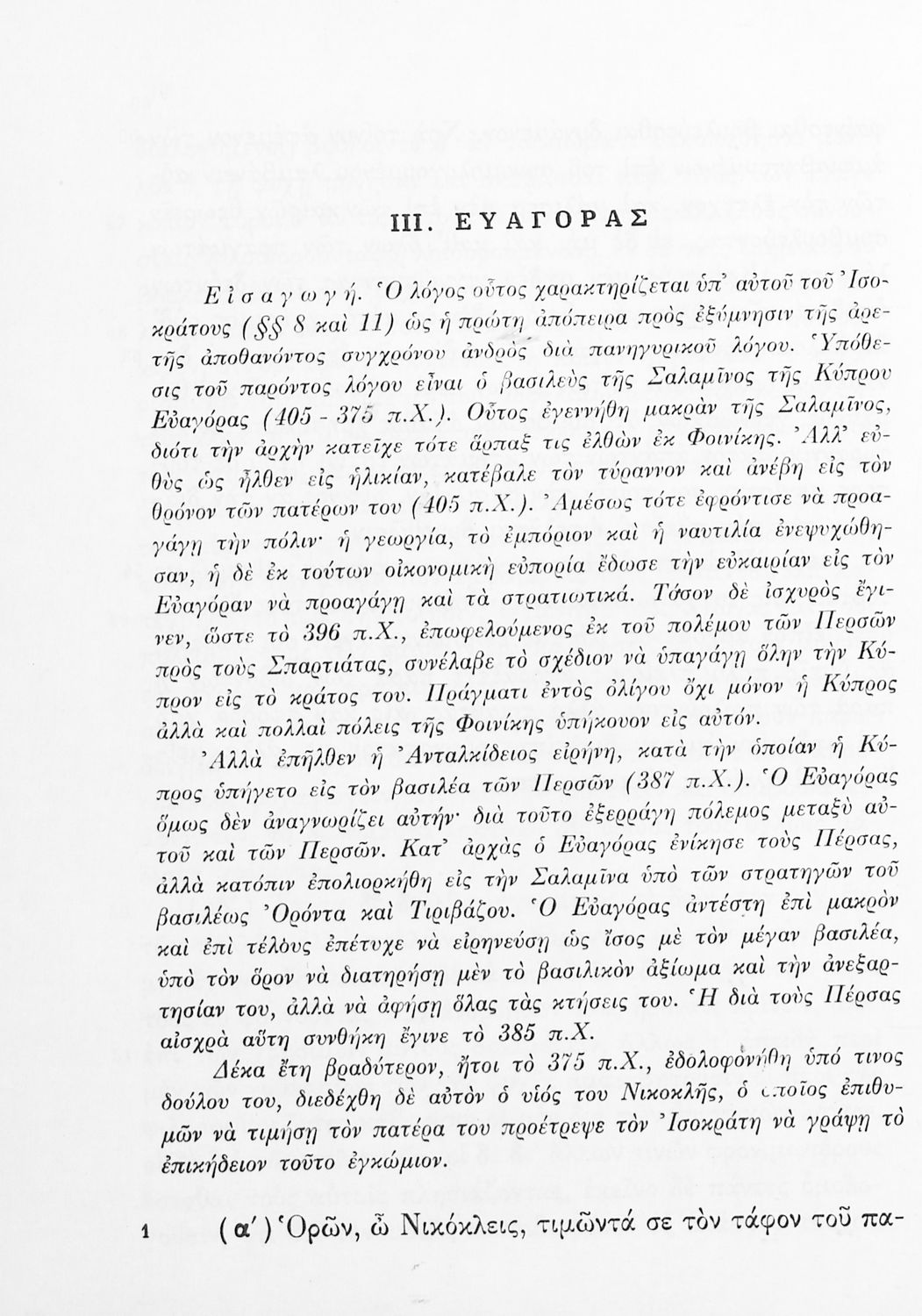 Σχολικό εγχειρίδιο Αρχαίων Ελληνικών Γ΄ Γυμνασίου που περιλαμβάνει σύντομο βιογραφικό σημείωμα του Ισοκράτη, τους Λόγους του Προς Νικοκλέα και Ευαγόρας και ερμηνευτικά και λεξιλογικά σχόλια.