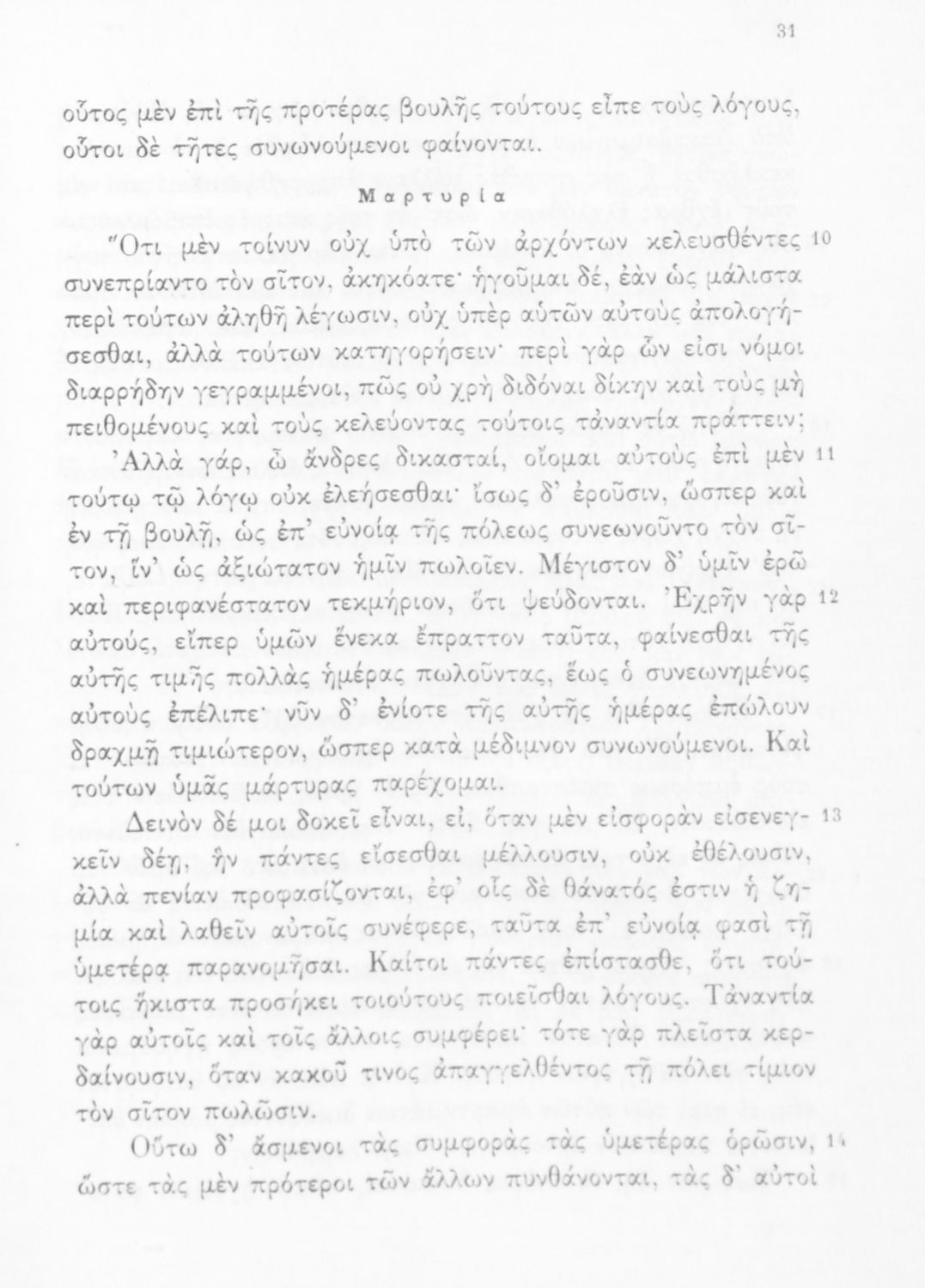 Σχολικό εγχειρίδιο Αρχαίων Ελληνικών Γ΄ Γυμνασίου που περιέχει τους Λόγους του Λυσία Περί του σηκού απολογία, Υπέρ του αδύνατου, και Κατά των σιτοπωλών και λεξιλογικές και ερμηνευτικές σημειώσεις. Φέρει το σύμβολο της δικτατορίας.