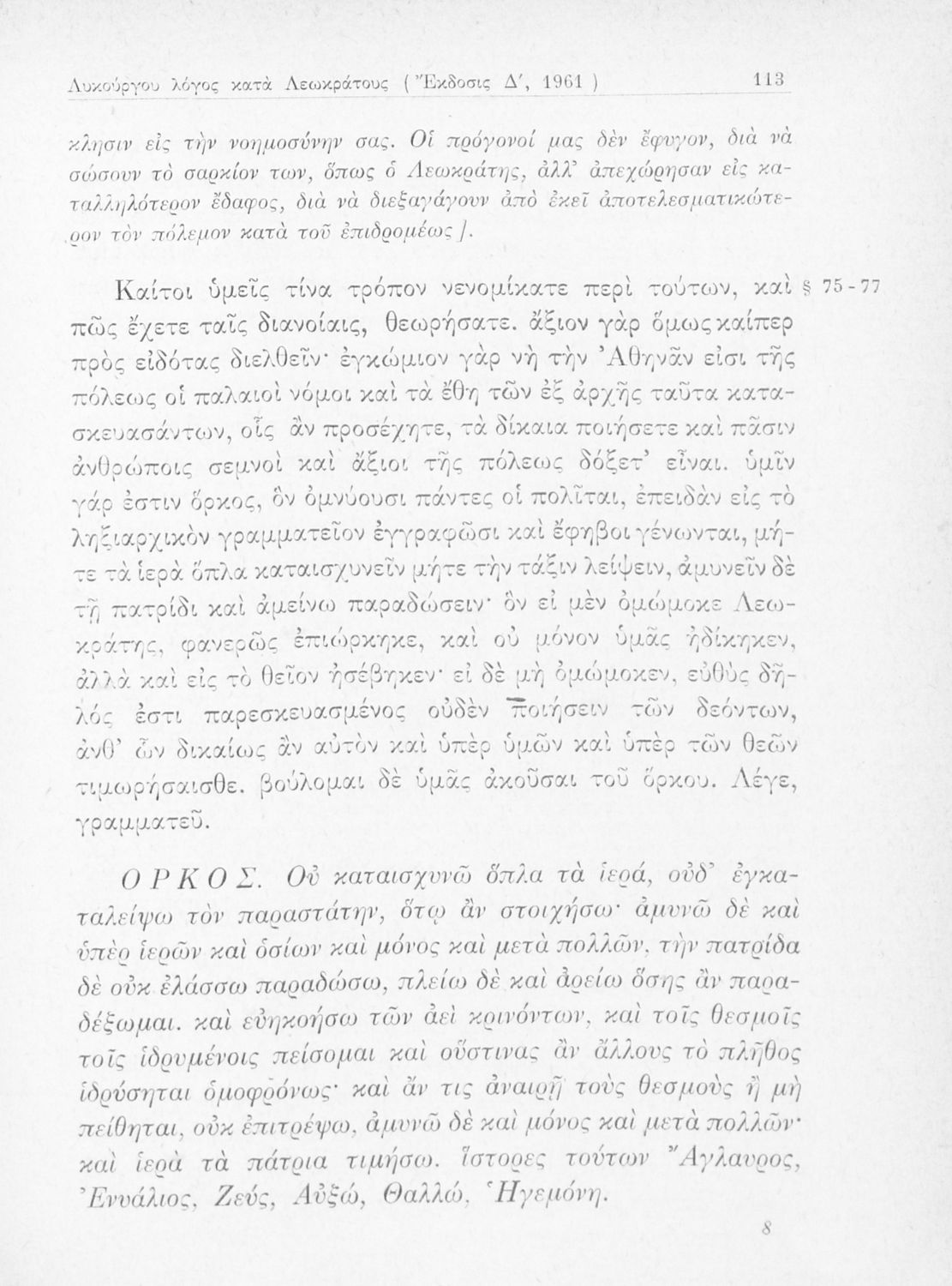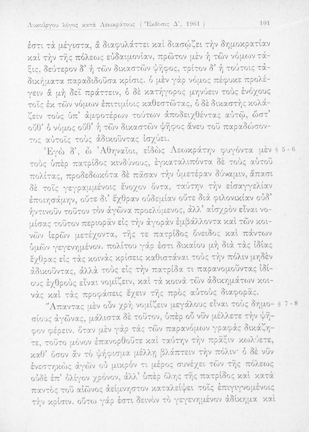Σχολικό εγχειρίδιο Αρχαίων Ελληνικών Δ΄ Γυμνασίου που περιλαμβάνει εισαγωγή στη ζωή και το έργο του Λυκούργου, τον Λόγο κατά Λεωκράτους και ερμηνευτικά και πραγματολογικά σχόλια.
