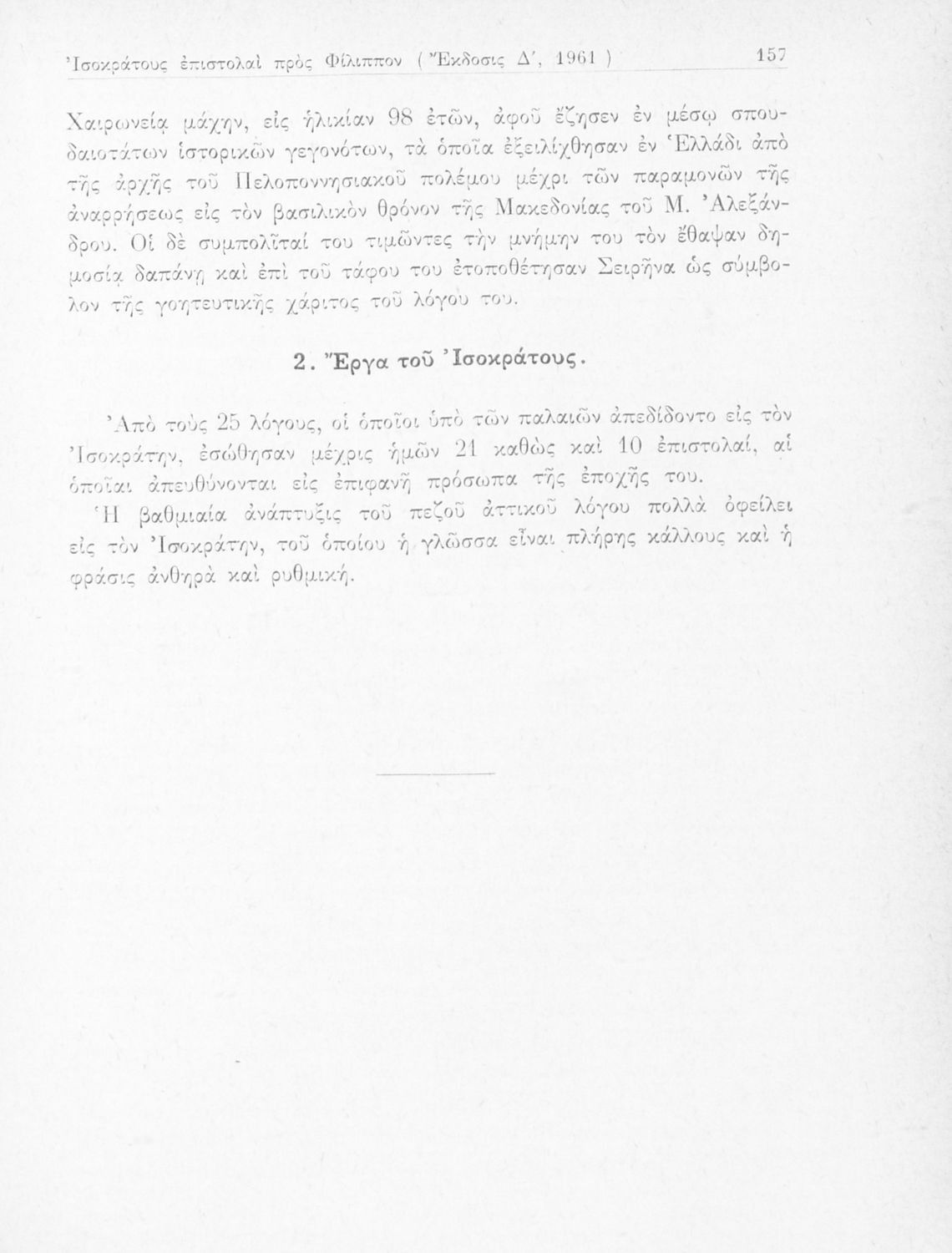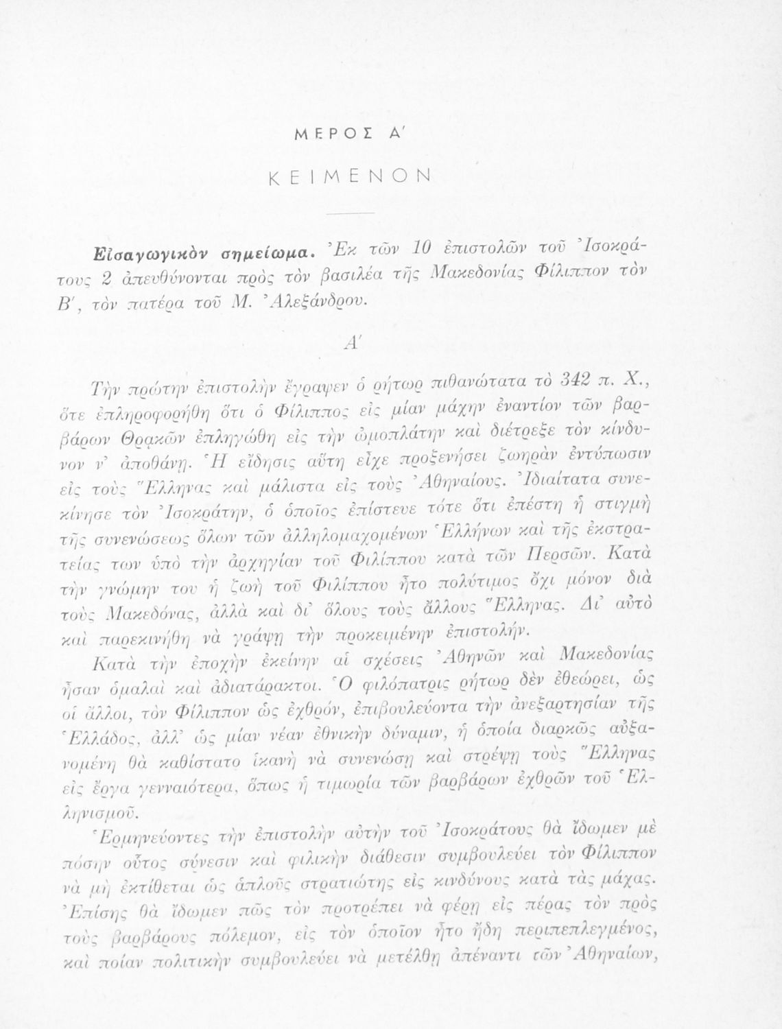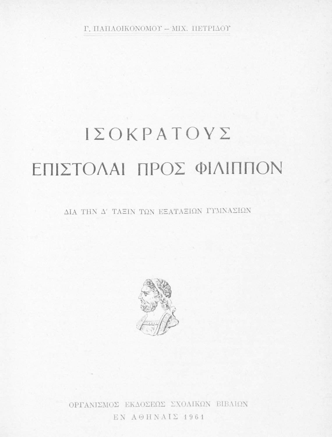 Σχολικό εγχειρίδιο Αρχαίων Ελληνικών Δ΄ Γυμνασίου που περιλαμβάνει εισαγωγή στη ζωή και το έργο του Ισοκράτη, τις επιστολές Α΄ και Β΄ προς Φίλιππο και ερμηνευτικές παρατηρήσεις.