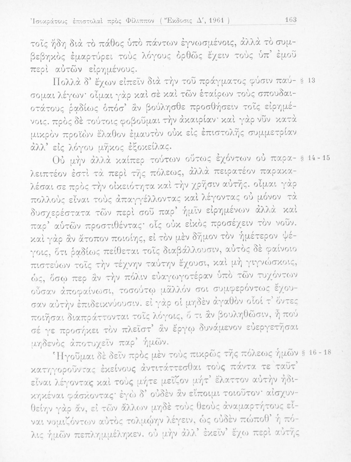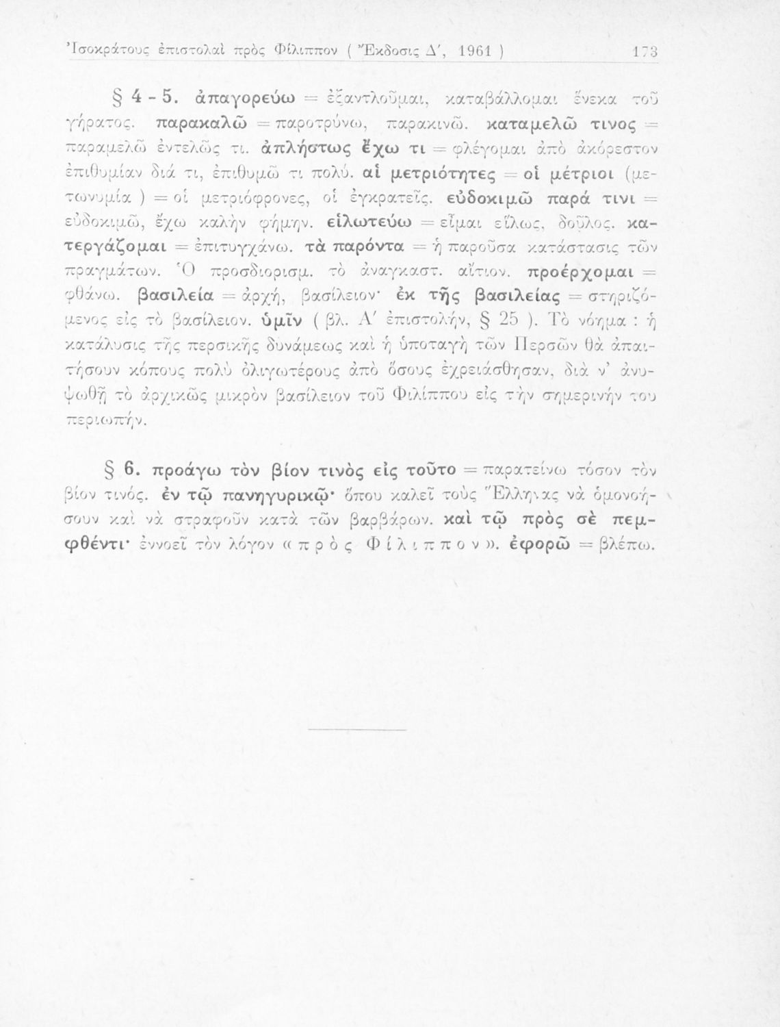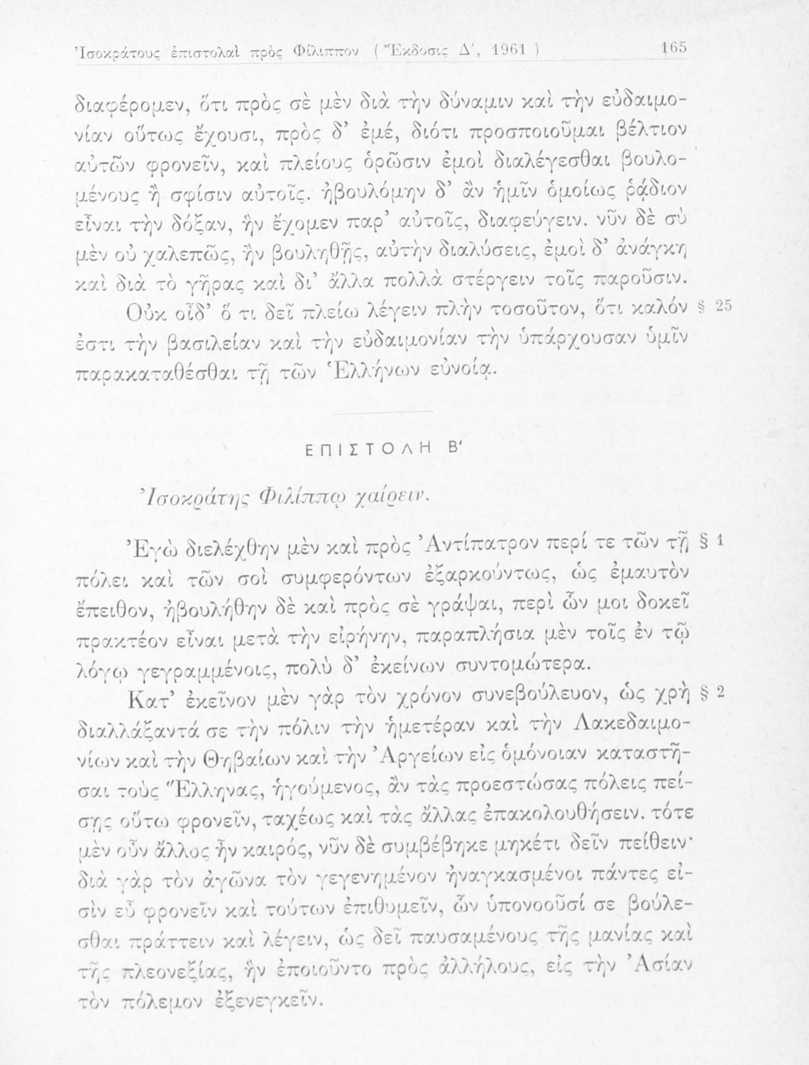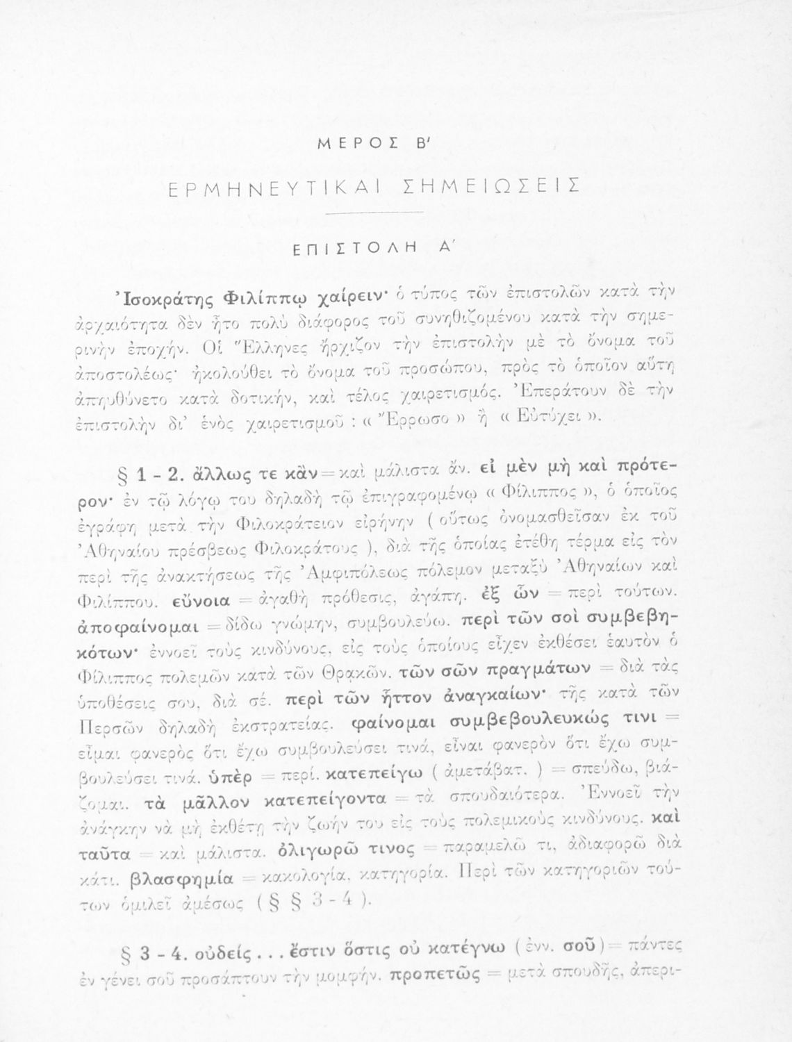 Σχολικό εγχειρίδιο Αρχαίων Ελληνικών Δ΄ Γυμνασίου που περιλαμβάνει εισαγωγή στη ζωή και το έργο του Ισοκράτη, τις επιστολές Α΄ και Β΄ προς Φίλιππο και ερμηνευτικές παρατηρήσεις.