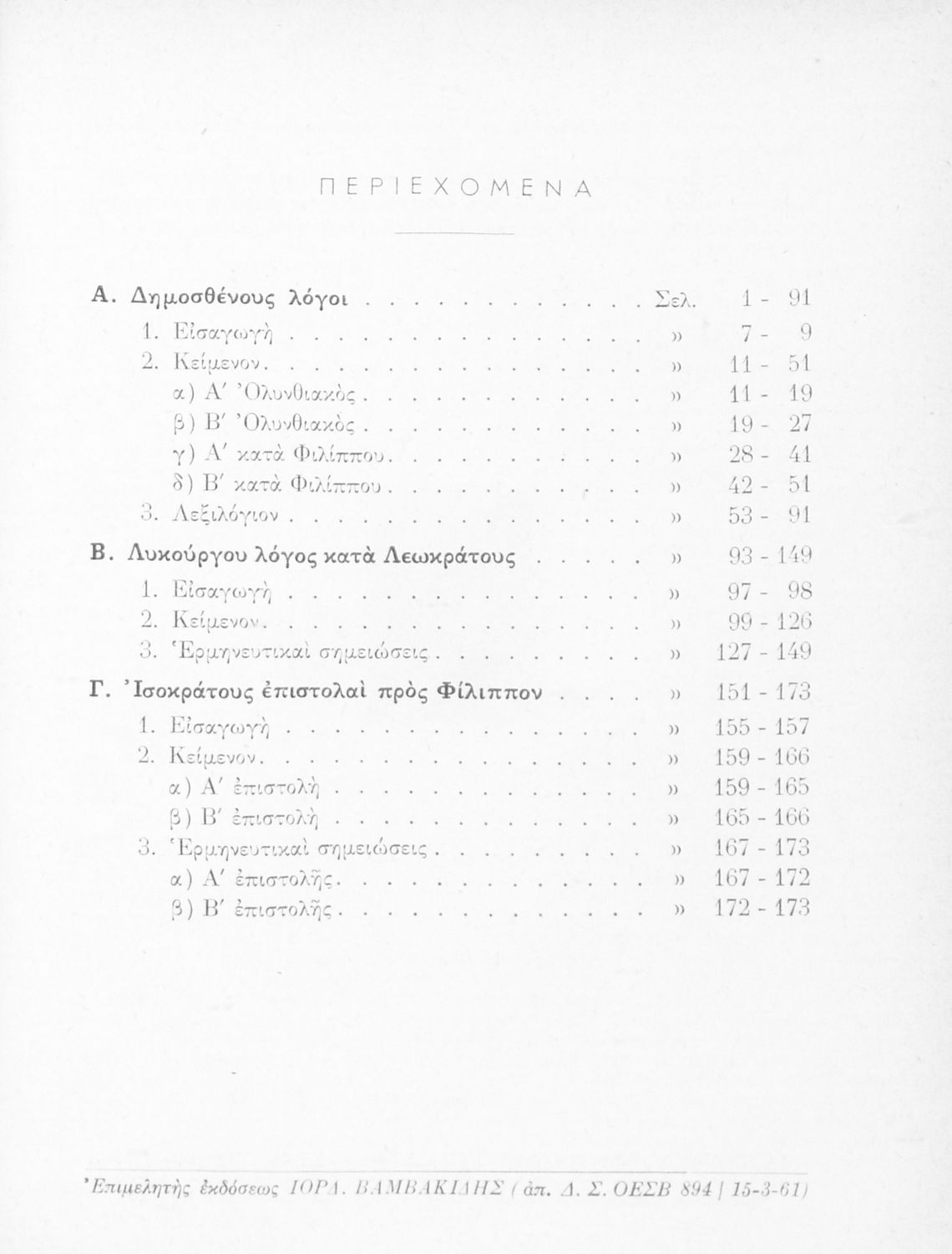 Συγγραφέας: Δημοσθένης, Λυκούργος, Ισοκράτης, Κυριάκος Κοσμάς, Ν. Φραγκίσκος, Μ. Πετρίδης, Γ. Παπαοικονόμου (εισαγωγή, σχόλια)