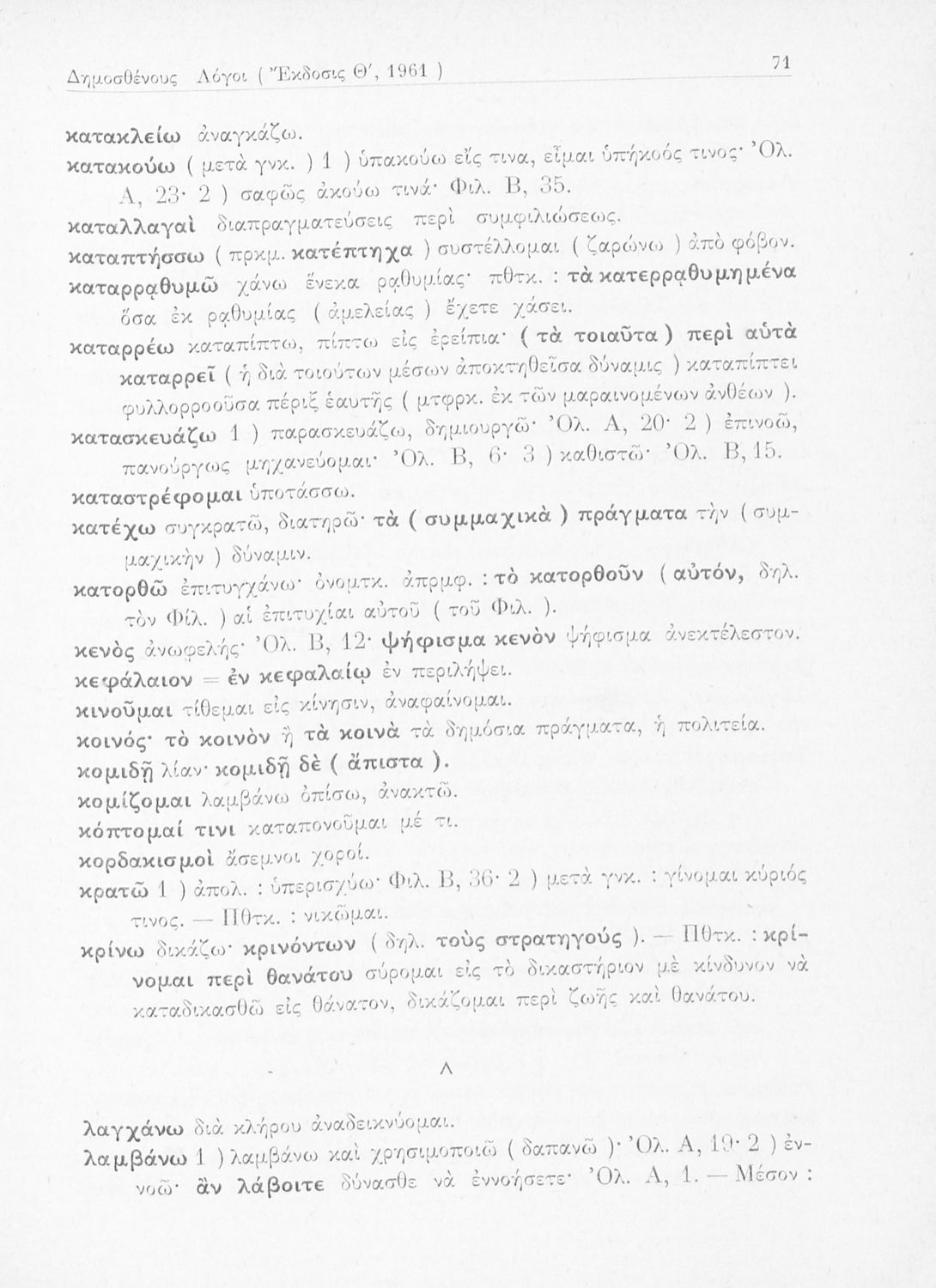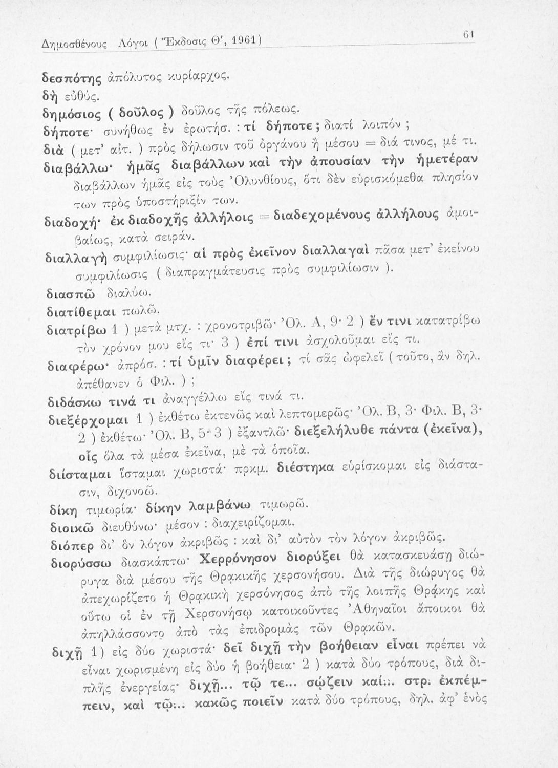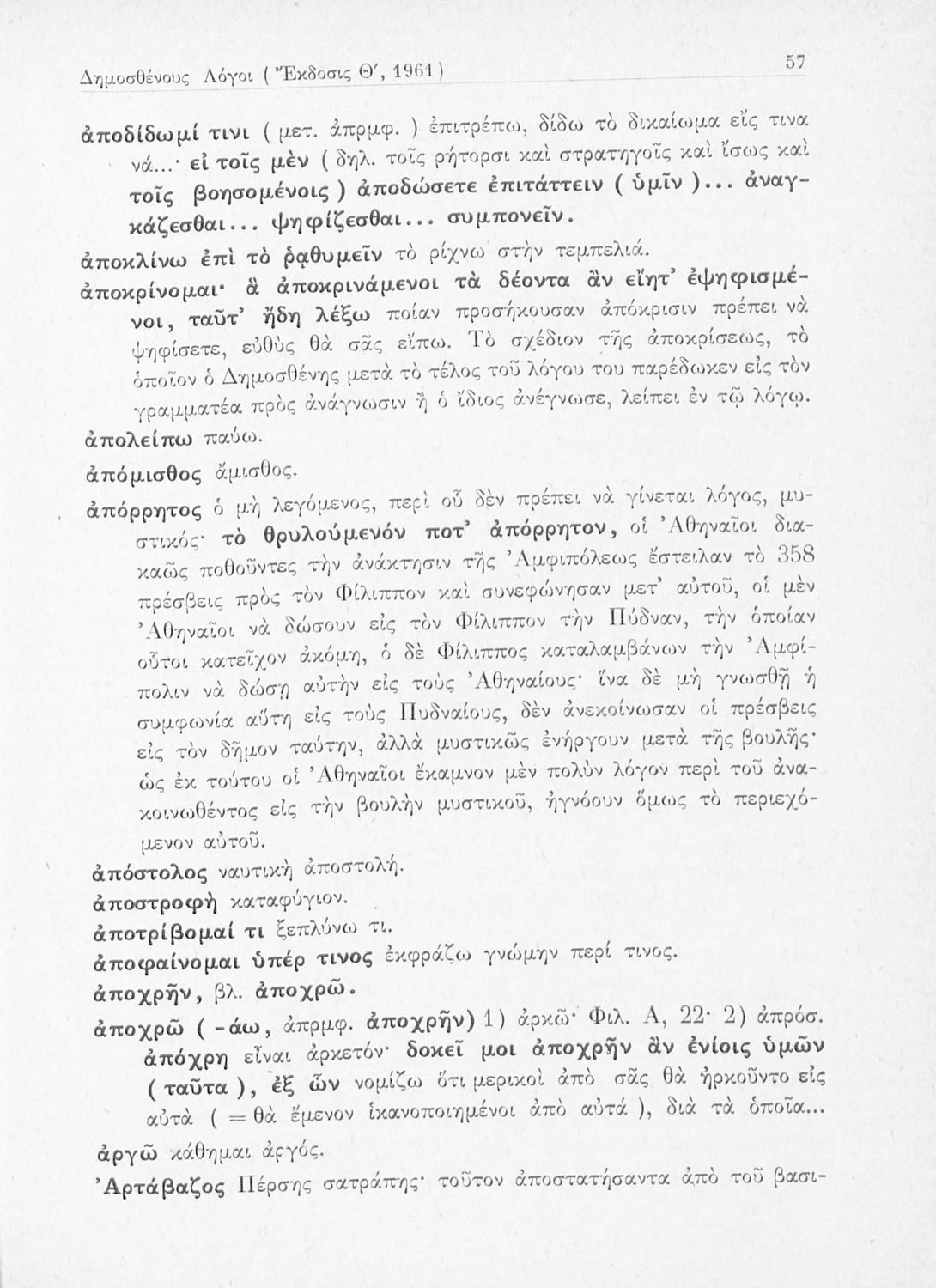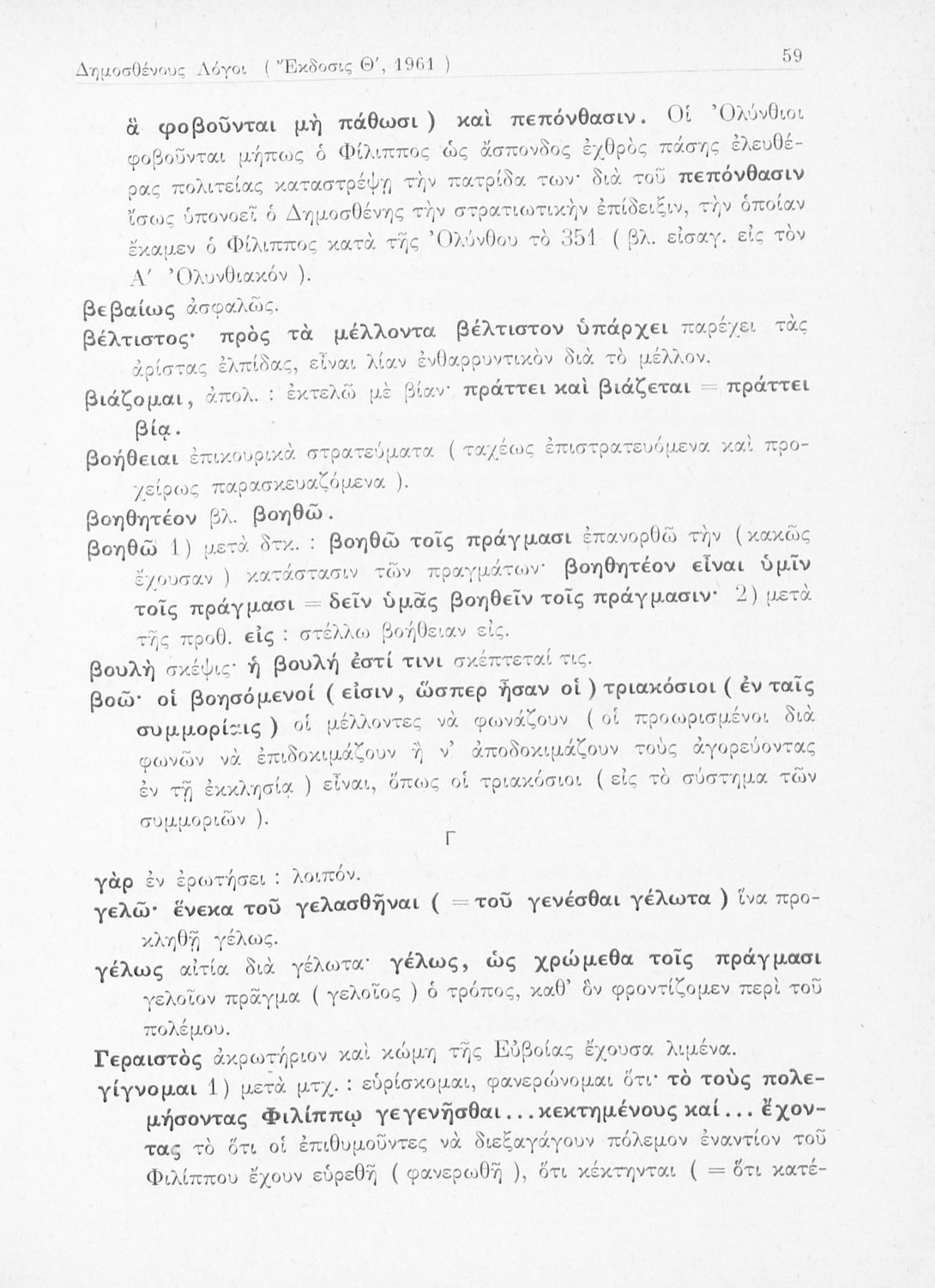 Σχολικό εγχειρίδιο Αρχαίων Ελληνικών Δ΄ Γυμνασίου που περιέχει τους Ολυνθιακούς Α΄ και Β΄ και τους Φιλιππικούς Α΄ και Β΄ του Δημοσθένη, το Λόγο κατά Λεωκράτους του Λυκούργου και τις Επιστολές προς Φίλιππο του Ισοκράτη, και ερμηνευτικά και ετυμολογικά σχόλια.