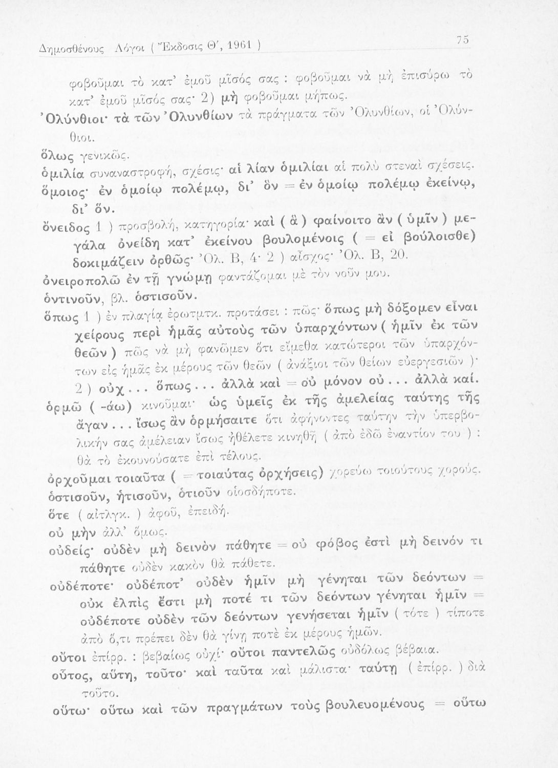 Μαθητικό βοήθημα για τους μαθητές της Δ΄ Εξαταταξίου Γυμνασίου που περιέχει τον Α' Ολυνθιακό του Δημοσθένη, μετάφραση, και γραμματικά και συντακτικά σχόλια.