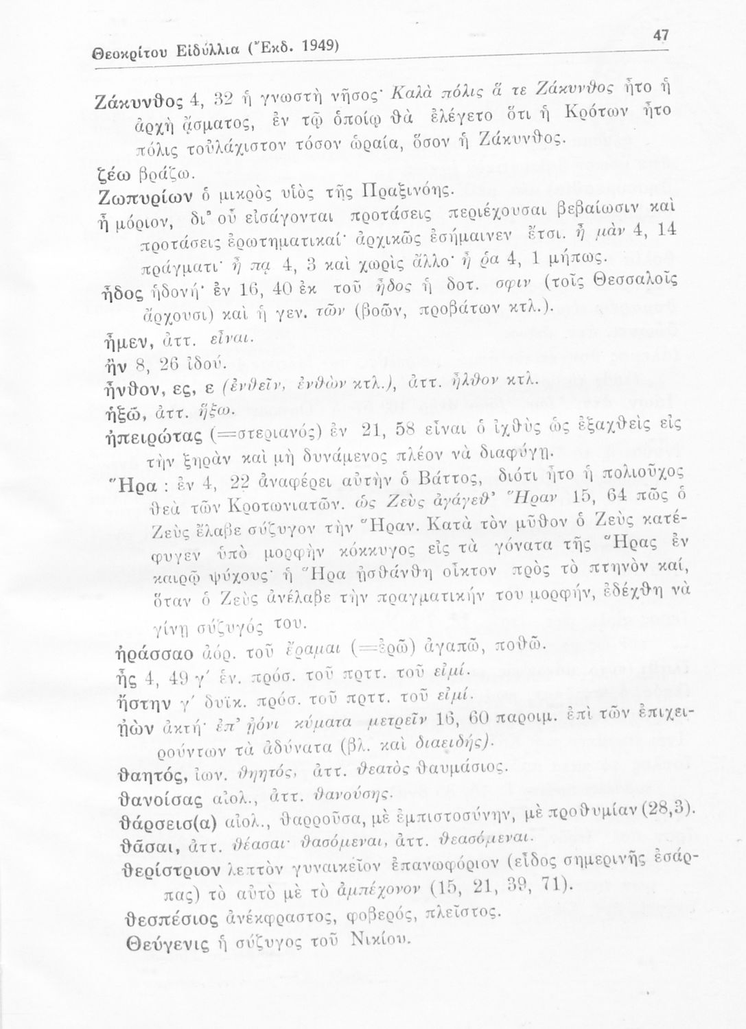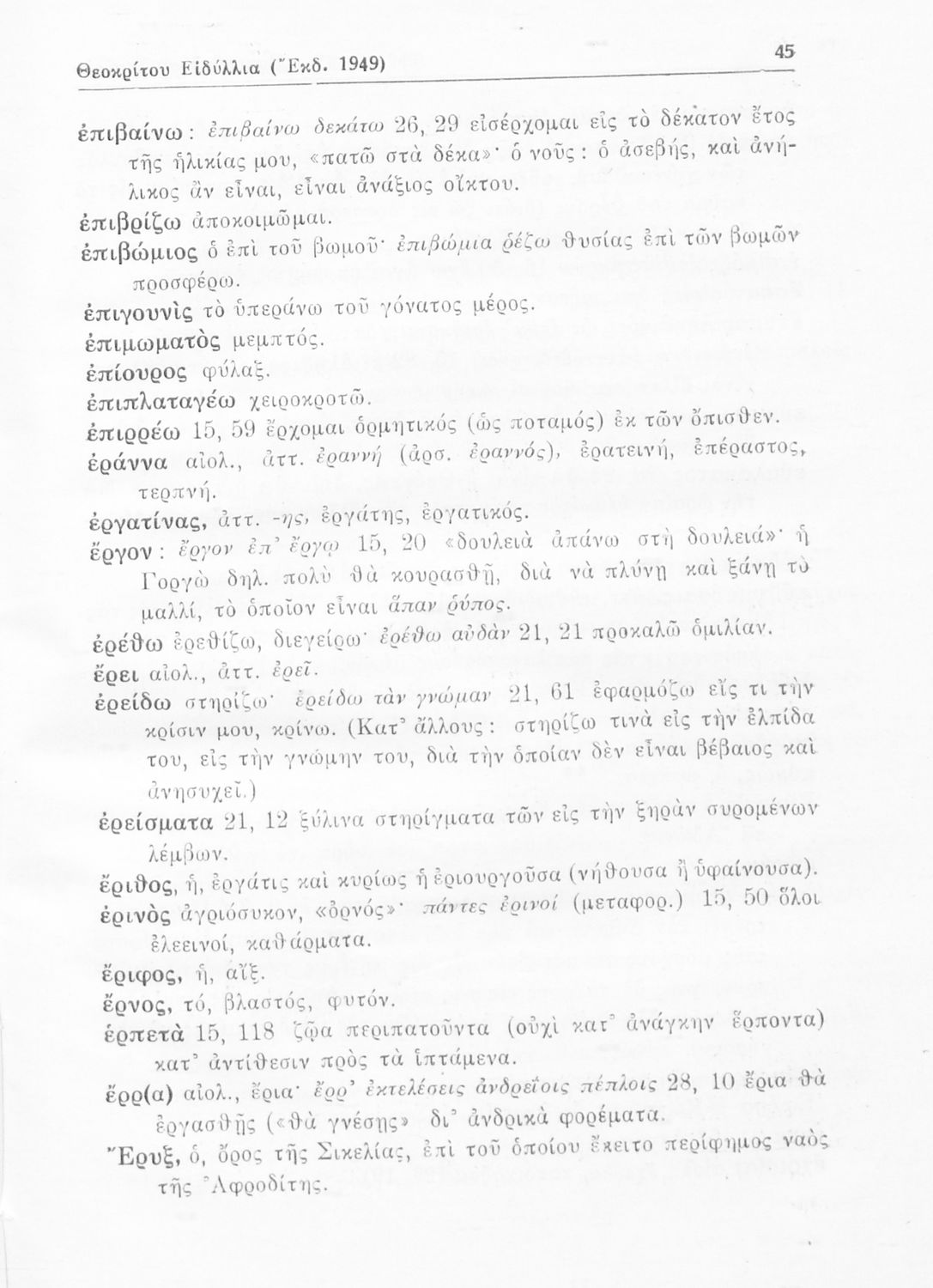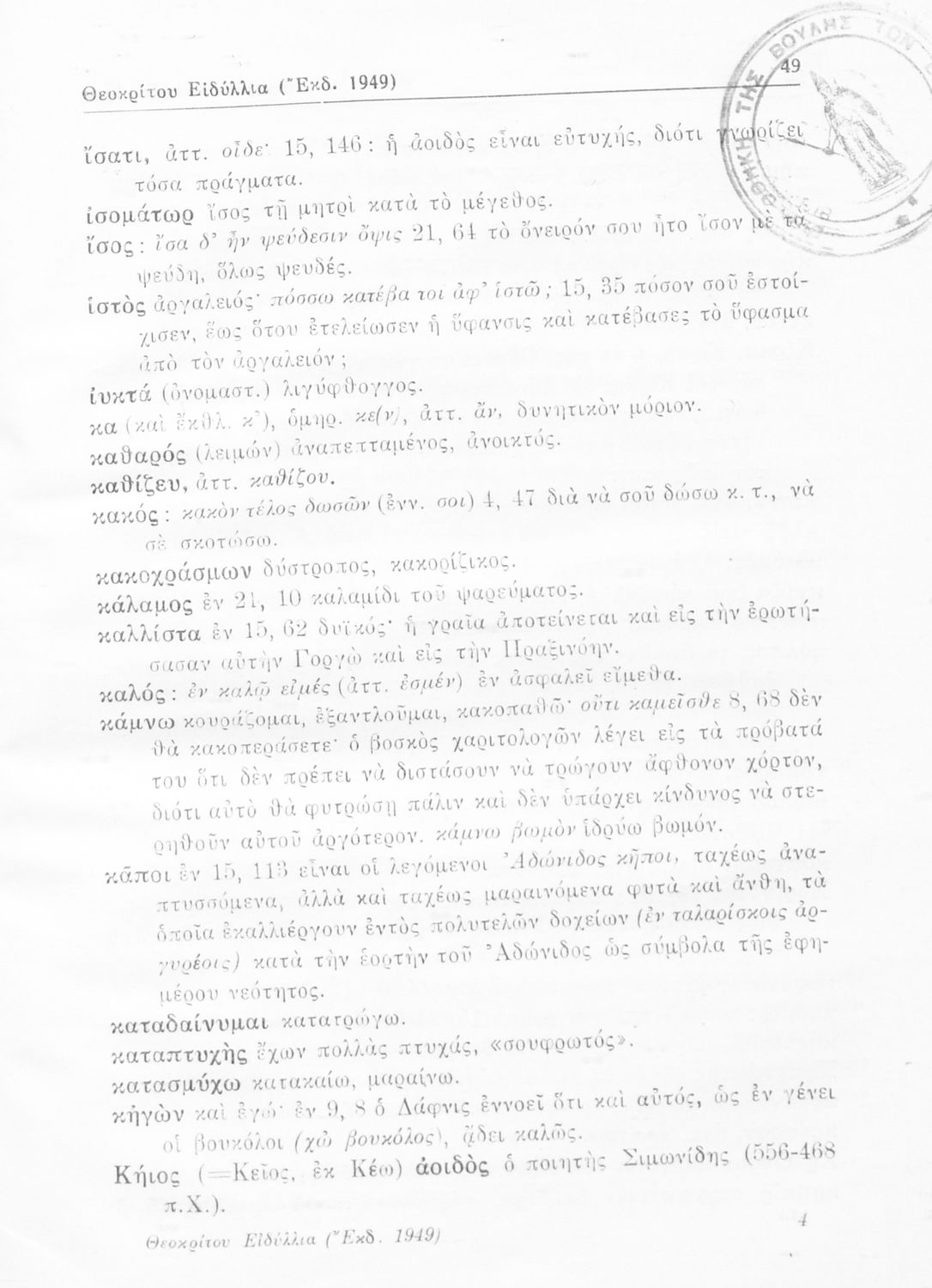 Σχολικό εγχειρίδιο Αρχαίων Ελληνικών Δ΄ Γυμνασίου που περιλαμβάνει τα Ειδύλλλια του Θεοκρίτου, και πραγματολογικές και λεξιλογικές παρατηρήσεις. Ο συγγραφέας ήταν διδάκτωρ Φιλολογίας.