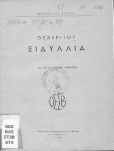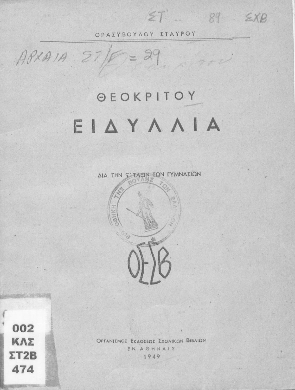 Σχολικό εγχειρίδιο Αρχαίων Ελληνικών ΣΤ΄ Γυμνασίου που περιέχει τα Ειδύλλια του Θεόκριτου, την υπόθεση του έργου, ερμηνευτικά και πραγματολογικά σχόλια και λεξιλογικές παρατηρήσεις.
