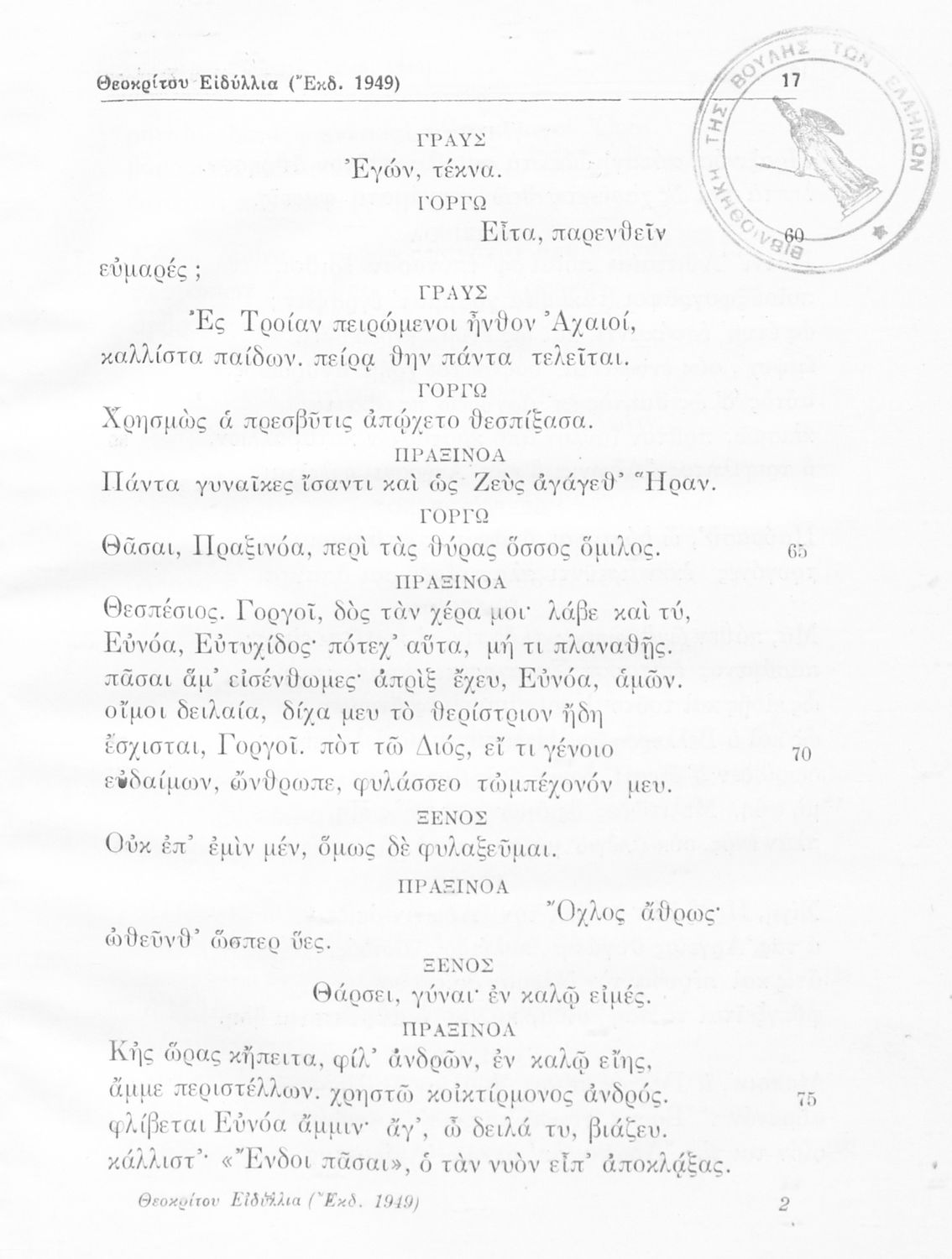 Συγγραφέας: Θεόκριτος, Θρασύβουλος Σταύρου (σχόλια)