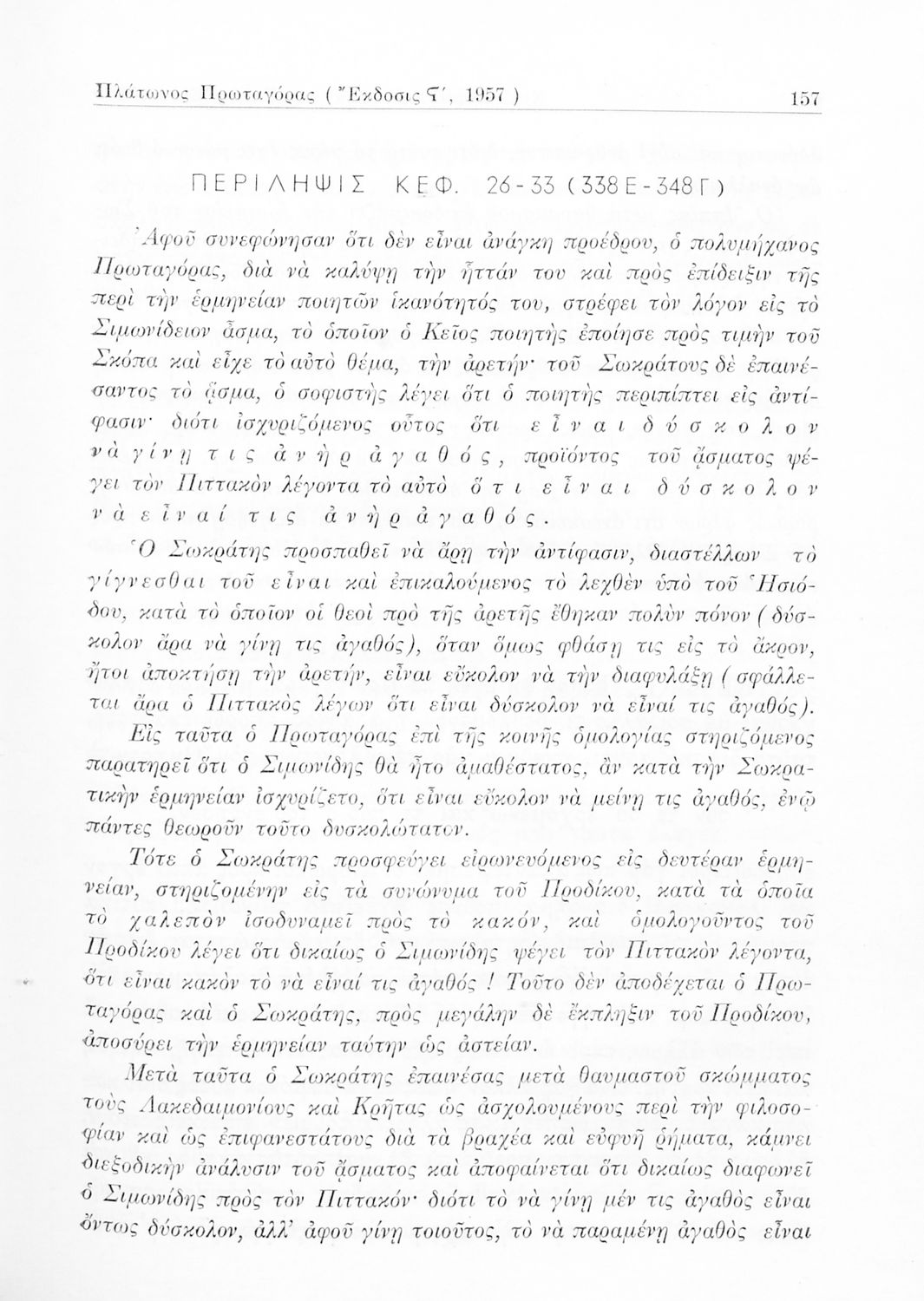 Σχολικό εγχειρίδιο για τις Τάξεις του Γυμνασίου για το μάθημα των Αρχαίων Ελληνικών. Περιλαμβάνει το πρωτότυπο κείμενο από τους διάλογοι του Πλάτωνα. Πρόκειται για φιλοσοφικούς λόγους του Φαίδωνα και του Πρωταγόρα. Περιλαμβάνει ερμηνευτικές, πραγματολογικές και λεξιλογικές παρατηρήσεις του συγγραφέα.