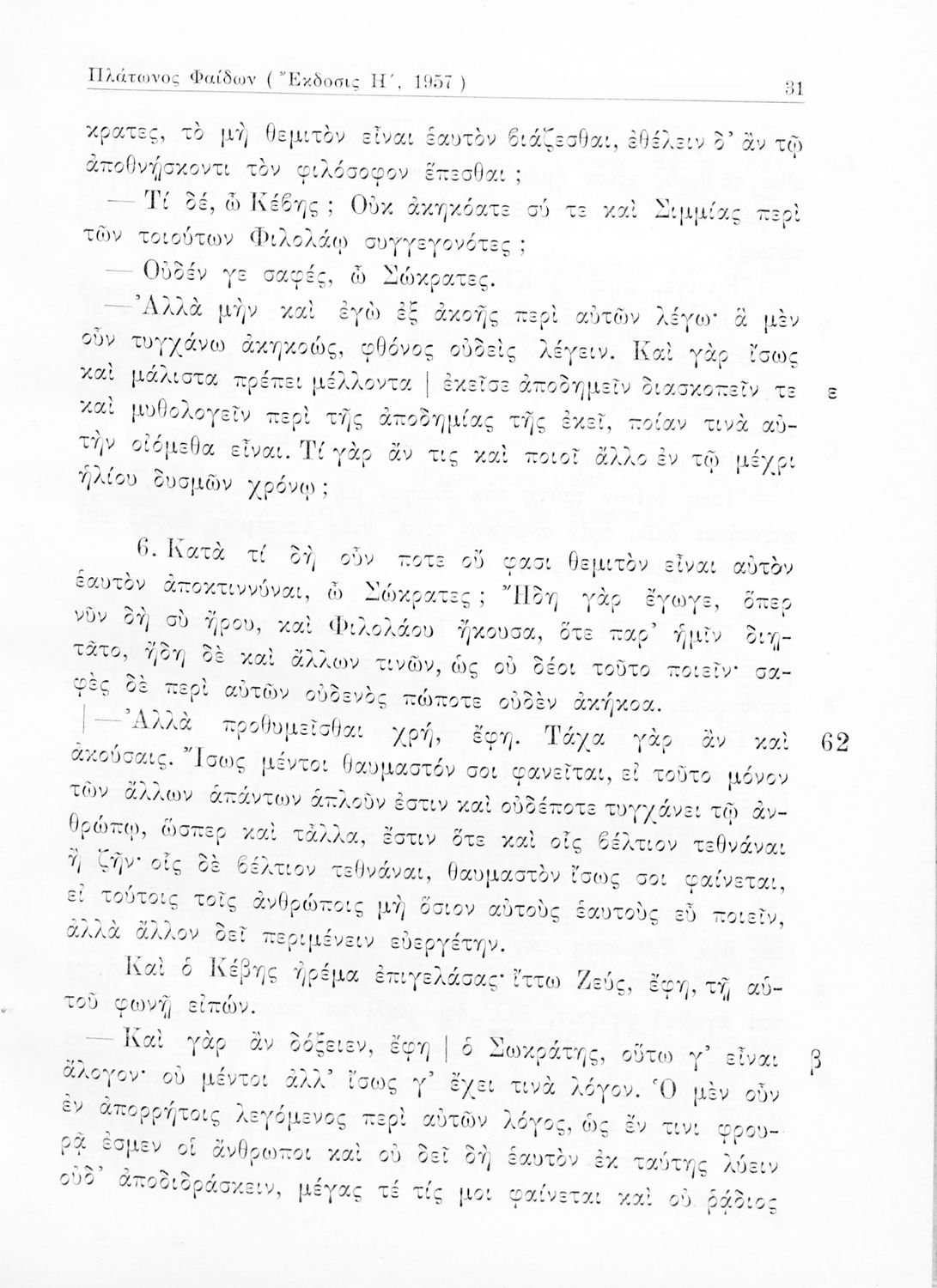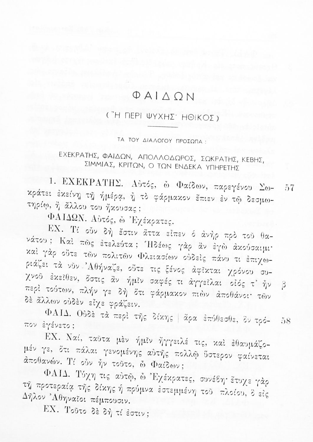 Σχολικό εγχειρίδιο για τις Τάξεις του Γυμνασίου για το μάθημα των Αρχαίων Ελληνικών. Περιλαμβάνει το πρωτότυπο κείμενο από τους διάλογοι του Πλάτωνα. Πρόκειται για φιλοσοφικούς λόγους του Φαίδωνα και του Πρωταγόρα. Περιλαμβάνει ερμηνευτικές, πραγματολογικές και λεξιλογικές παρατηρήσεις του συγγραφέα.