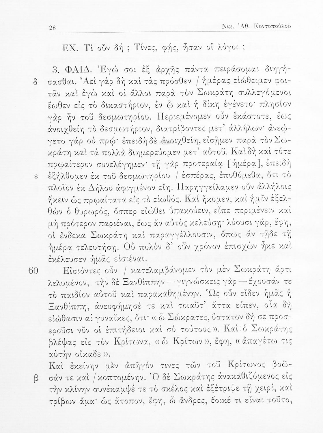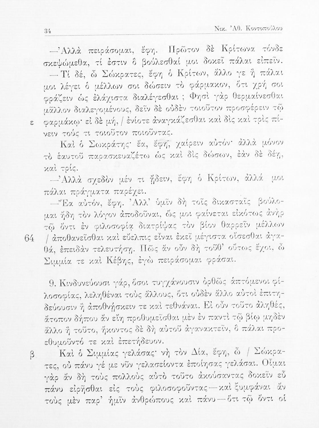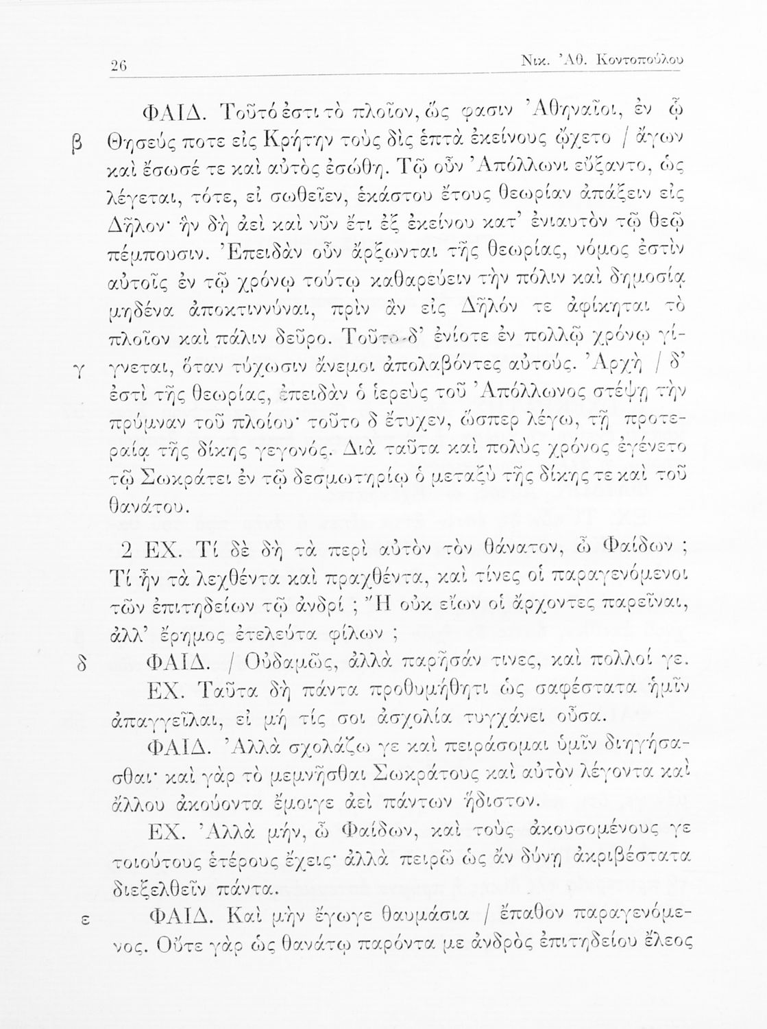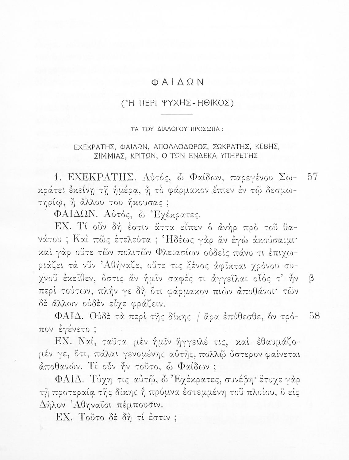 520 ## _aΣχολικό εγχειρίδιο Αρχαίων Ελληνικών του Γυμνασίου. Το βιβλίο παρουσιάζει δύο έργα του Πλάτωνα, Φαίδων και Πρωταγόρας. Το βιβλίο αρχίζει με μια εισαγωγή στην εποχή και το έργο του Πλάτωνα. Στη συνέχεια παρουσιάζει τα κείμενα από το πρωτότυπο και ολοκληρώνει με λεξιλογικές και ερμηνευτικές αναλύσεις