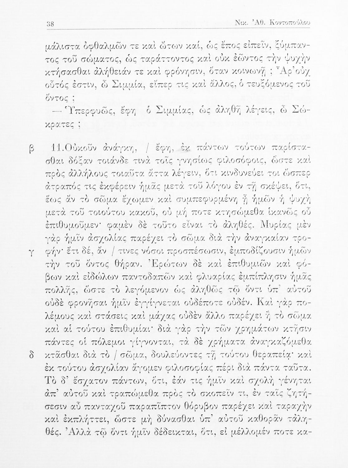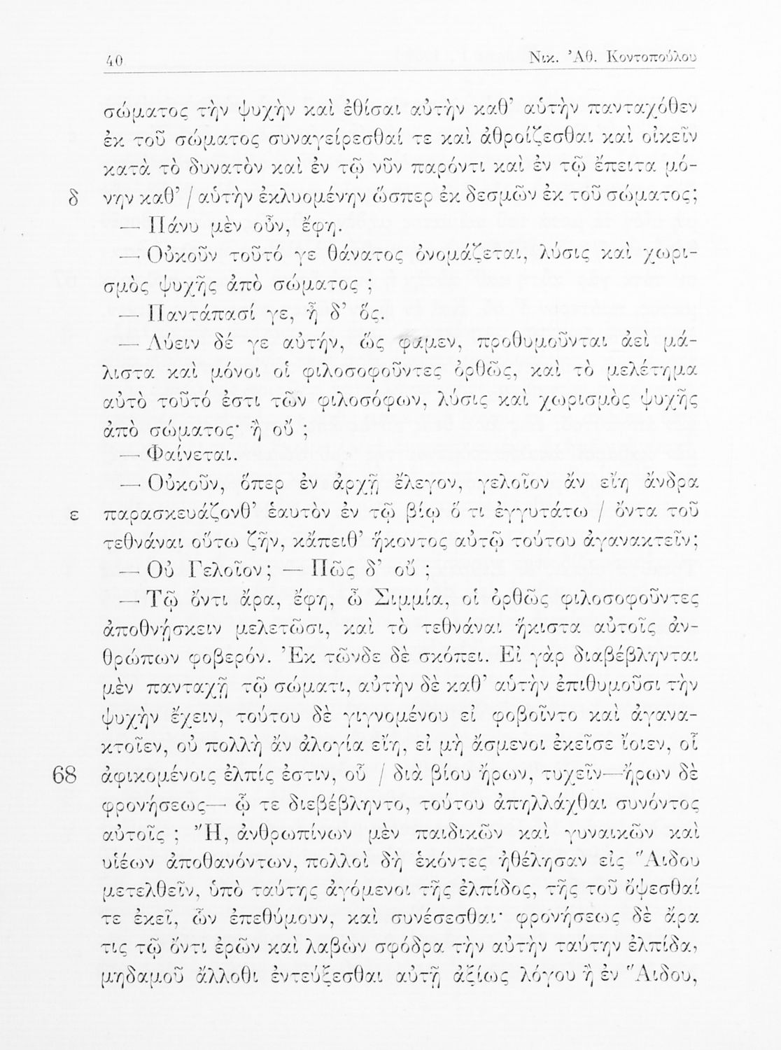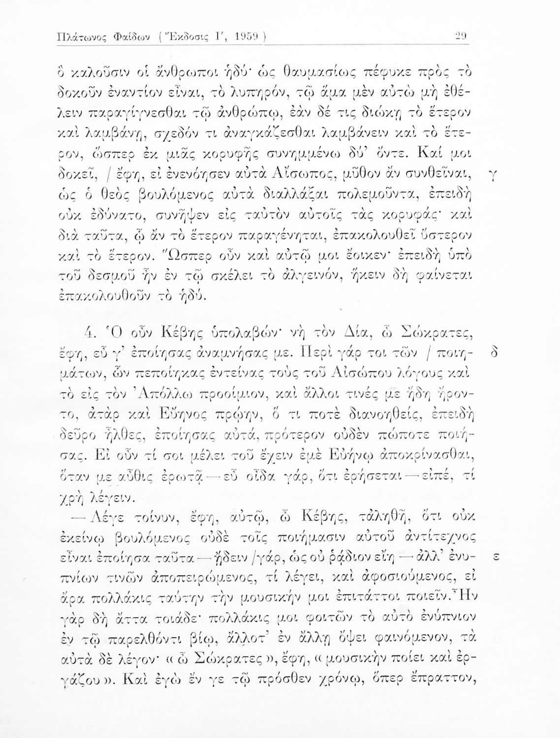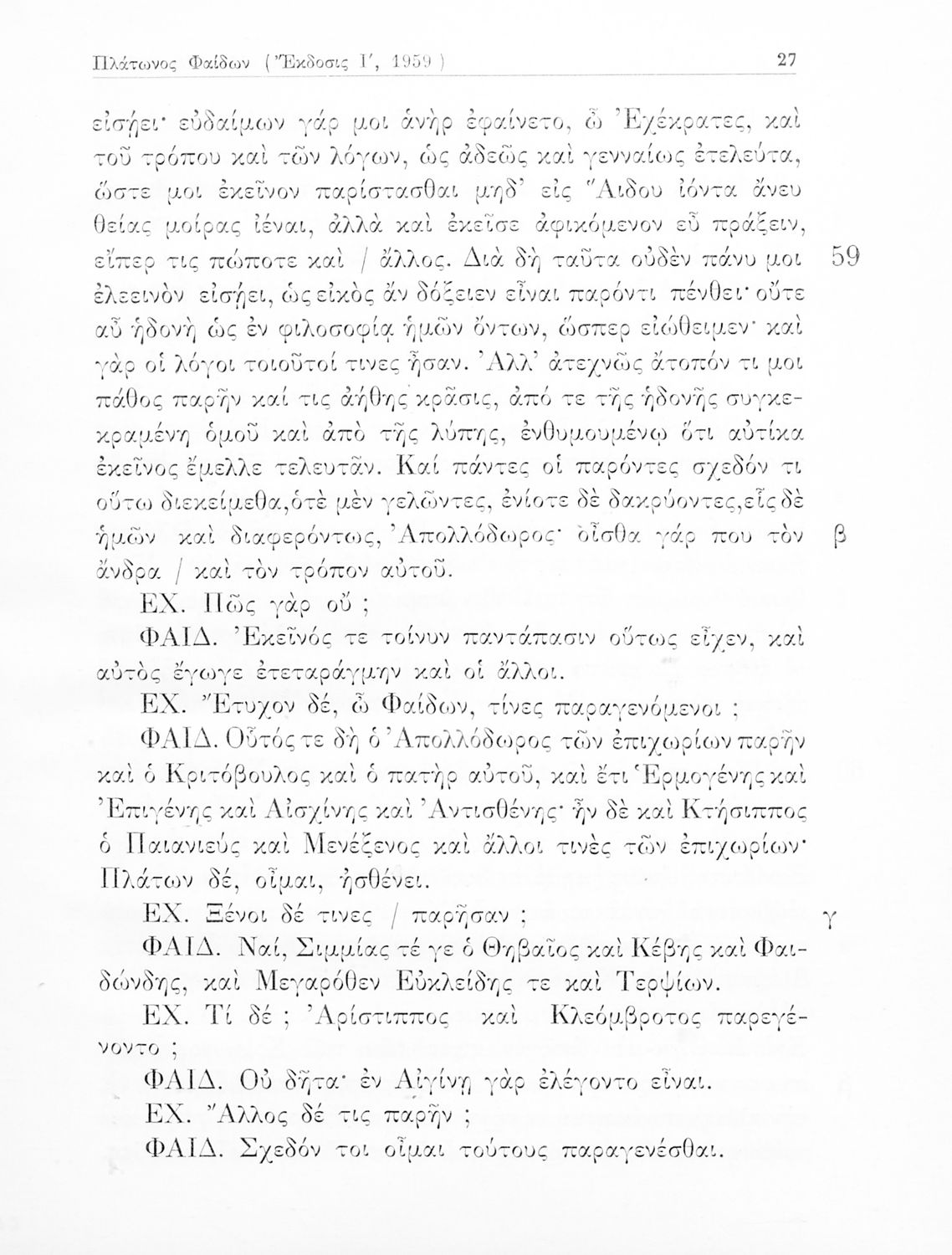 520 ## _aΣχολικό εγχειρίδιο Αρχαίων Ελληνικών του Γυμνασίου. Το βιβλίο παρουσιάζει δύο έργα του Πλάτωνα, Φαίδων και Πρωταγόρας. Το βιβλίο αρχίζει με μια εισαγωγή στην εποχή και το έργο του Πλάτωνα. Στη συνέχεια παρουσιάζει τα κείμενα από το πρωτότυπο και ολοκληρώνει με λεξιλογικές και ερμηνευτικές αναλύσεις