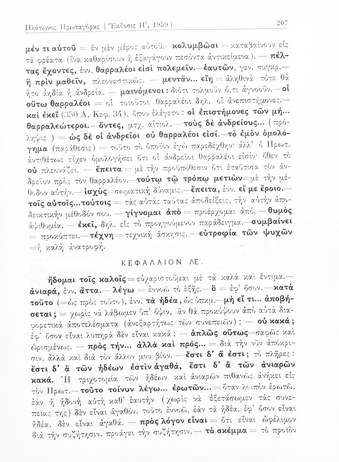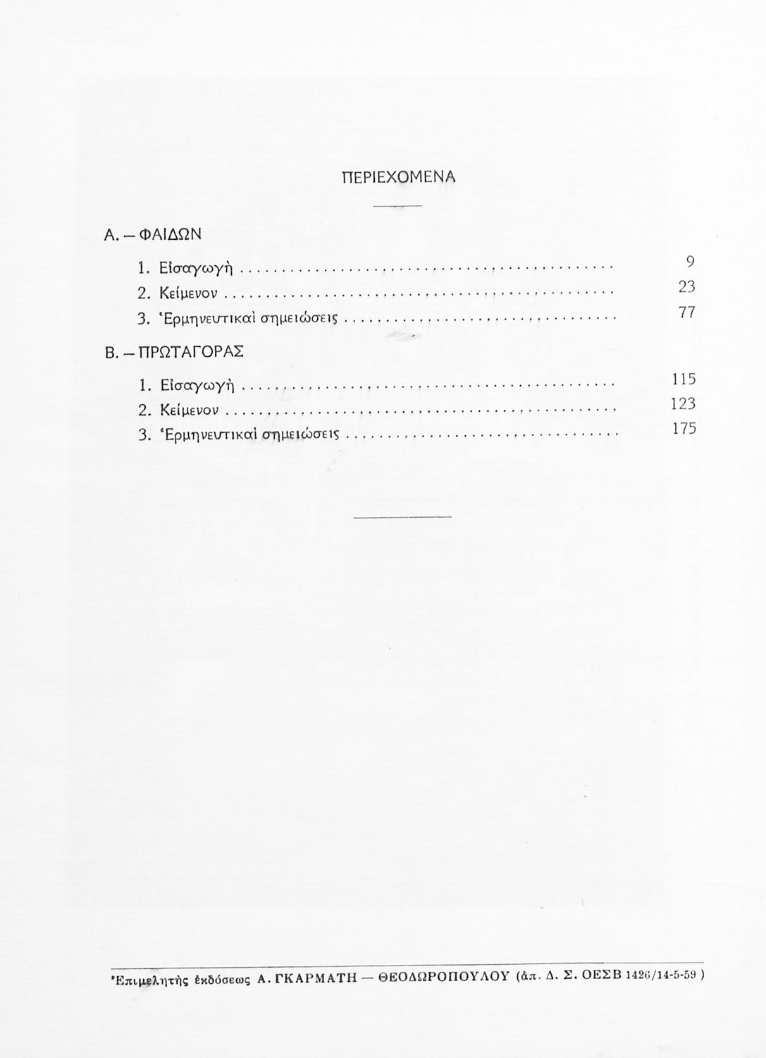 Σχολικό εγχειρίδιο Αρχαίων Ελληνικών του Γυμνασίου. Το βιβλίο παρουσιάζει δύο έργα του Πλάτωνα, Φαίδων και Πρωταγόρας. Το βιβλίο αρχίζει με μια εισαγωγή στην εποχή και το έργο του Πλάτωνα. Στη συνέχεια παρουσιάζει τα κείμενα από το πρωτότυπο και ολοκληρώνει με λεξιλογικές και ερμηνευτικές αναλύσεις