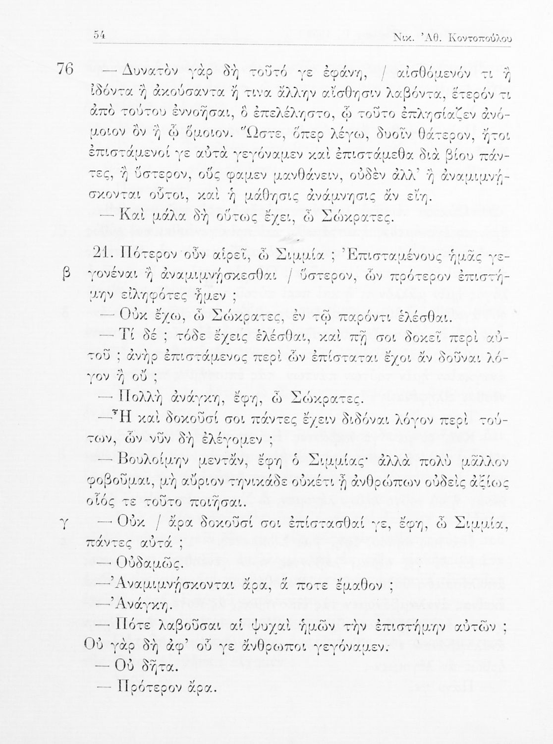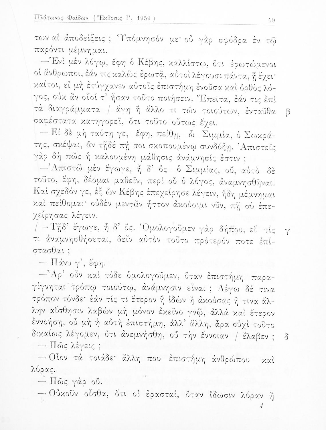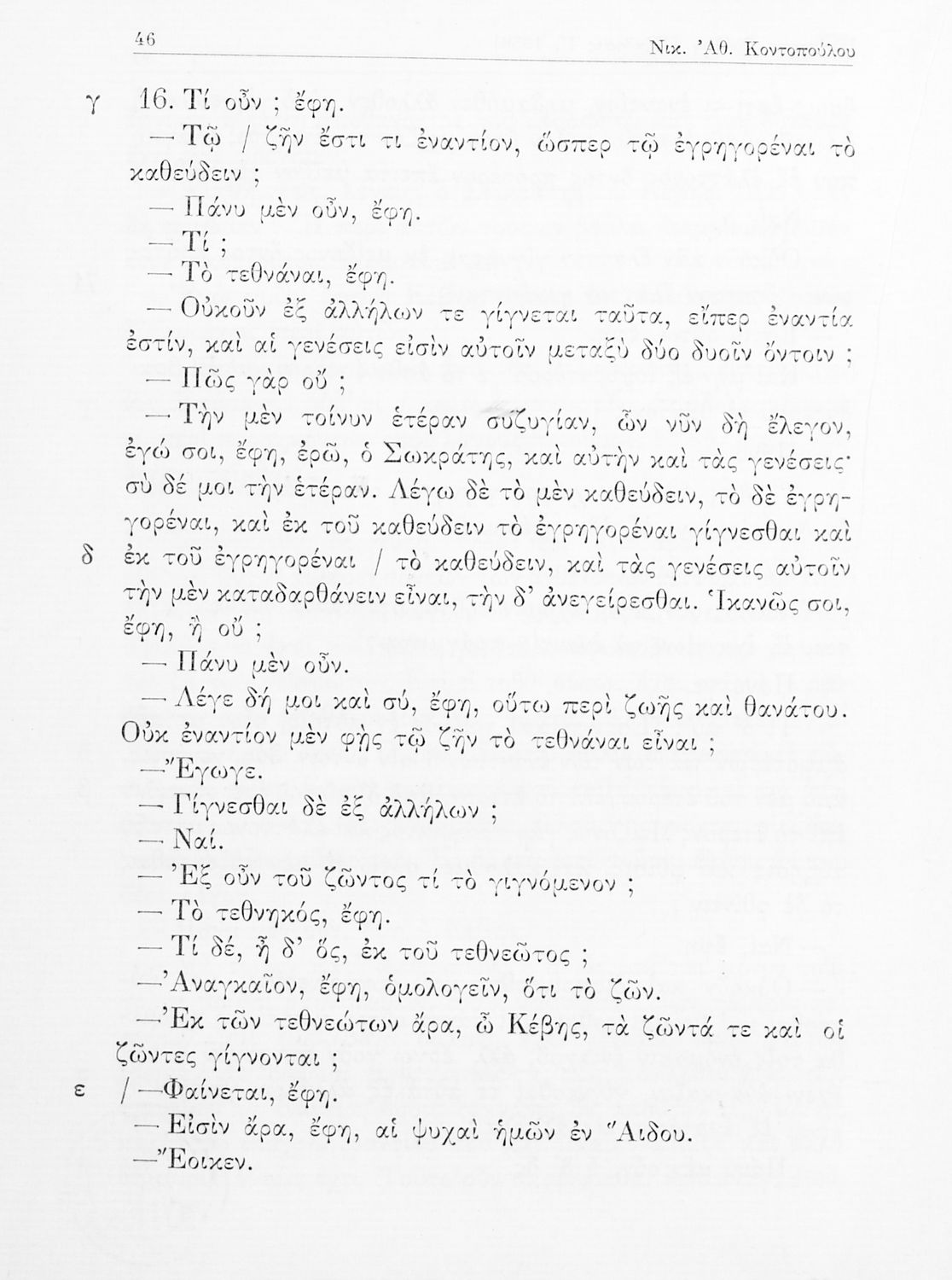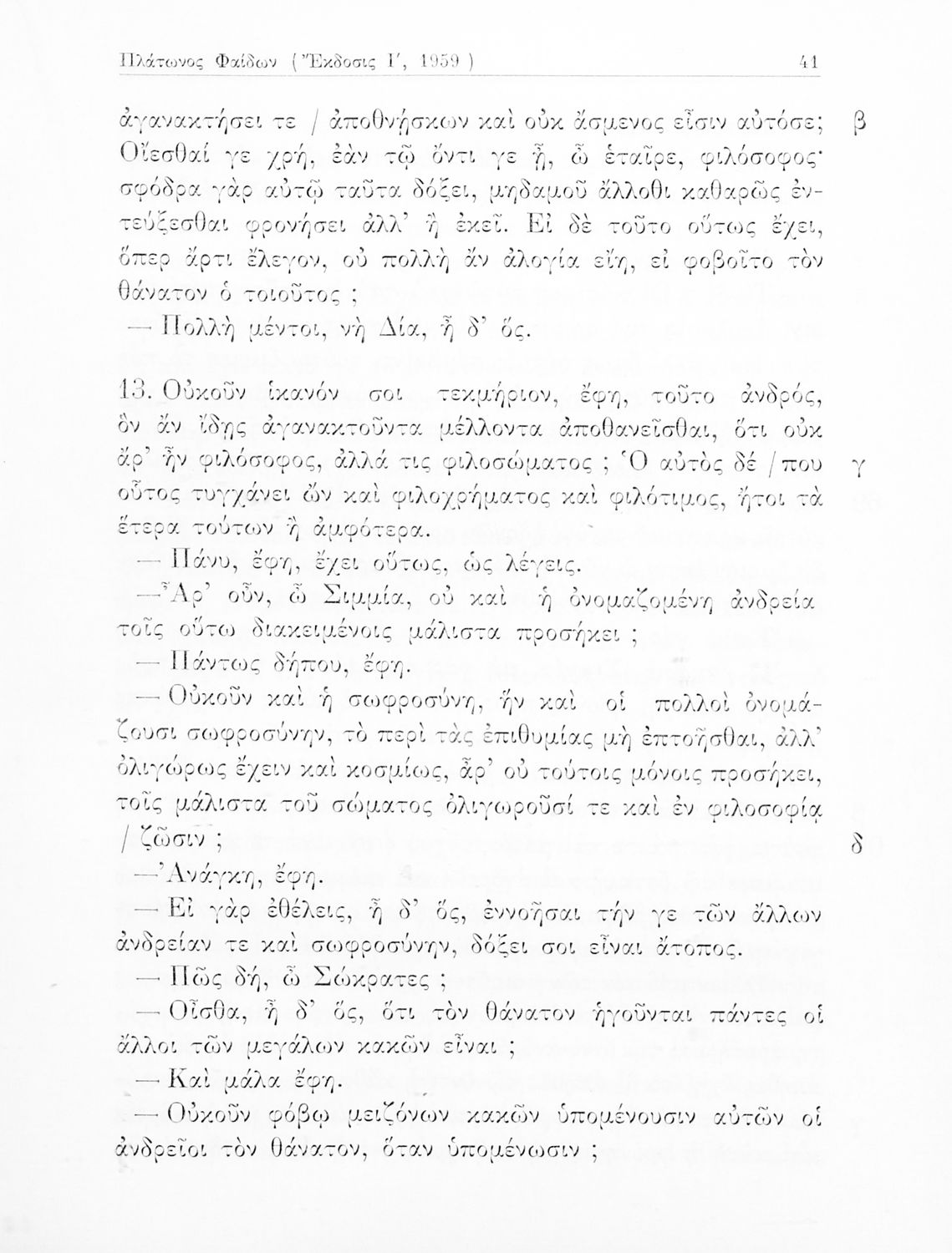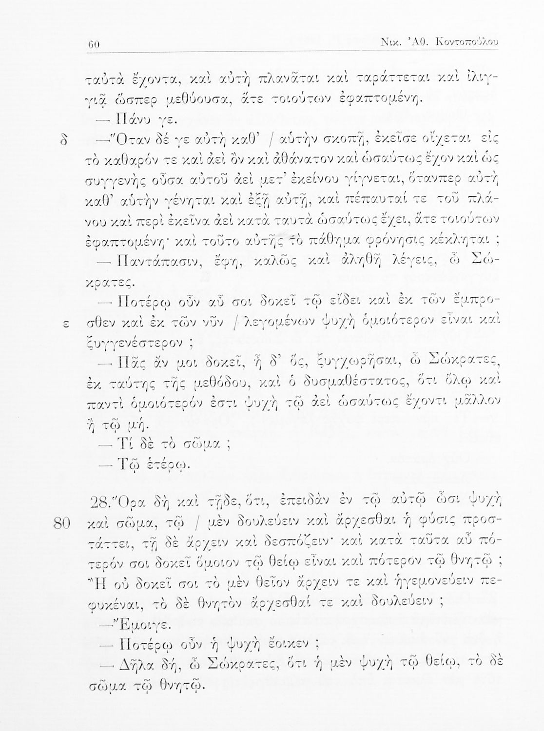 520 ## _aΣχολικό εγχειρίδιο Αρχαίων Ελληνικών του Γυμνασίου. Το βιβλίο παρουσιάζει δύο έργα του Πλάτωνα, Φαίδων και Πρωταγόρας. Το βιβλίο αρχίζει με μια εισαγωγή στην εποχή και το έργο του Πλάτωνα. Στη συνέχεια παρουσιάζει τα κείμενα από το πρωτότυπο και ολοκληρώνει με λεξιλογικές και ερμηνευτικές αναλύσεις