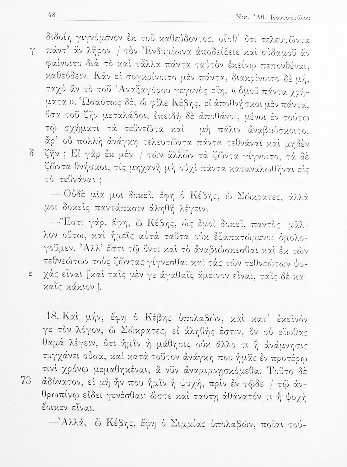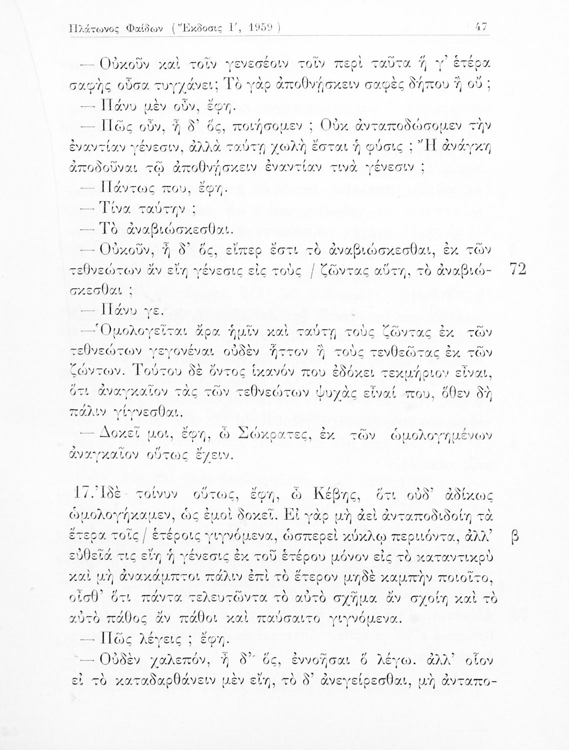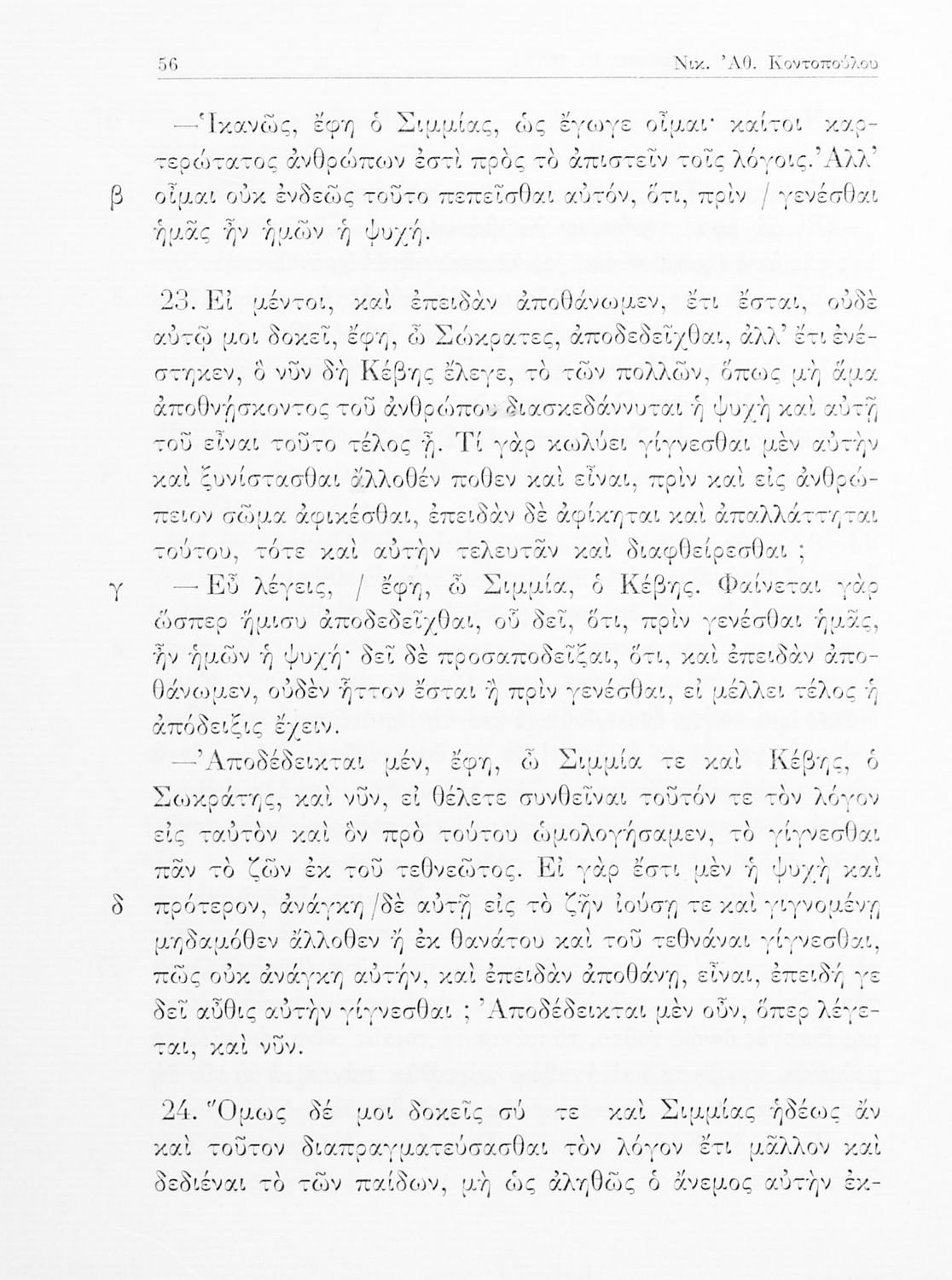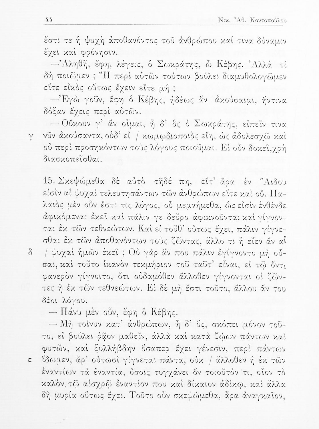 520 ## _aΣχολικό εγχειρίδιο Αρχαίων Ελληνικών του Γυμνασίου. Το βιβλίο παρουσιάζει δύο έργα του Πλάτωνα, Φαίδων και Πρωταγόρας. Το βιβλίο αρχίζει με μια εισαγωγή στην εποχή και το έργο του Πλάτωνα. Στη συνέχεια παρουσιάζει τα κείμενα από το πρωτότυπο και ολοκληρώνει με λεξιλογικές και ερμηνευτικές αναλύσεις