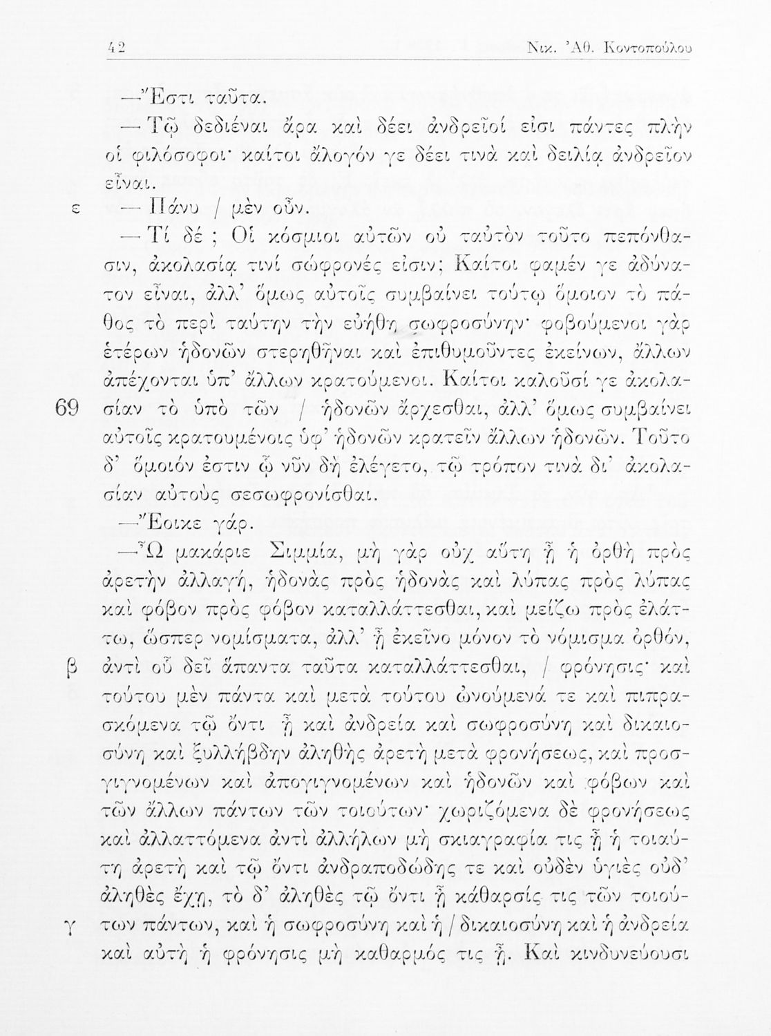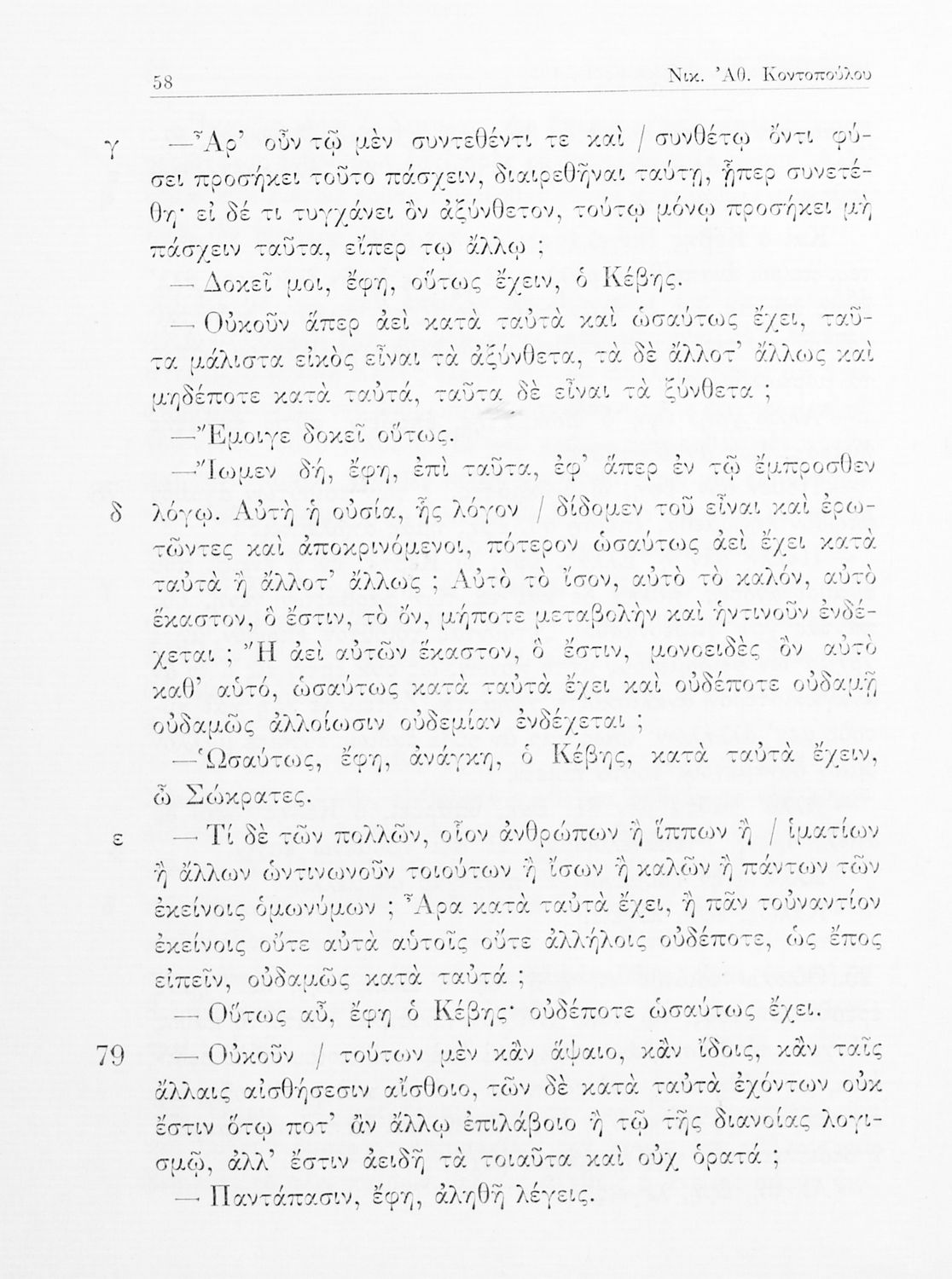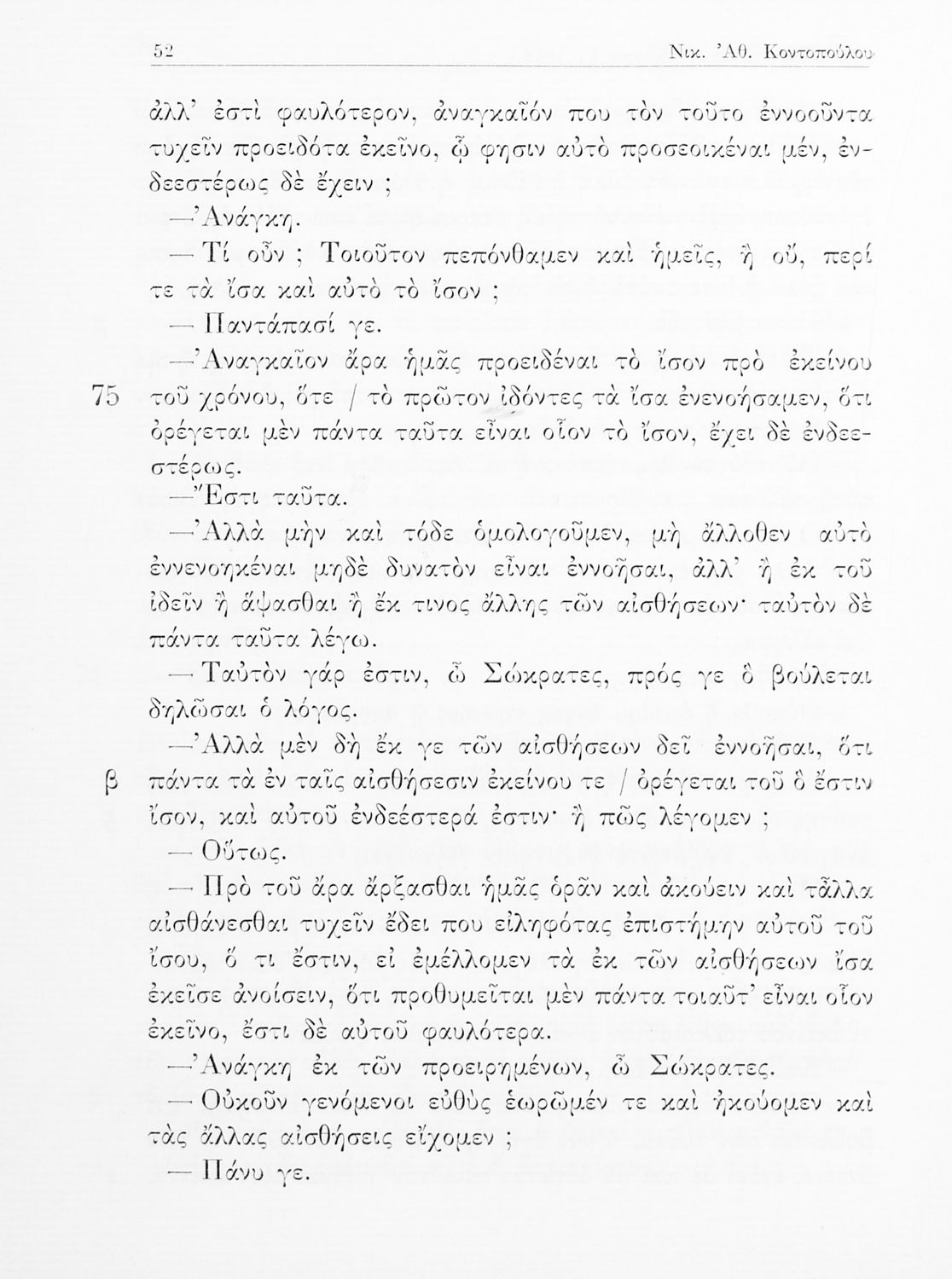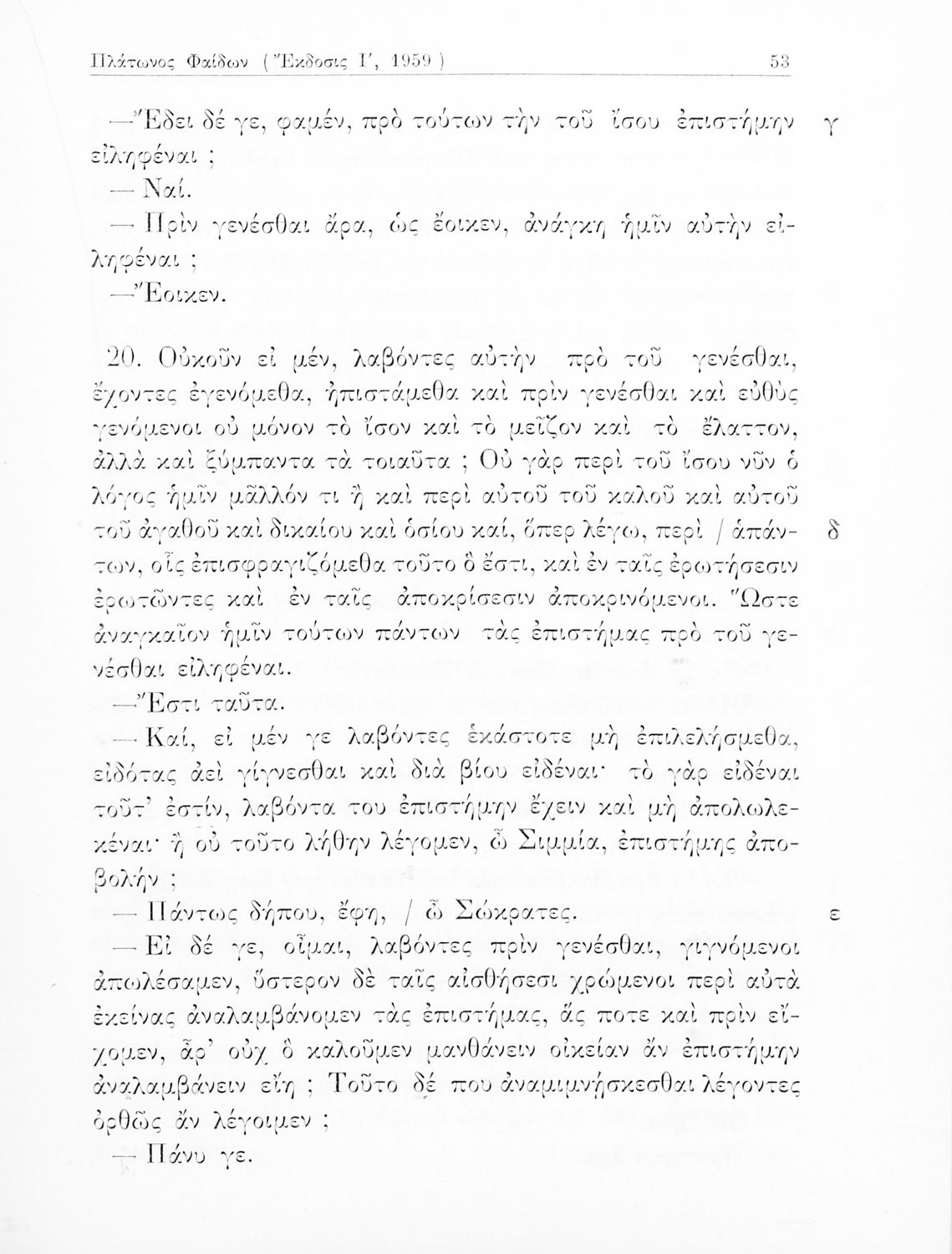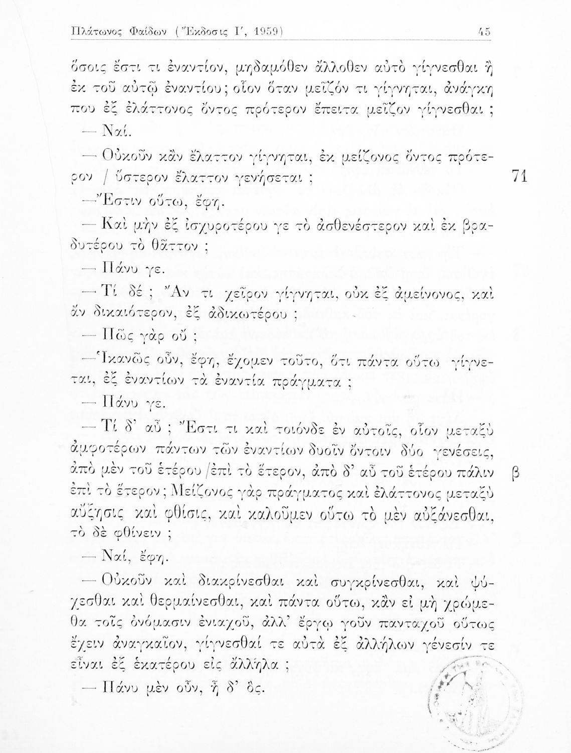 520 ## _aΣχολικό εγχειρίδιο Αρχαίων Ελληνικών του Γυμνασίου. Το βιβλίο παρουσιάζει δύο έργα του Πλάτωνα, Φαίδων και Πρωταγόρας. Το βιβλίο αρχίζει με μια εισαγωγή στην εποχή και το έργο του Πλάτωνα. Στη συνέχεια παρουσιάζει τα κείμενα από το πρωτότυπο και ολοκληρώνει με λεξιλογικές και ερμηνευτικές αναλύσεις
