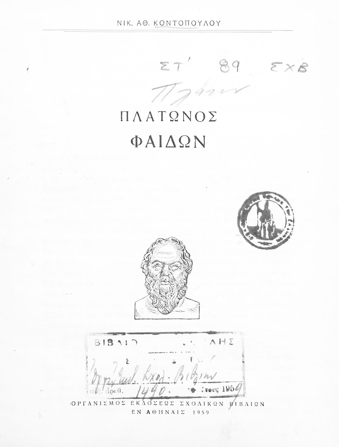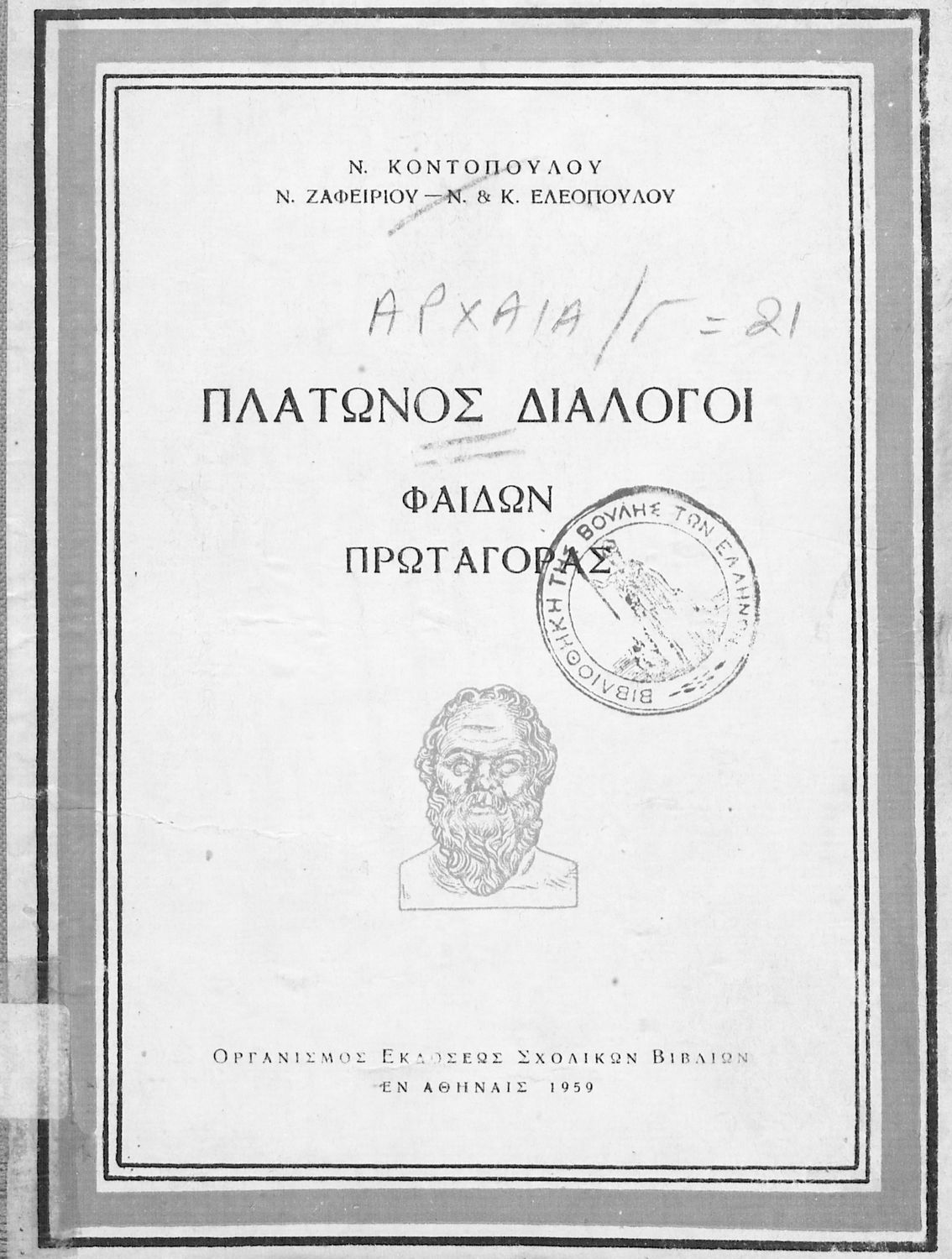 Σχολικό εγχειρίδιο Αρχαίων Ελληνικών της Δευτεροβάθμιας Εκπαίδευσης. Το βιβλίο περιέχει δύο έργα του Πλάτωνα, Φαίδων και Πρωταγόρας, όπου ο Σωκράτης συνομιλεί για την έννοια και τις ιδέες της φιλοσοφίας
