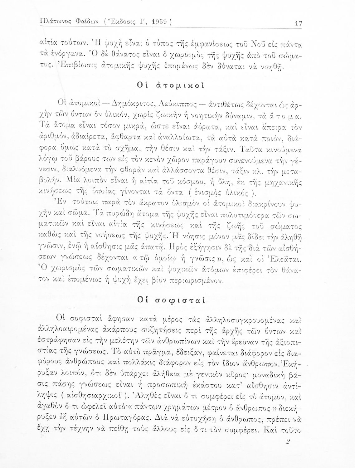 Σχολικό εγχειρίδιο Αρχαίων Ελληνικών του Γυμνασίου. Το βιβλίο παρουσιάζει δύο έργα του Πλάτωνα, Φαίδων και Πρωταγόρας. Το βιβλίο αρχίζει με μια εισαγωγή στην εποχή και το έργο του Πλάτωνα. Στη συνέχεια παρουσιάζει τα κείμενα από το πρωτότυπο και ολοκληρώνει με λεξιλογικές και ερμηνευτικές αναλύσεις