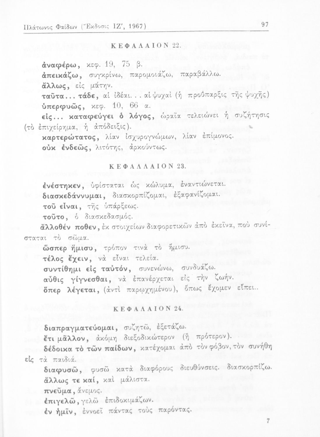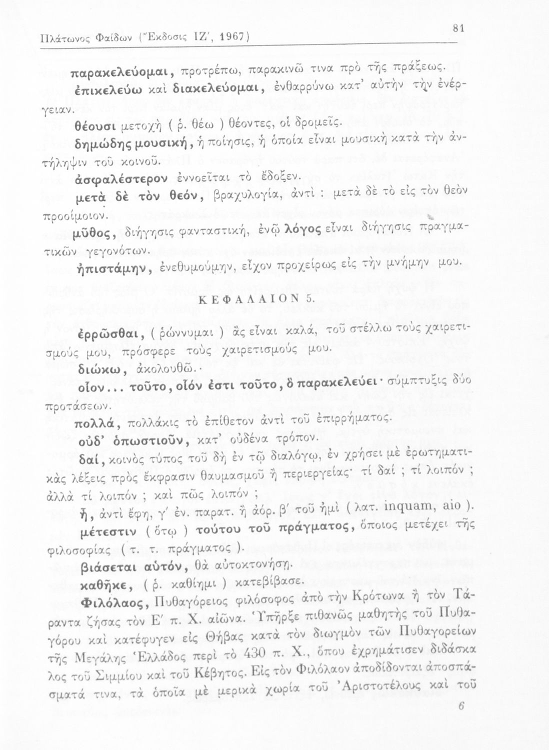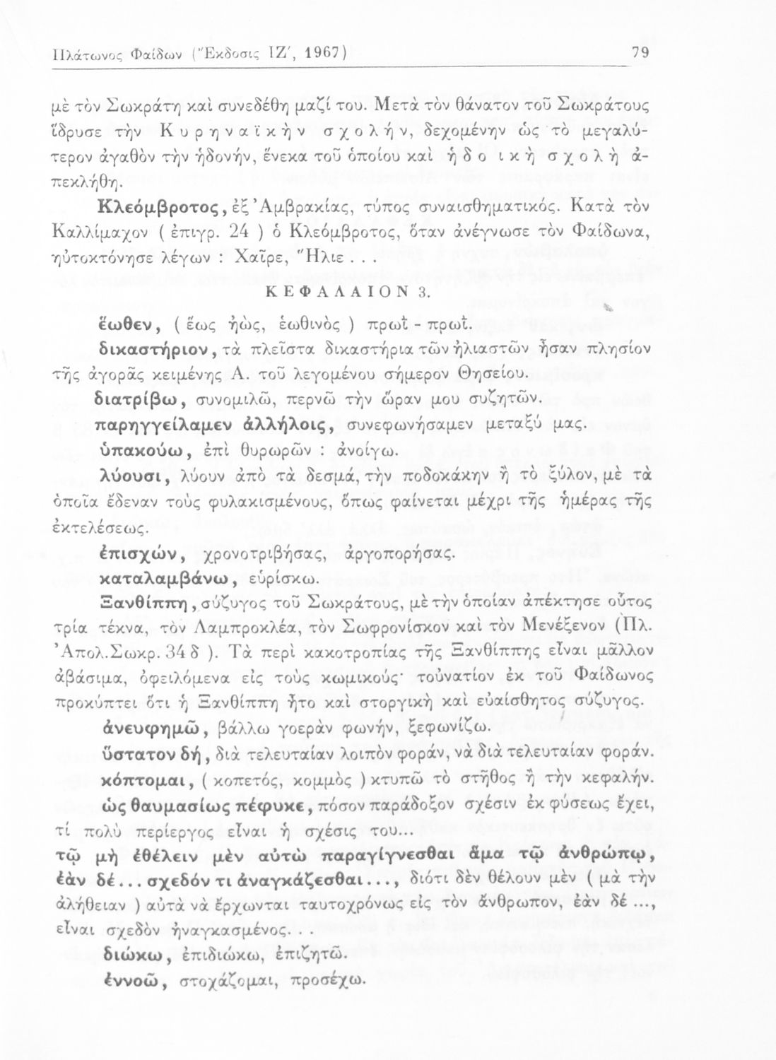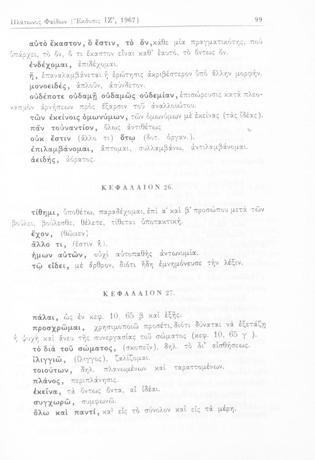 Βαθμίδα εκπαίδευσης: Δευτεροβάθμια Τάξη: Γ' Λυκείου Μάθημα: Αρχαία Ελληνικά Γλώσσα: Καθαρεύουσα Παρουσίαση περιεχομένου: Σχολικό εγχειρίδιο Αρχαίων Ελληνικών της Γ΄ Λυκείου. Το βιβλίο περιέχει δύο έργα του Πλάτωνα, Φαίδων και Πρωταγόρας, όπου ο Σωκράτης συνομιλεί για την έννοια και τις ιδέες της φιλοσοφίας |