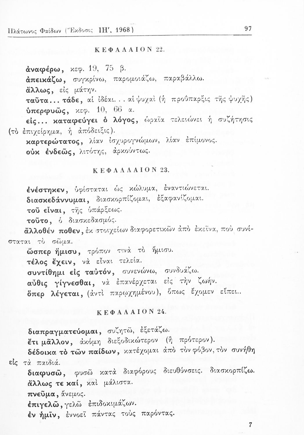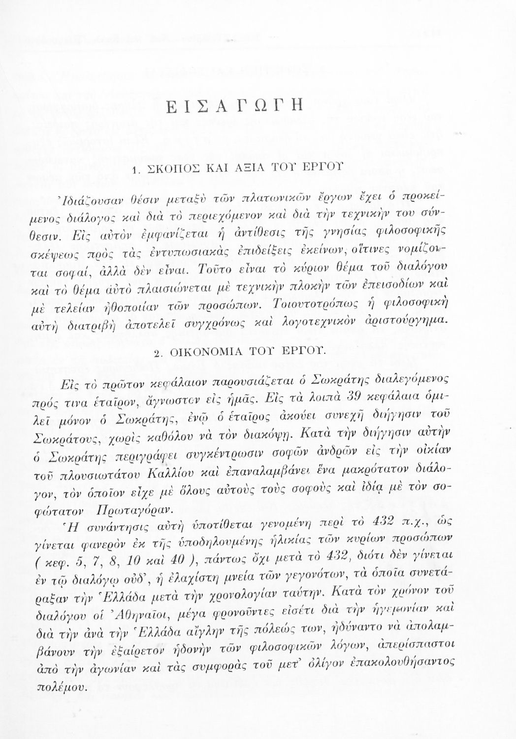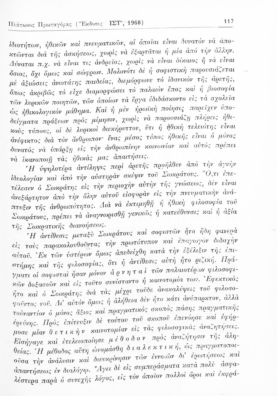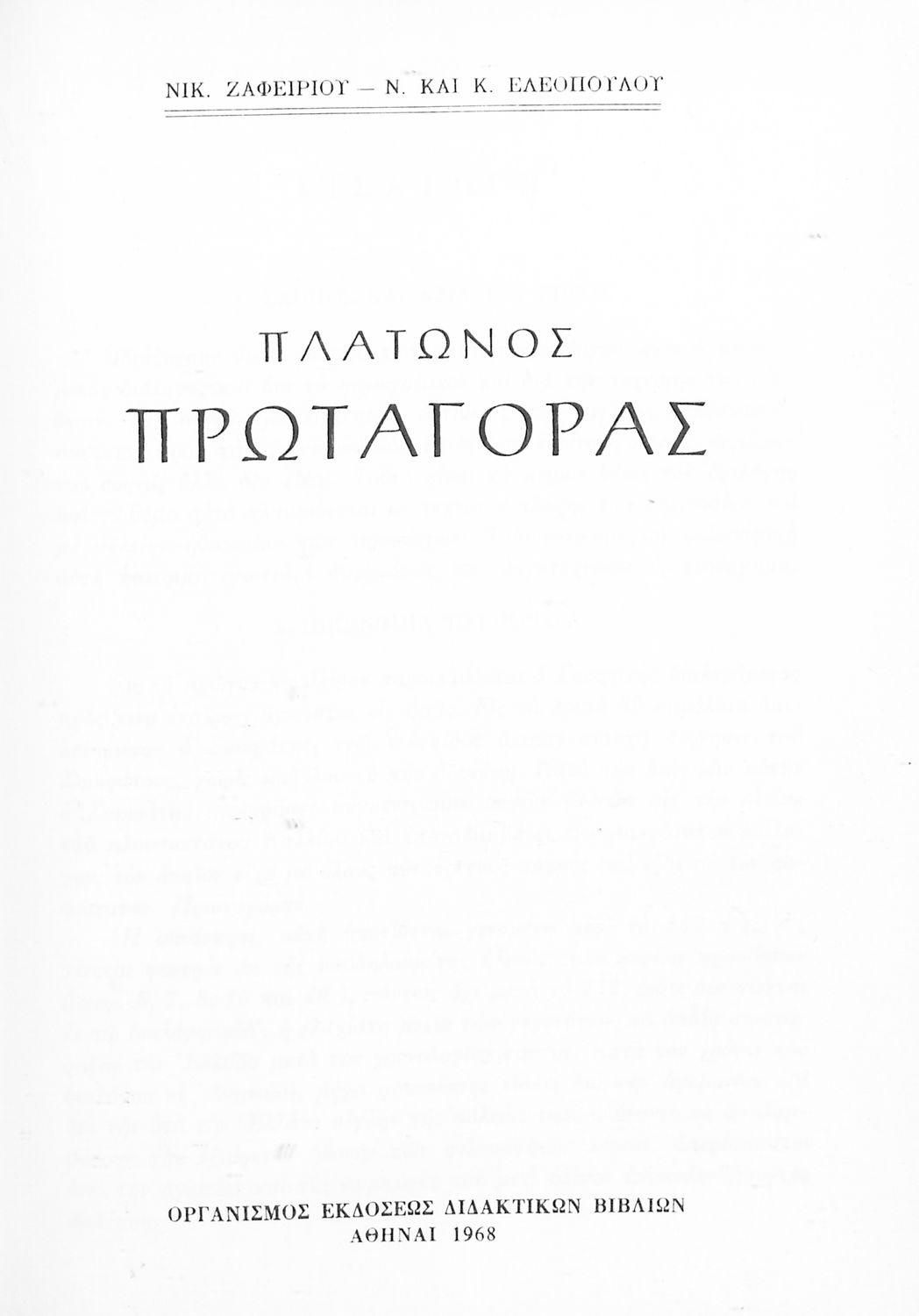 Βαθμίδα εκπαίδευσης: Δευτεροβάθμια Μάθημα: Αρχαία Ελληνικά Γλώσσα: Καθαρεύουσα Παρουσίαση περιεχομένου: Σχολικό εγχειρίδιο Αρχαίων Ελληνικών της Δευτεροβάθμιας Εκπαίδευσης. Το βιβλίο περιέχει δύο έργα του Πλάτωνα, Φαίδων και Πρωταγόρας, όπου ο Σωκράτης συνομιλεί για την έννοια και τις ιδέες της φιλοσοφίας |