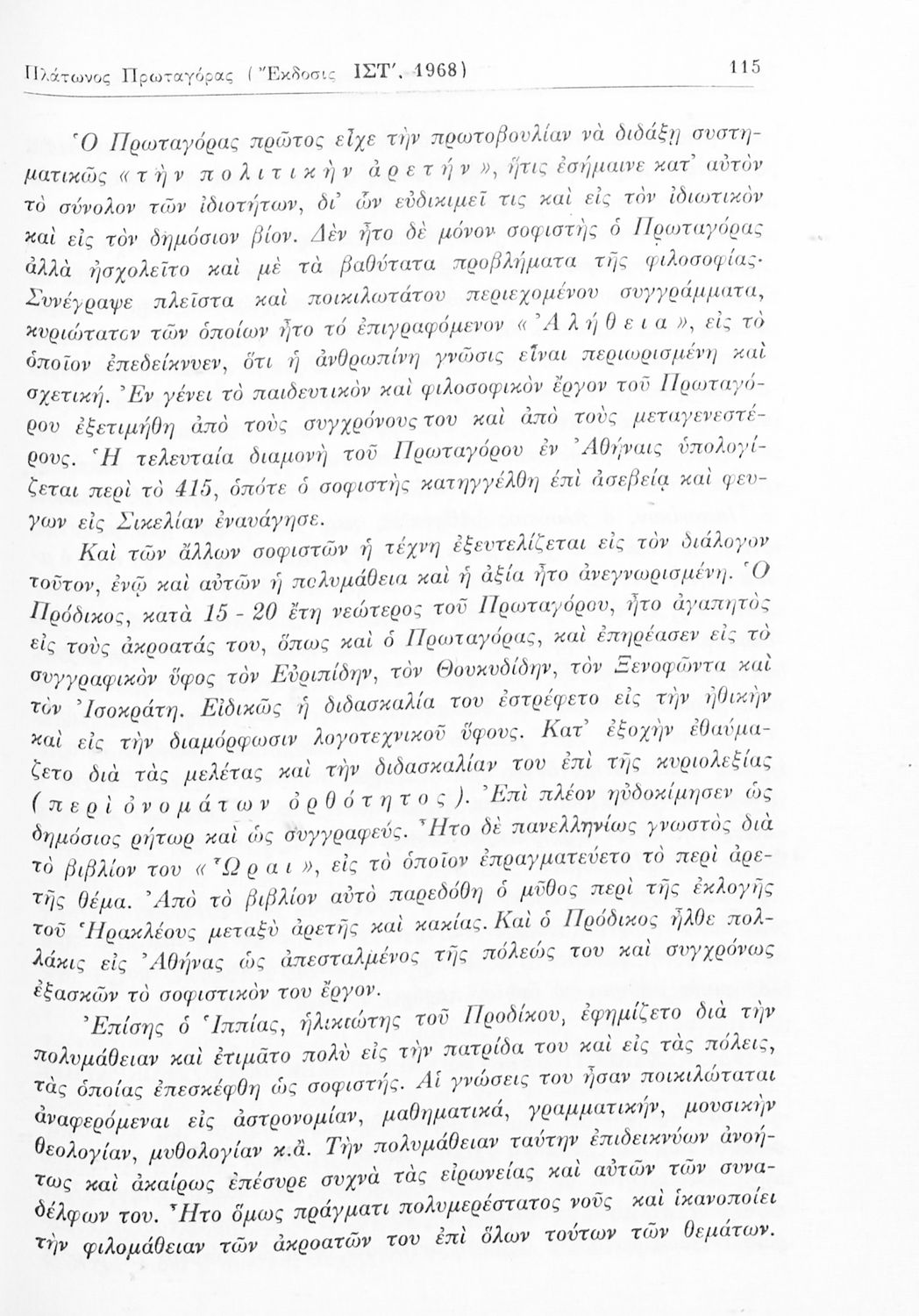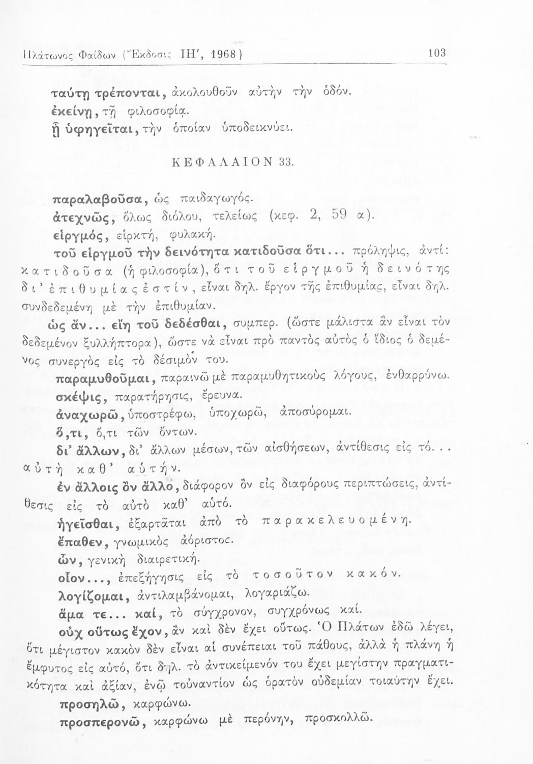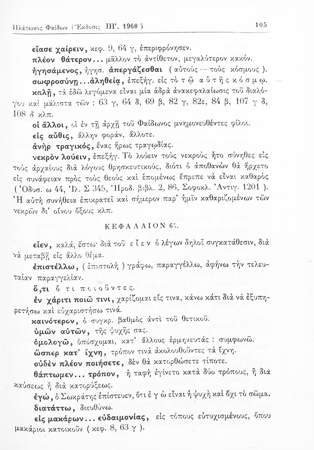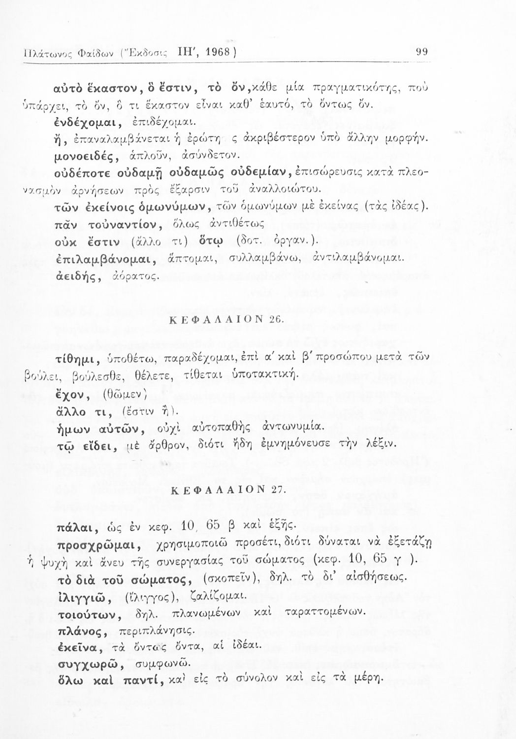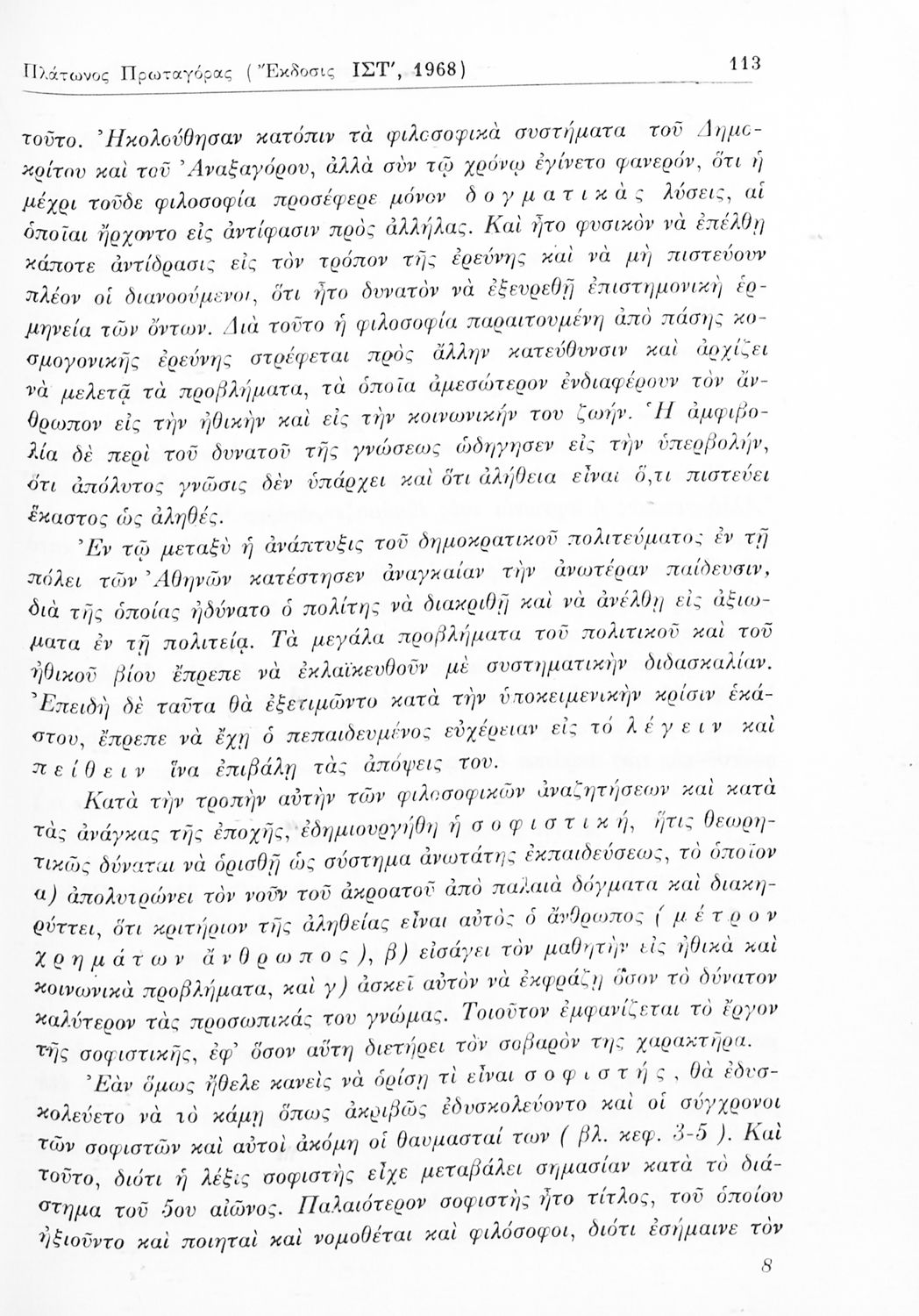 Βαθμίδα εκπαίδευσης: Δευτεροβάθμια Μάθημα: Αρχαία Ελληνικά Γλώσσα: Καθαρεύουσα Παρουσίαση περιεχομένου: Σχολικό εγχειρίδιο Αρχαίων Ελληνικών της Δευτεροβάθμιας Εκπαίδευσης. Το βιβλίο περιέχει δύο έργα του Πλάτωνα, Φαίδων και Πρωταγόρας, όπου ο Σωκράτης συνομιλεί για την έννοια και τις ιδέες της φιλοσοφίας |