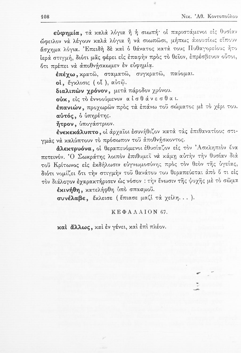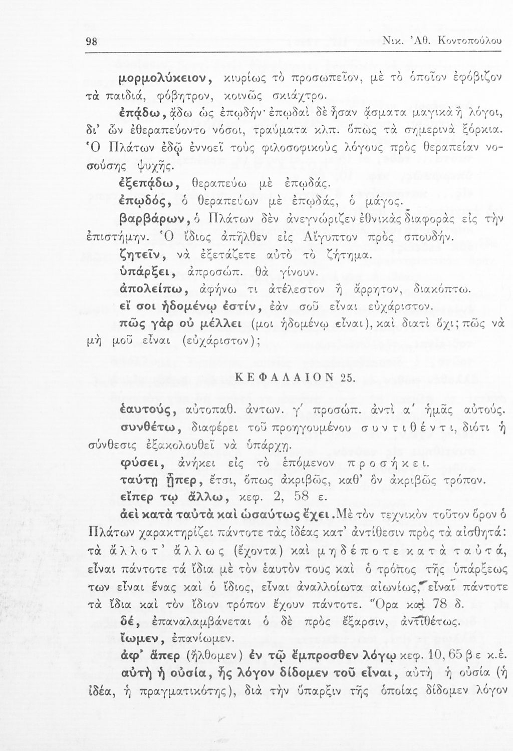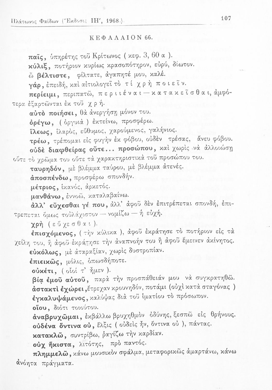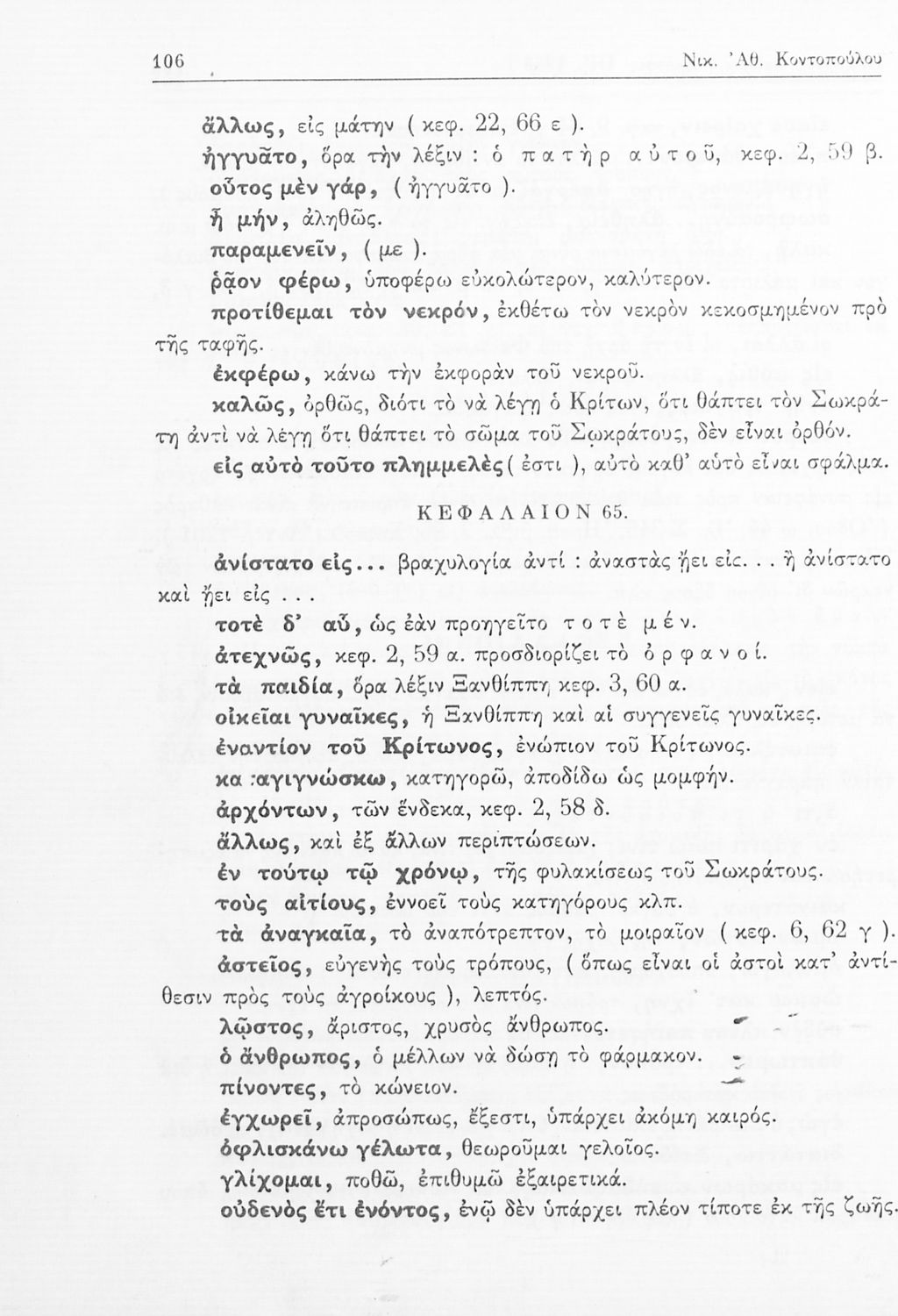 Βαθμίδα εκπαίδευσης: Δευτεροβάθμια Μάθημα: Αρχαία Ελληνικά Γλώσσα: Καθαρεύουσα Παρουσίαση περιεχομένου: Σχολικό εγχειρίδιο Αρχαίων Ελληνικών της Δευτεροβάθμιας Εκπαίδευσης. Το βιβλίο περιέχει δύο έργα του Πλάτωνα, Φαίδων και Πρωταγόρας, όπου ο Σωκράτης συνομιλεί για την έννοια και τις ιδέες της φιλοσοφίας |