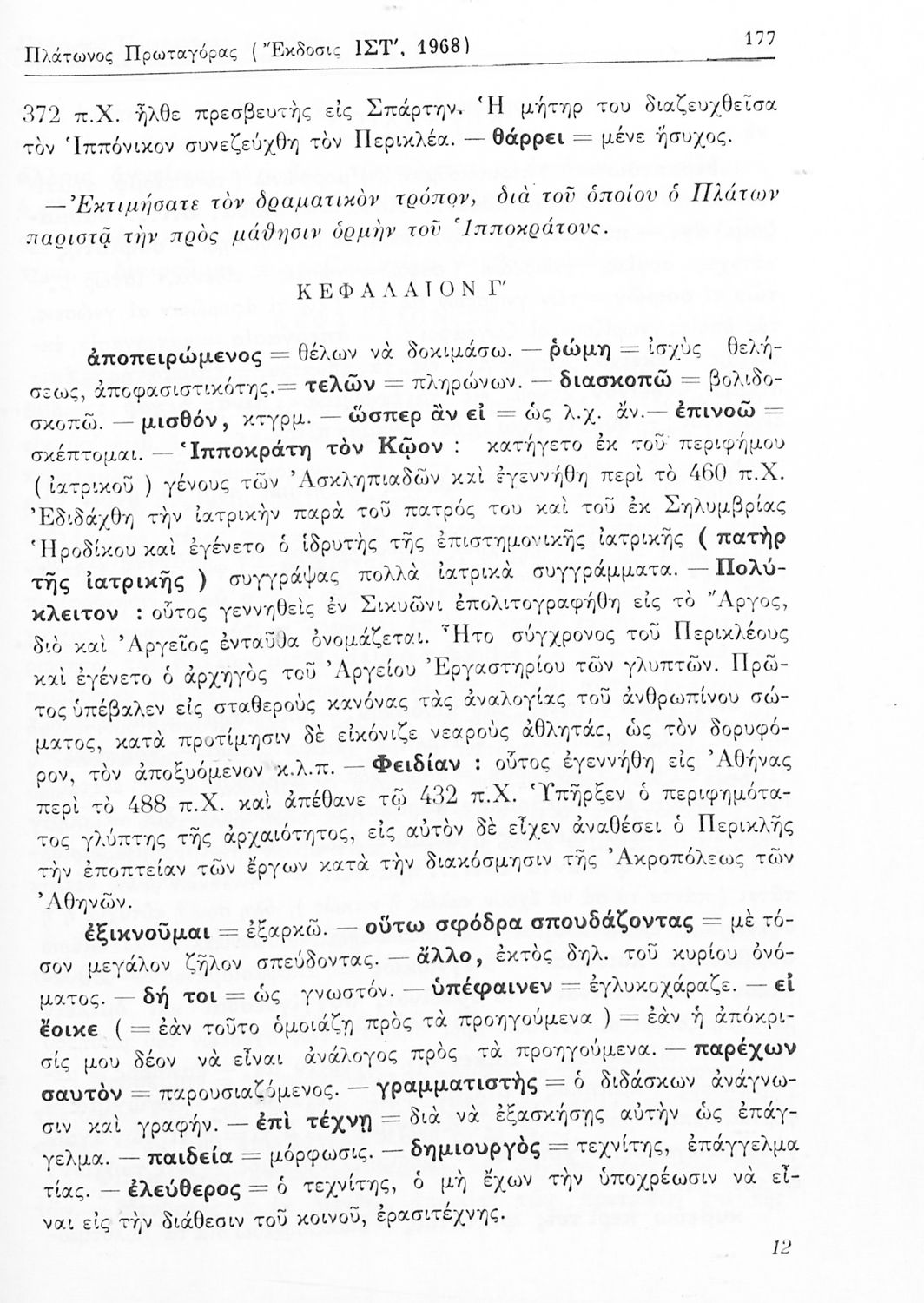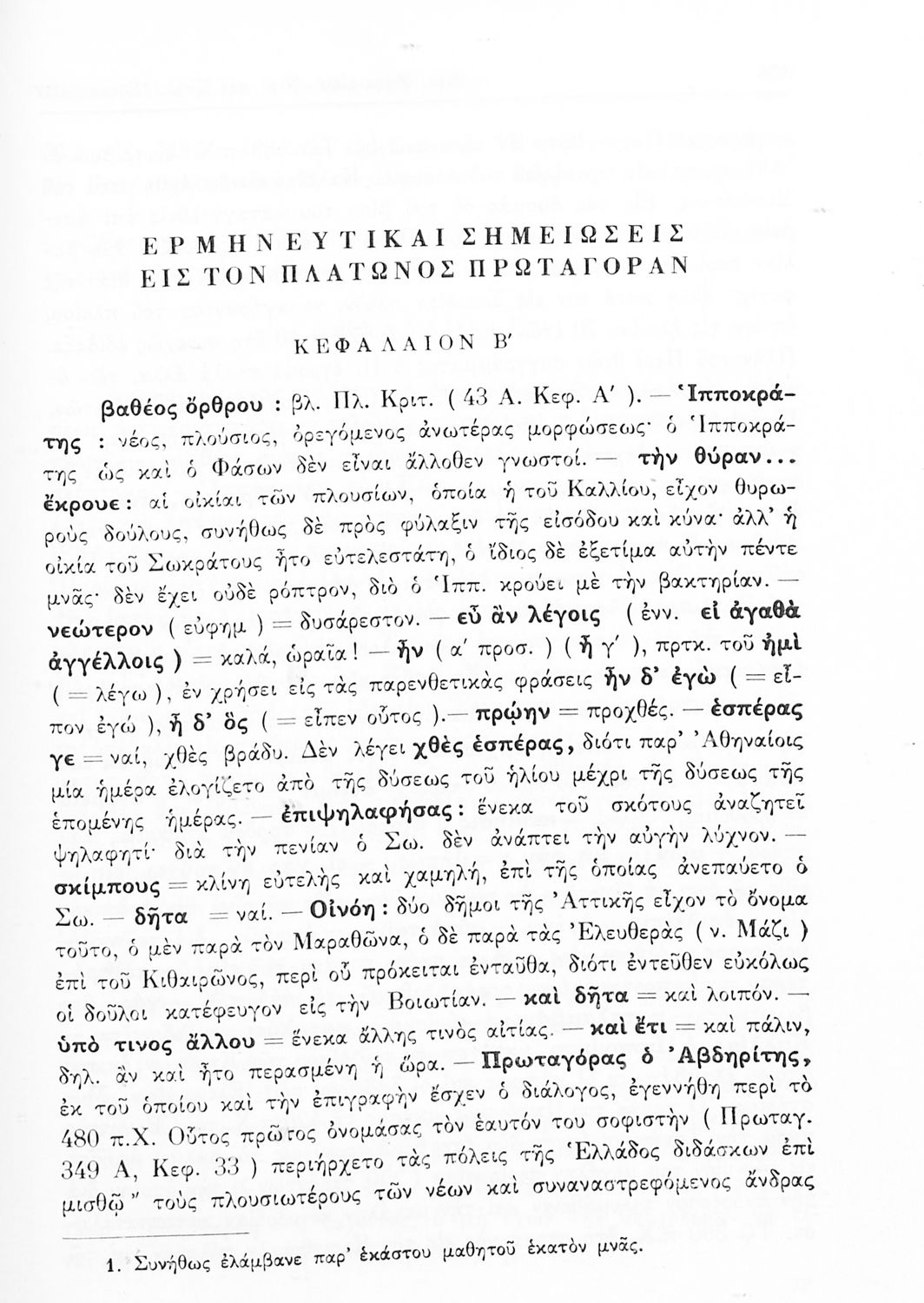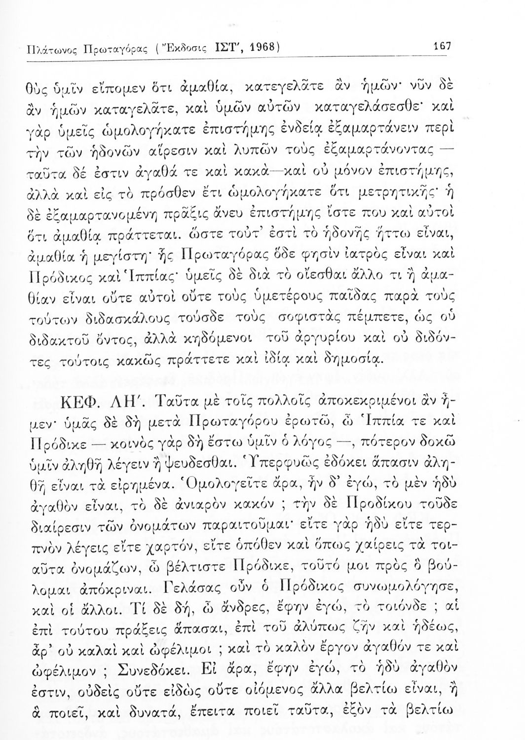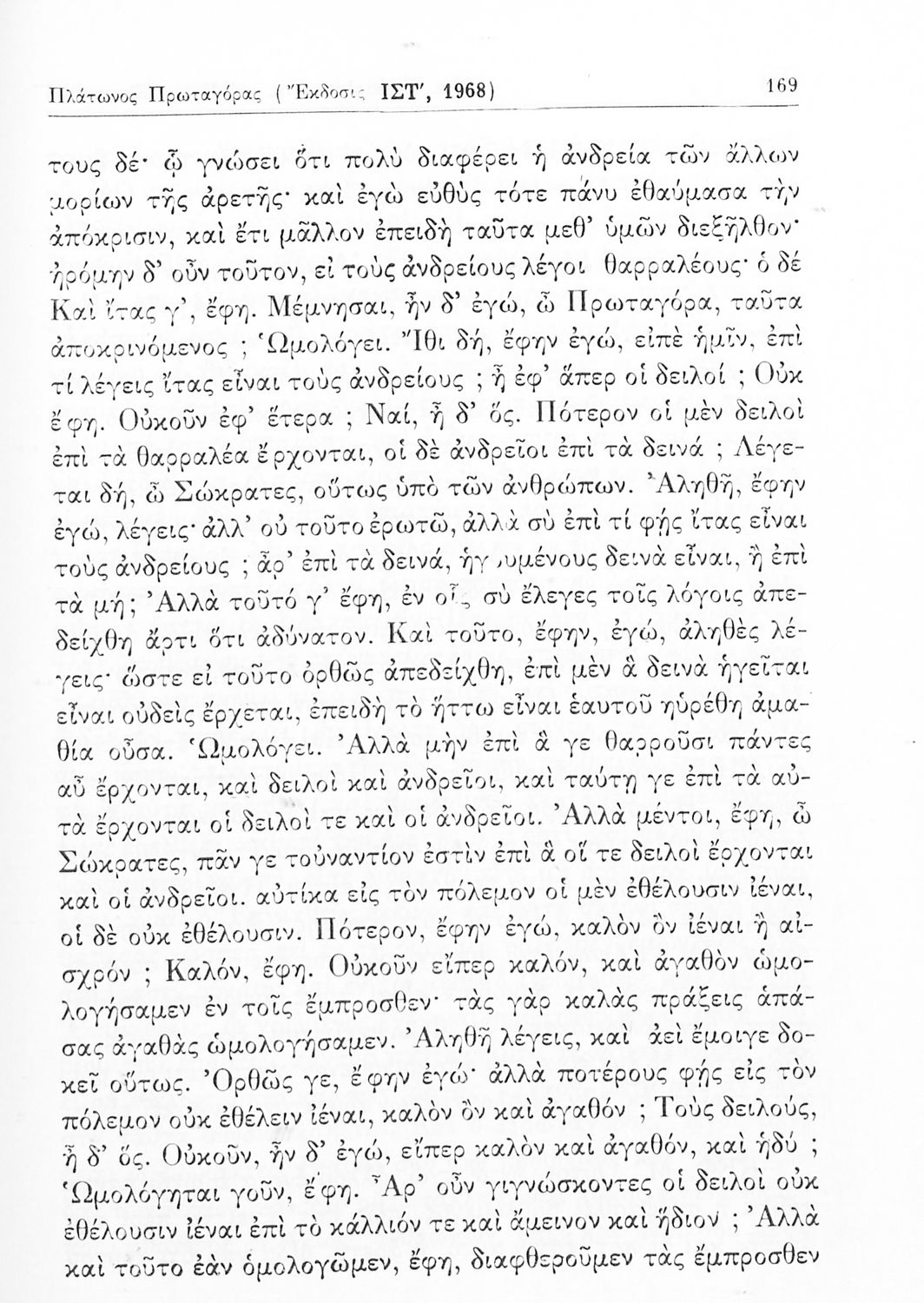 Βαθμίδα εκπαίδευσης: Δευτεροβάθμια Μάθημα: Αρχαία Ελληνικά Γλώσσα: Καθαρεύουσα Παρουσίαση περιεχομένου: Σχολικό εγχειρίδιο Αρχαίων Ελληνικών της Δευτεροβάθμιας Εκπαίδευσης. Το βιβλίο περιέχει δύο έργα του Πλάτωνα, Φαίδων και Πρωταγόρας, όπου ο Σωκράτης συνομιλεί για την έννοια και τις ιδέες της φιλοσοφίας |