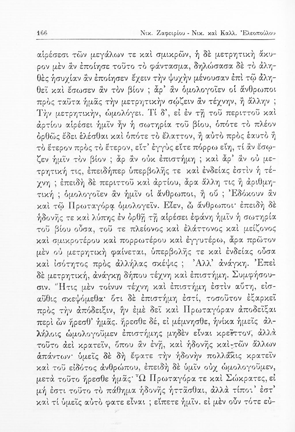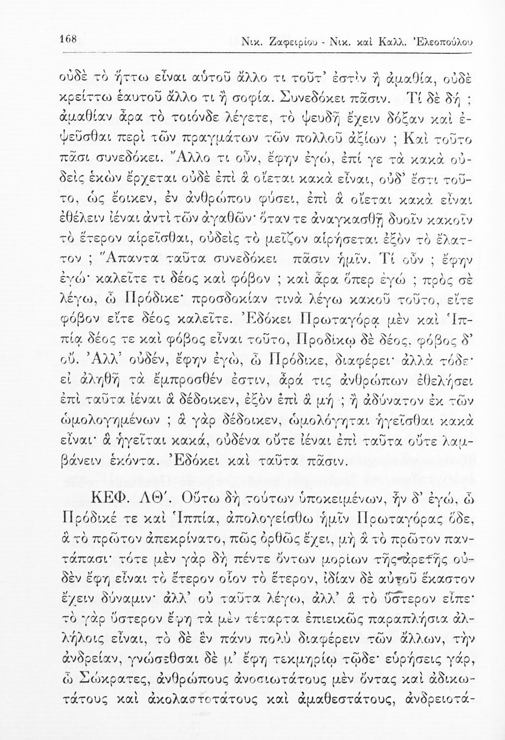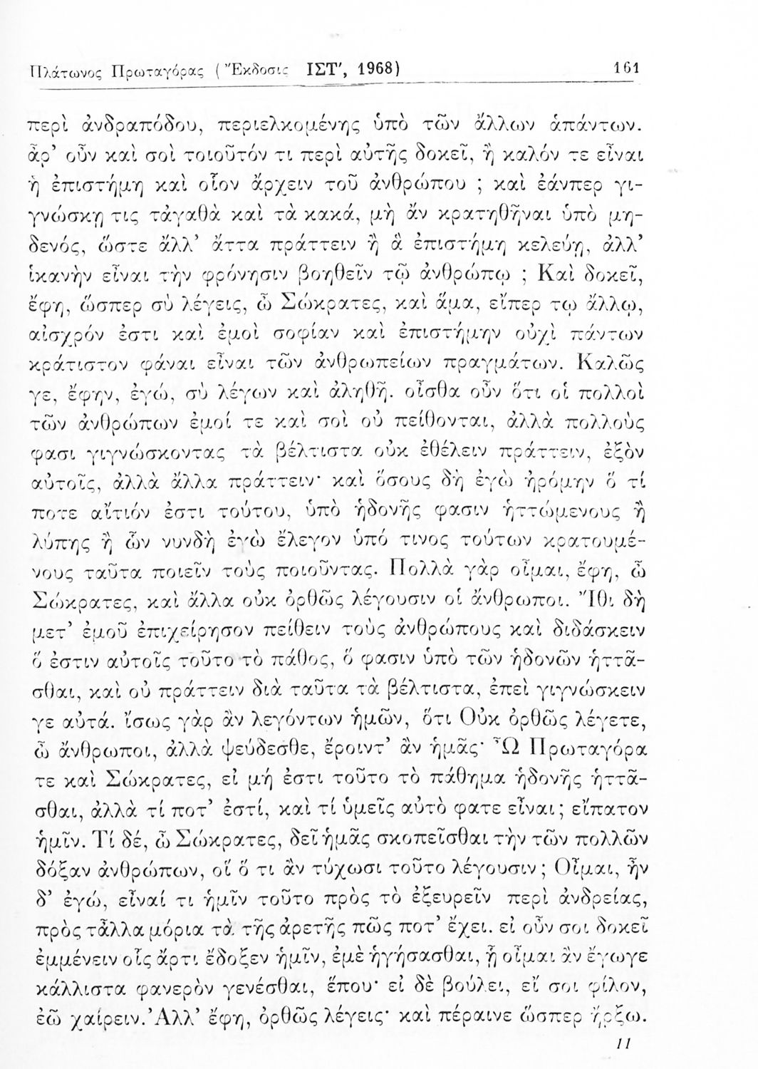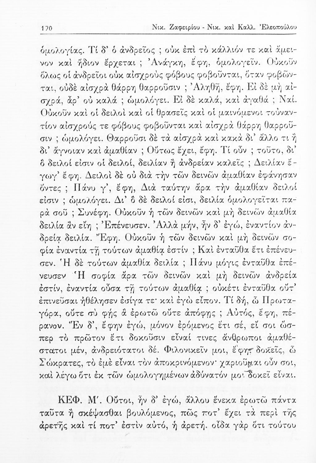 Βαθμίδα εκπαίδευσης: Δευτεροβάθμια Μάθημα: Αρχαία Ελληνικά Γλώσσα: Καθαρεύουσα Παρουσίαση περιεχομένου: Σχολικό εγχειρίδιο Αρχαίων Ελληνικών της Δευτεροβάθμιας Εκπαίδευσης. Το βιβλίο περιέχει δύο έργα του Πλάτωνα, Φαίδων και Πρωταγόρας, όπου ο Σωκράτης συνομιλεί για την έννοια και τις ιδέες της φιλοσοφίας |