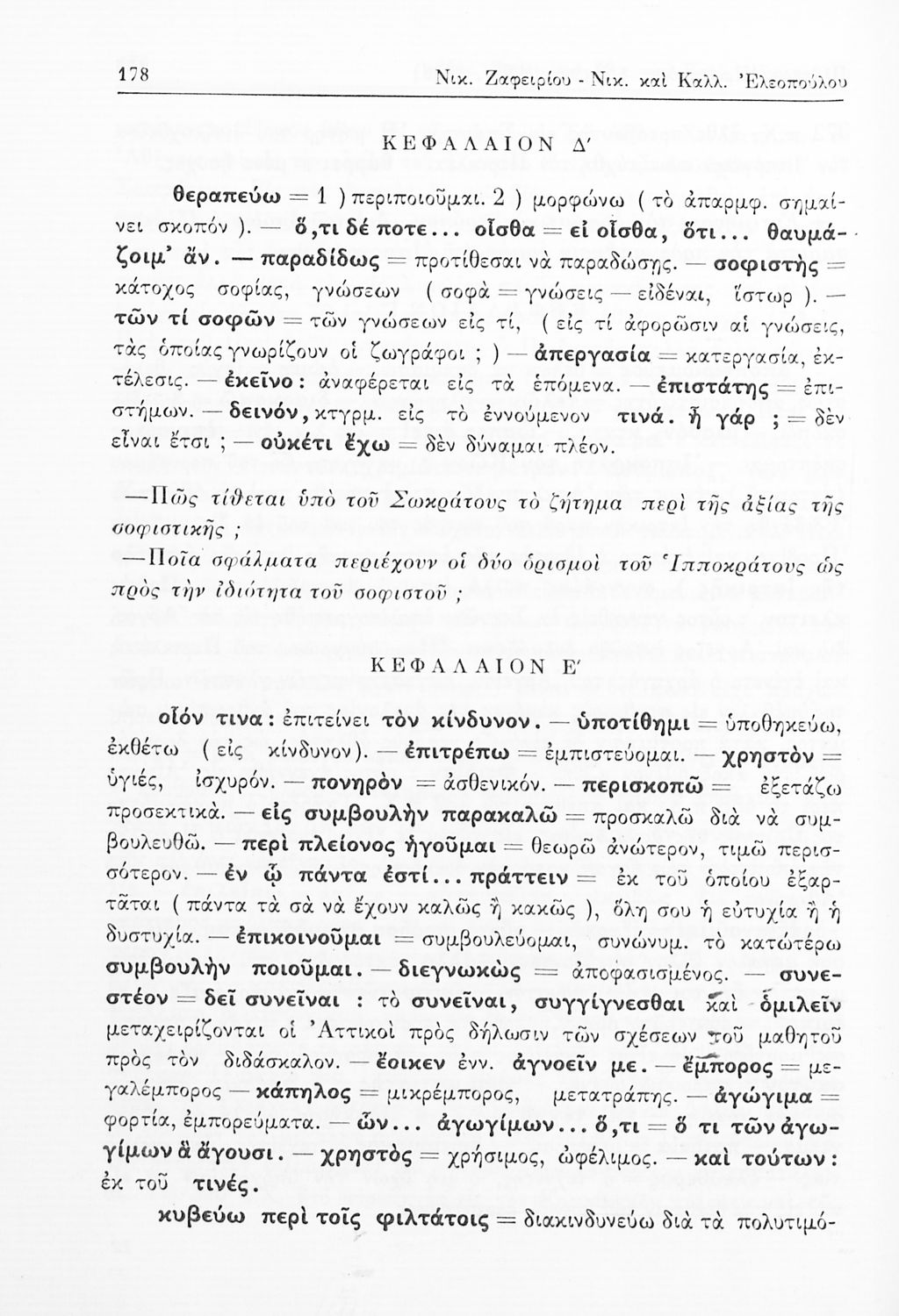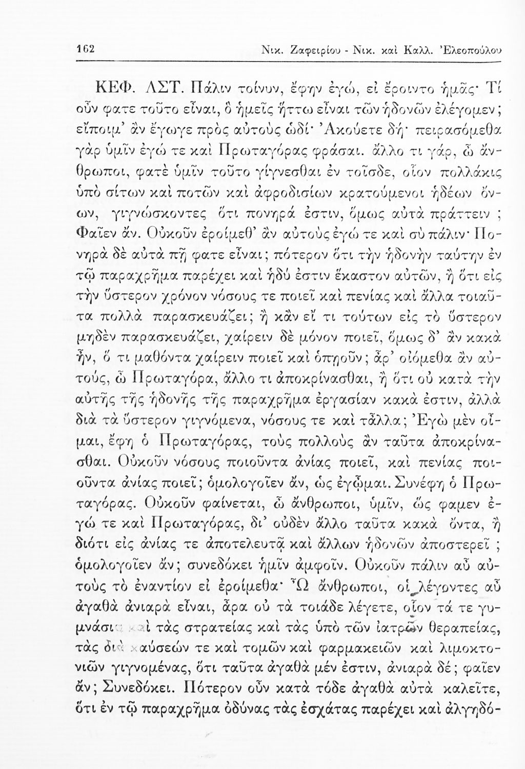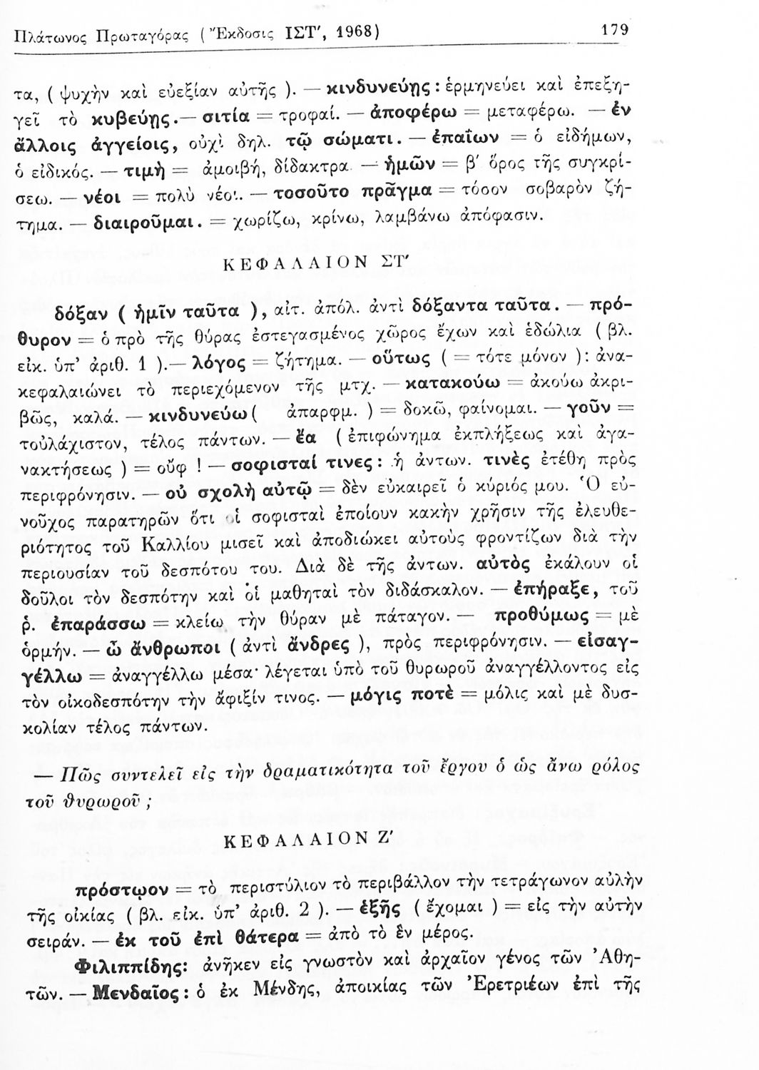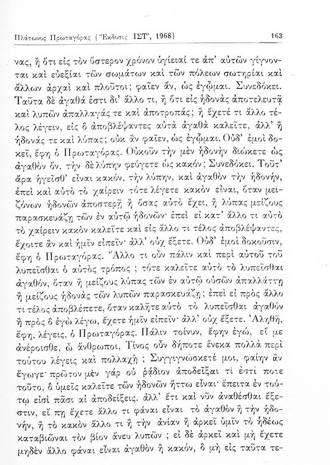 Βαθμίδα εκπαίδευσης: Δευτεροβάθμια Μάθημα: Αρχαία Ελληνικά Γλώσσα: Καθαρεύουσα Παρουσίαση περιεχομένου: Σχολικό εγχειρίδιο Αρχαίων Ελληνικών της Δευτεροβάθμιας Εκπαίδευσης. Το βιβλίο περιέχει δύο έργα του Πλάτωνα, Φαίδων και Πρωταγόρας, όπου ο Σωκράτης συνομιλεί για την έννοια και τις ιδέες της φιλοσοφίας |