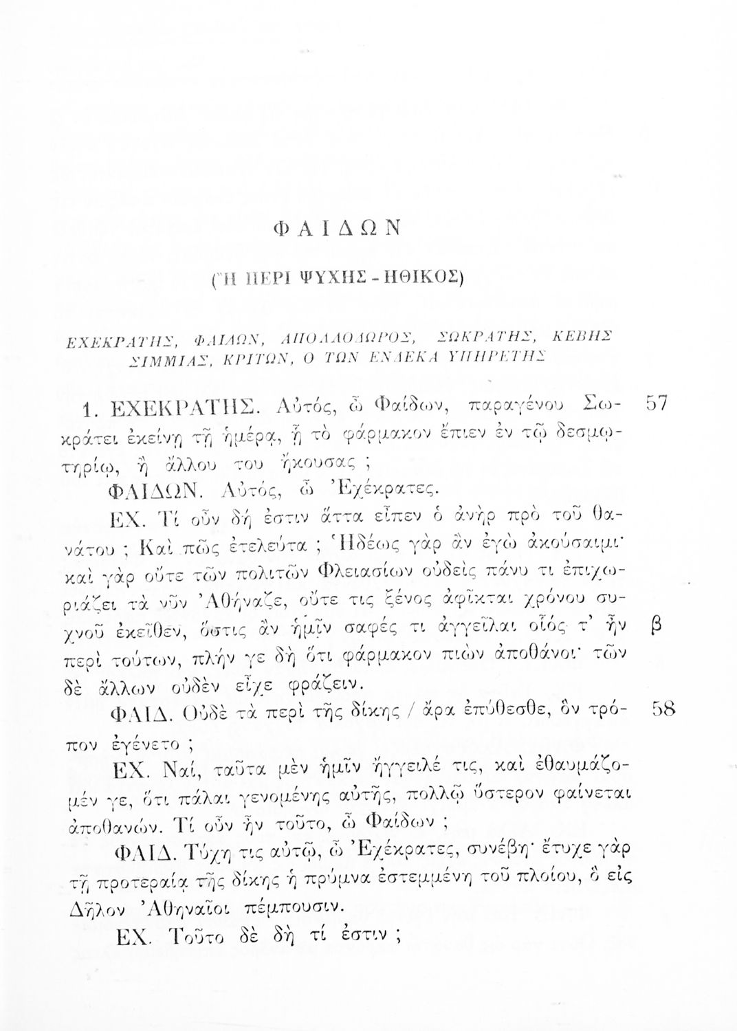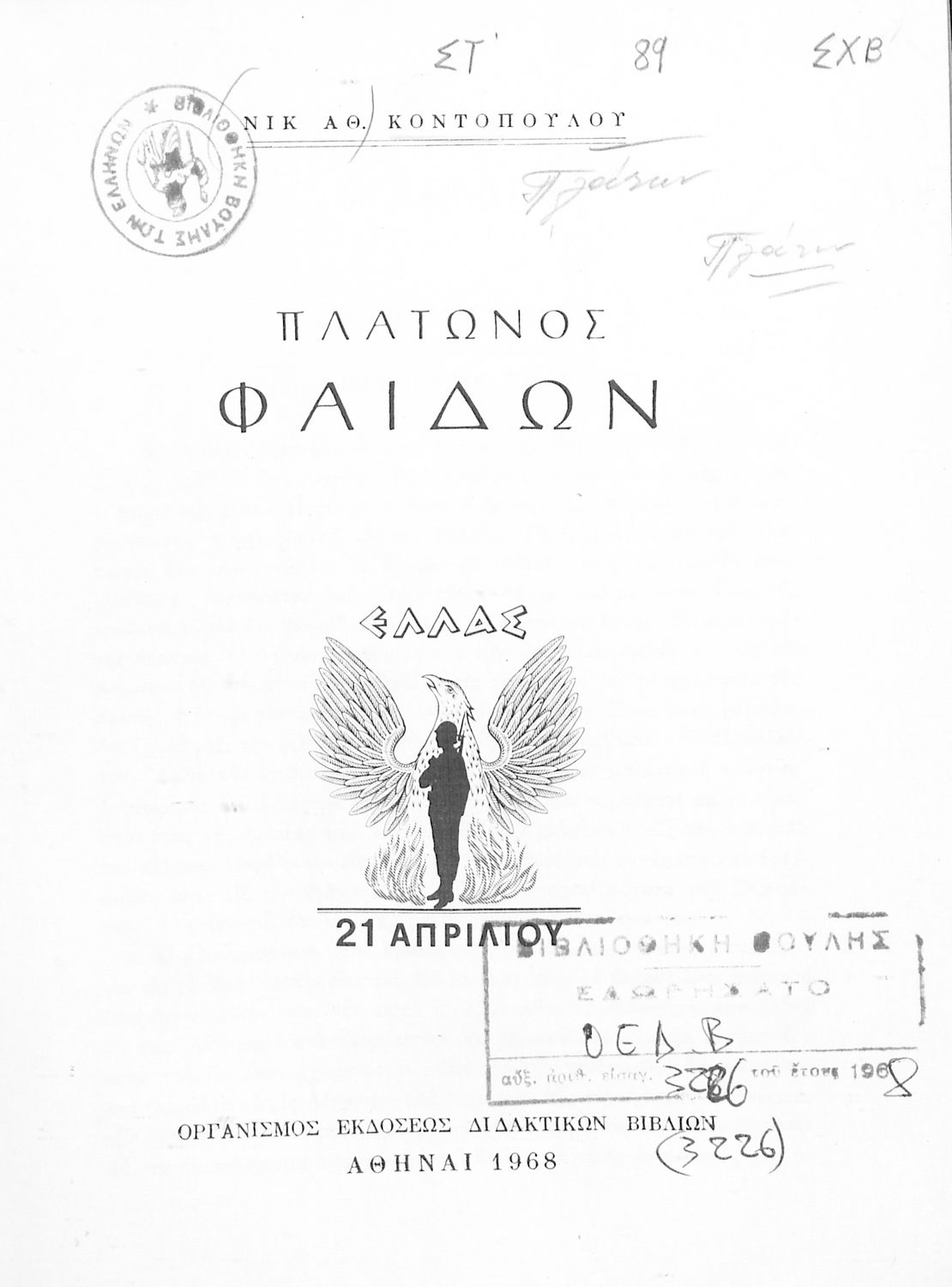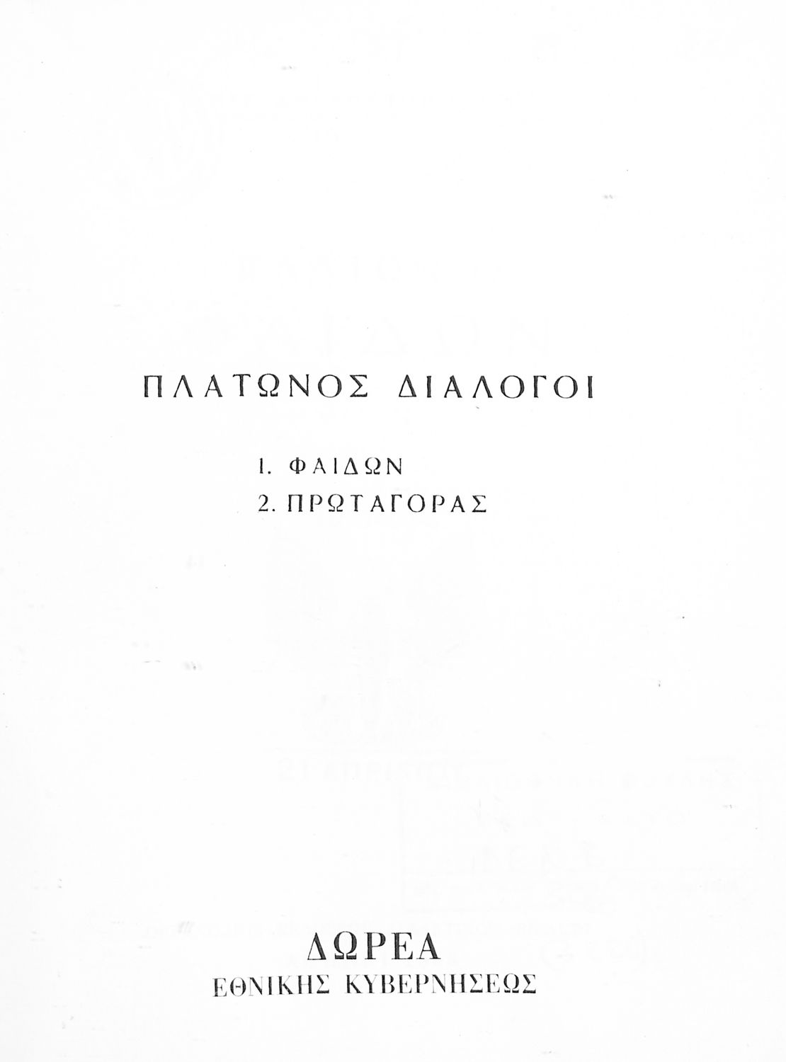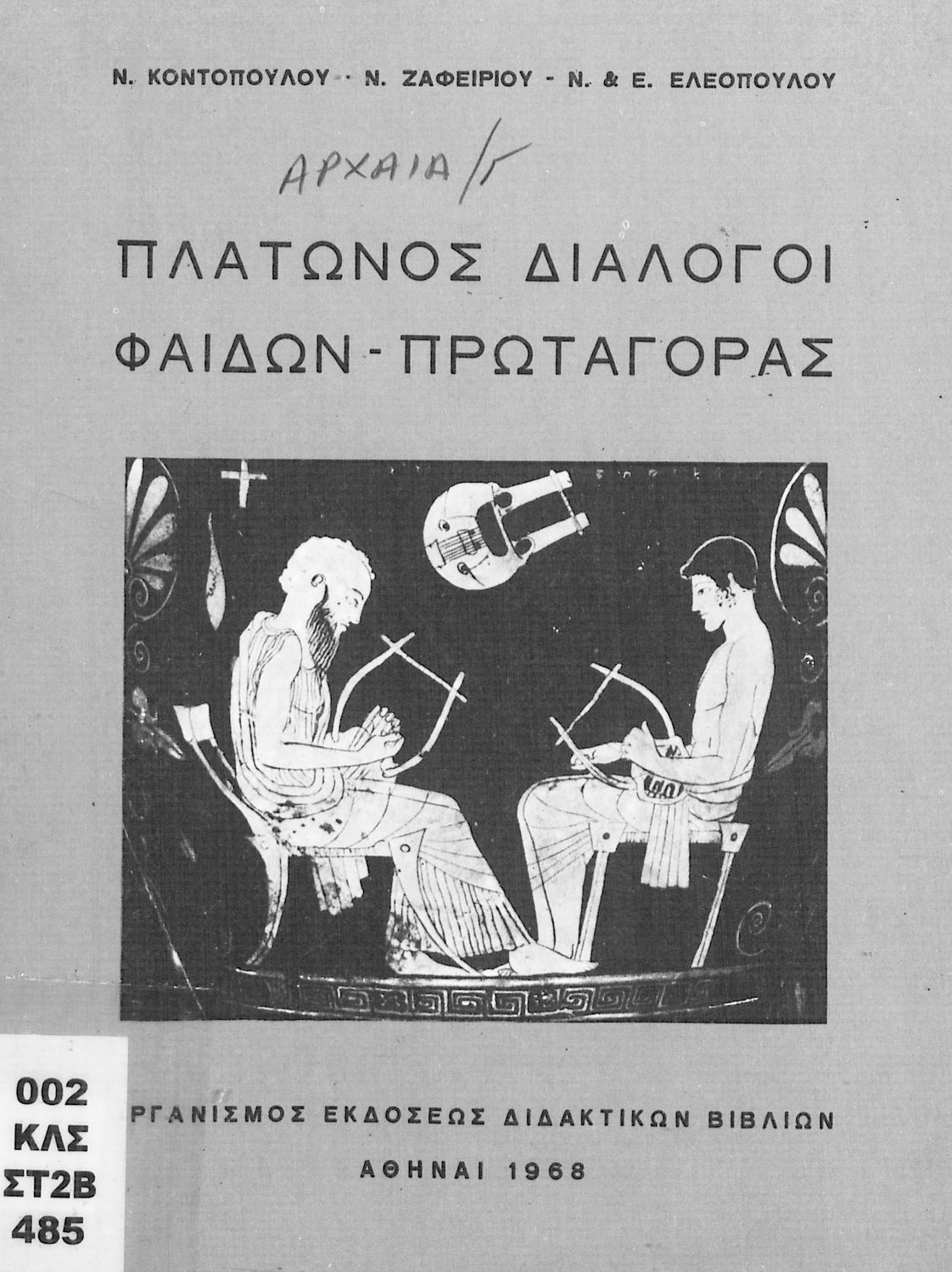 Βαθμίδα εκπαίδευσης: Δευτεροβάθμια Μάθημα: Αρχαία Ελληνικά Γλώσσα: Καθαρεύουσα Παρουσίαση περιεχομένου: Σχολικό εγχειρίδιο Αρχαίων Ελληνικών της Δευτεροβάθμιας Εκπαίδευσης. Το βιβλίο περιέχει δύο έργα του Πλάτωνα, Φαίδων και Πρωταγόρας, όπου ο Σωκράτης συνομιλεί για την έννοια και τις ιδέες της φιλοσοφίας |