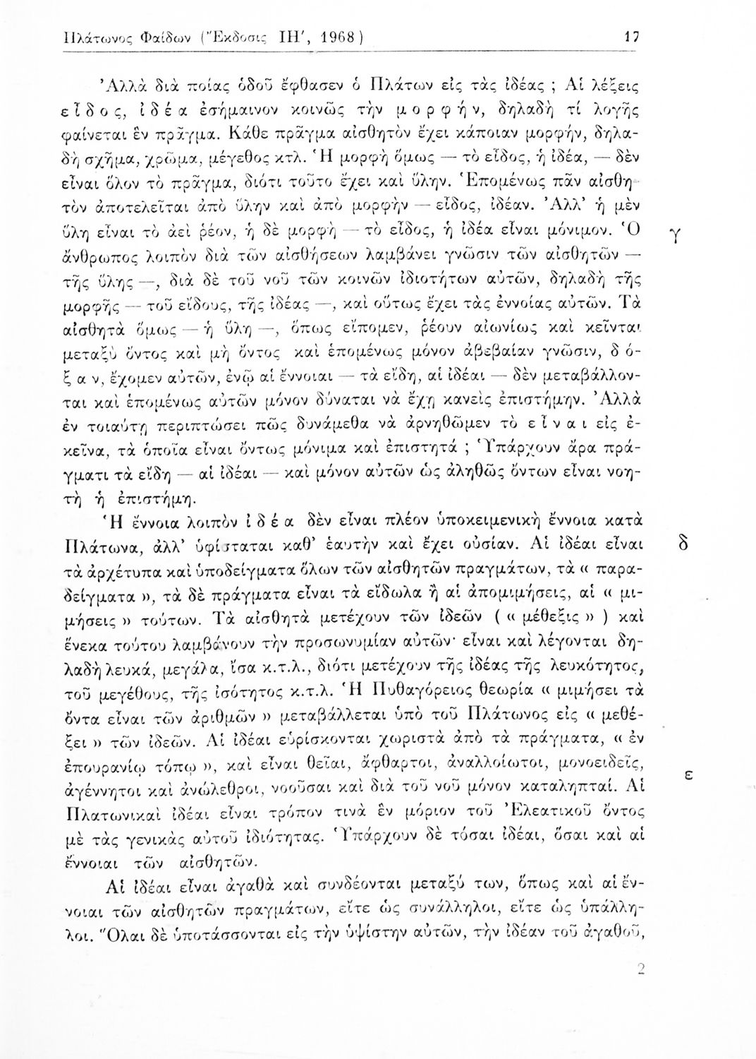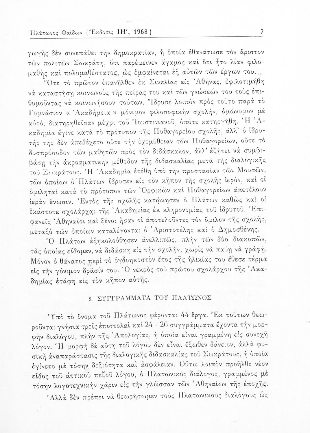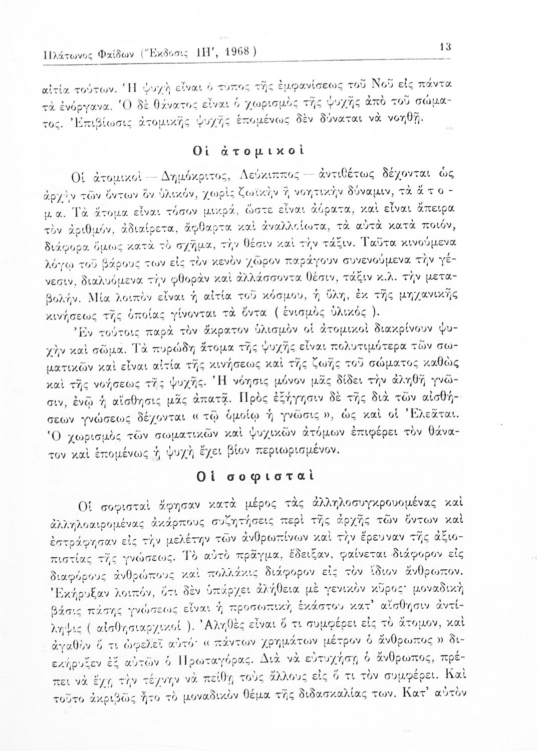 Βαθμίδα εκπαίδευσης: Δευτεροβάθμια Μάθημα: Αρχαία Ελληνικά Γλώσσα: Καθαρεύουσα Παρουσίαση περιεχομένου: Σχολικό εγχειρίδιο Αρχαίων Ελληνικών της Δευτεροβάθμιας Εκπαίδευσης. Το βιβλίο περιέχει δύο έργα του Πλάτωνα, Φαίδων και Πρωταγόρας, όπου ο Σωκράτης συνομιλεί για την έννοια και τις ιδέες της φιλοσοφίας |