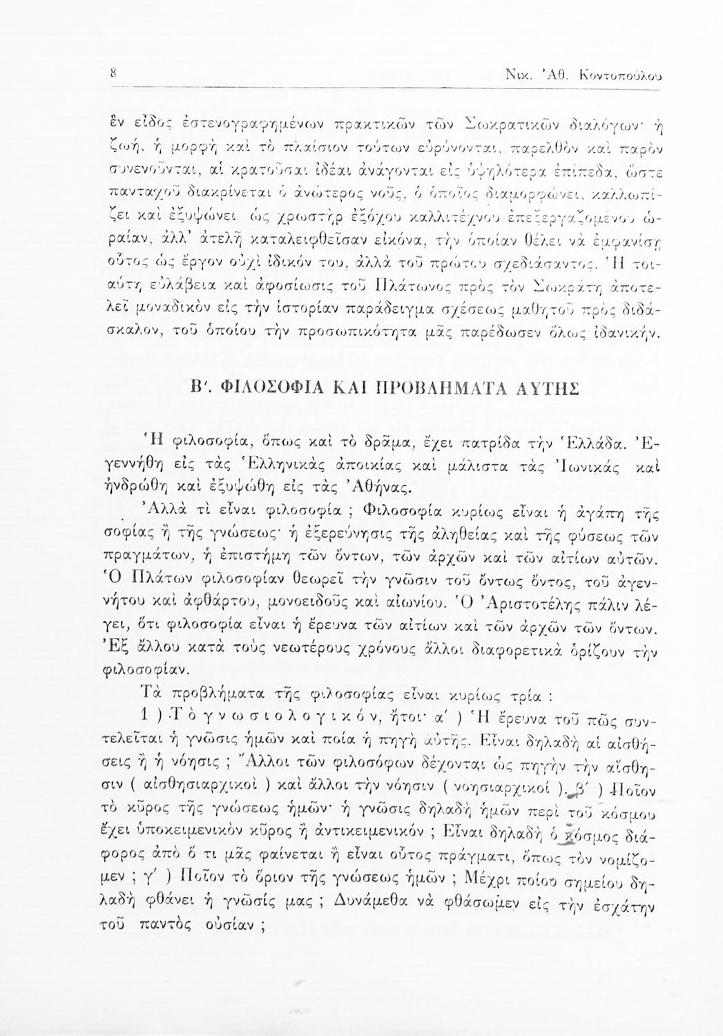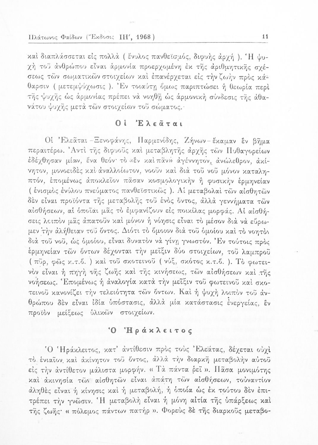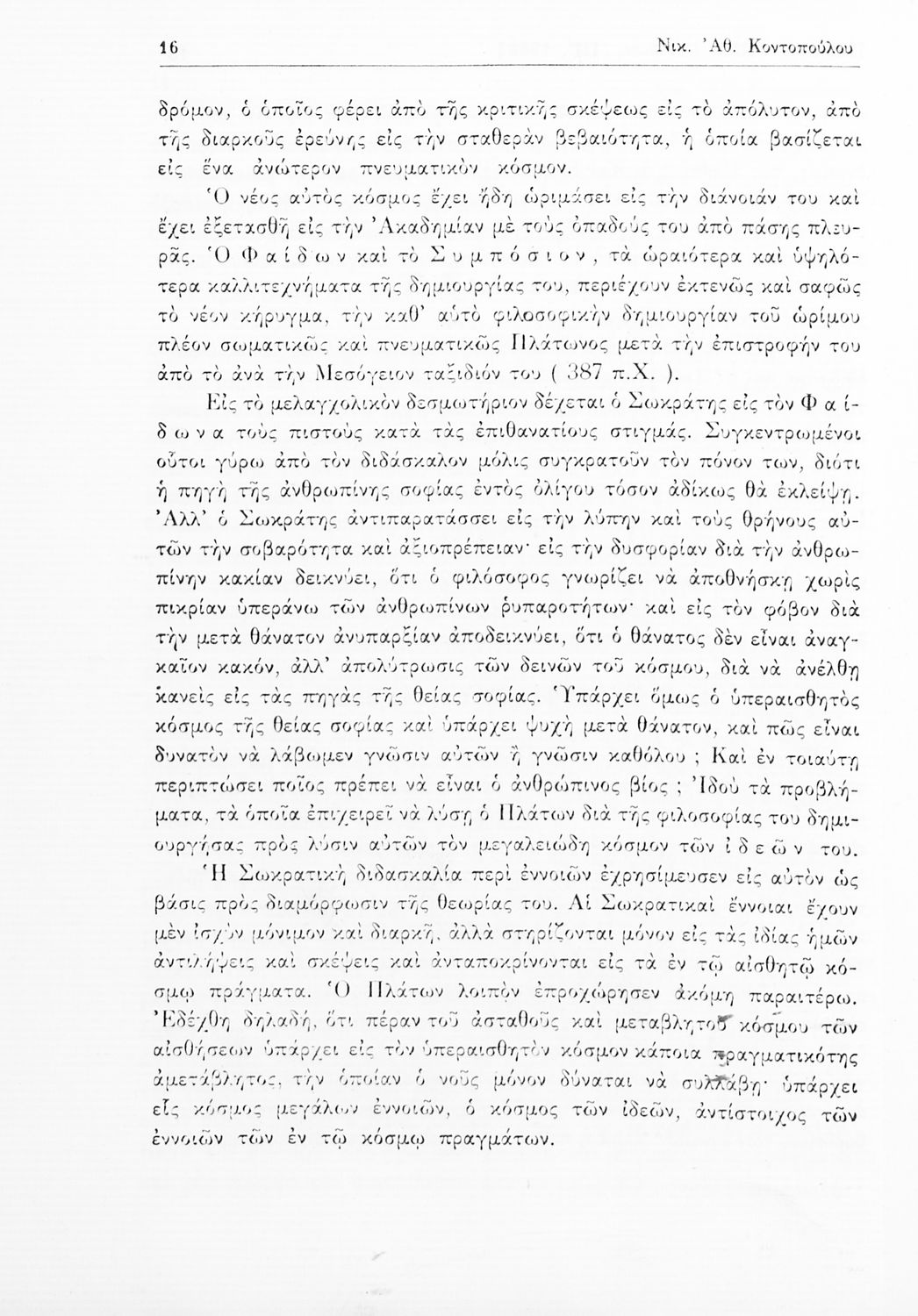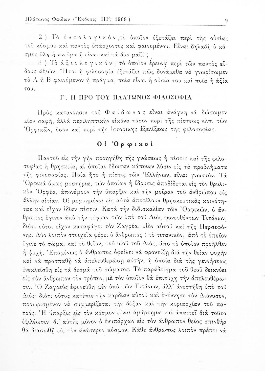 Βαθμίδα εκπαίδευσης: Δευτεροβάθμια Μάθημα: Αρχαία Ελληνικά Γλώσσα: Καθαρεύουσα Παρουσίαση περιεχομένου: Σχολικό εγχειρίδιο Αρχαίων Ελληνικών της Δευτεροβάθμιας Εκπαίδευσης. Το βιβλίο περιέχει δύο έργα του Πλάτωνα, Φαίδων και Πρωταγόρας, όπου ο Σωκράτης συνομιλεί για την έννοια και τις ιδέες της φιλοσοφίας |